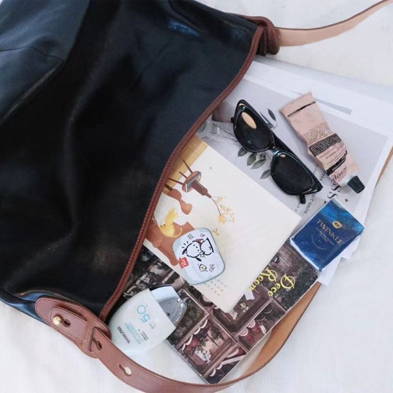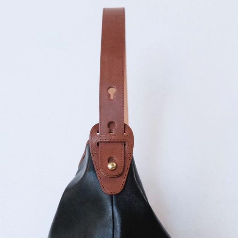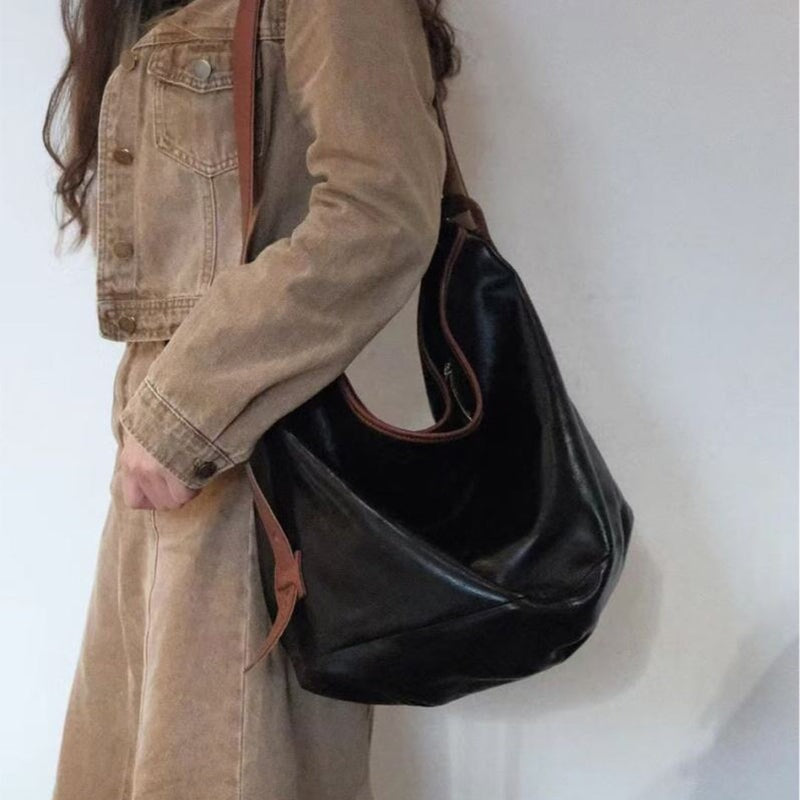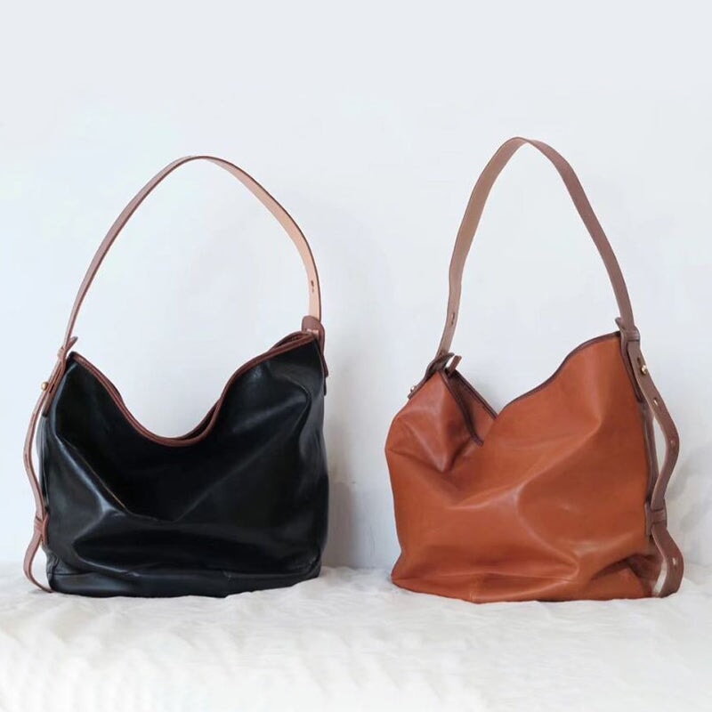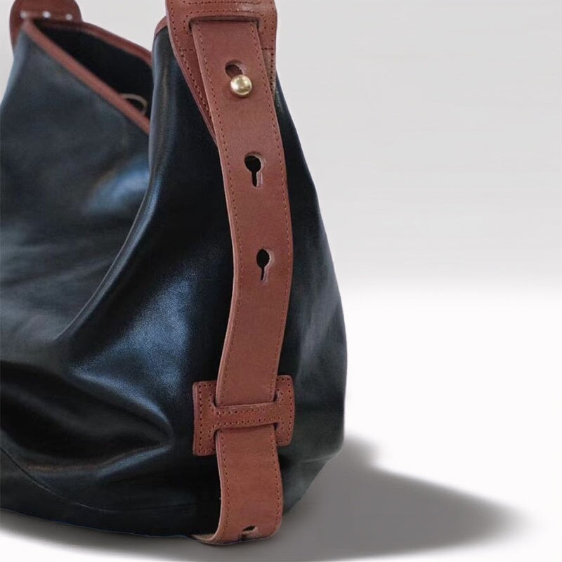 Vegetable-Tanned Leather Bucket Bag Stylish Slouchy Shoulder & Handbag in Black/Honey Brown