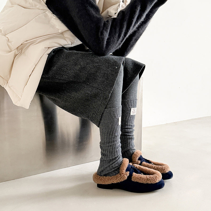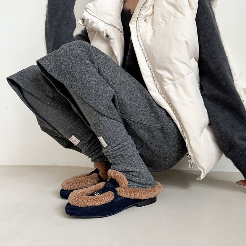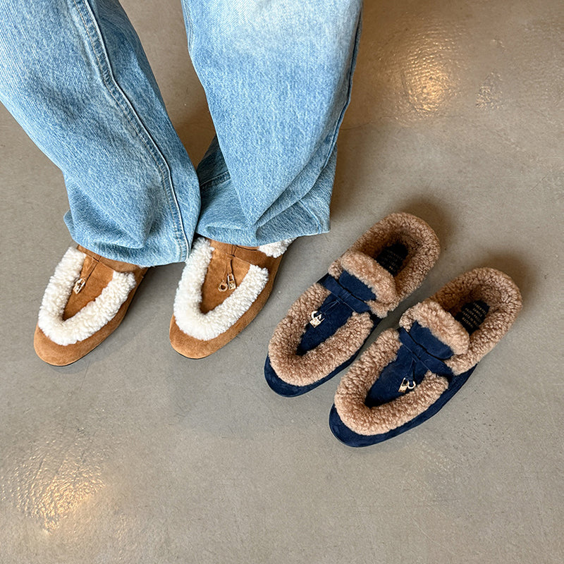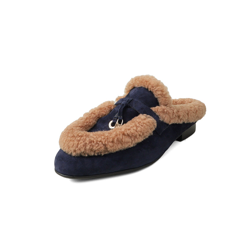 Sheepskin Suede Furry Backless Loafers Winter Shaggy Flat Mules Slippers in Dark Brown/Dark Blue