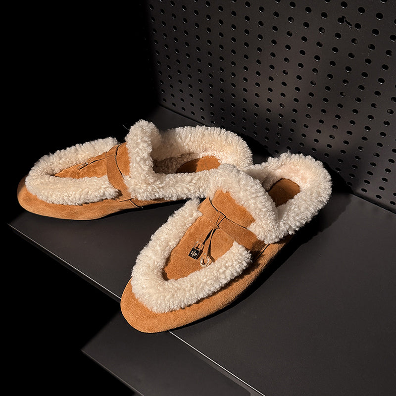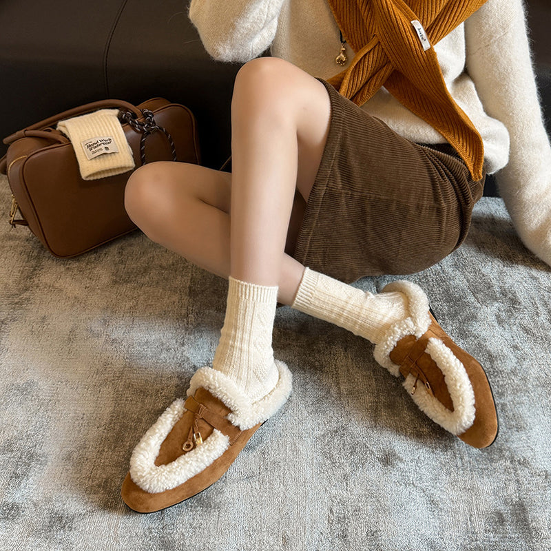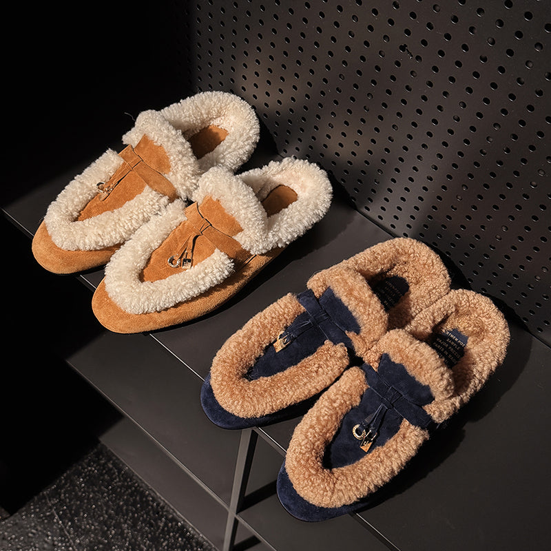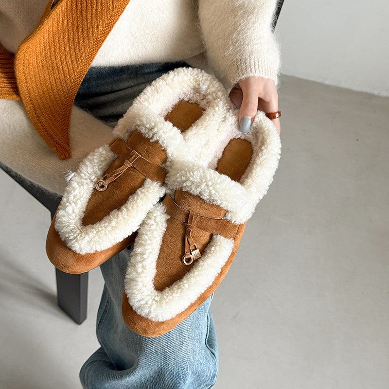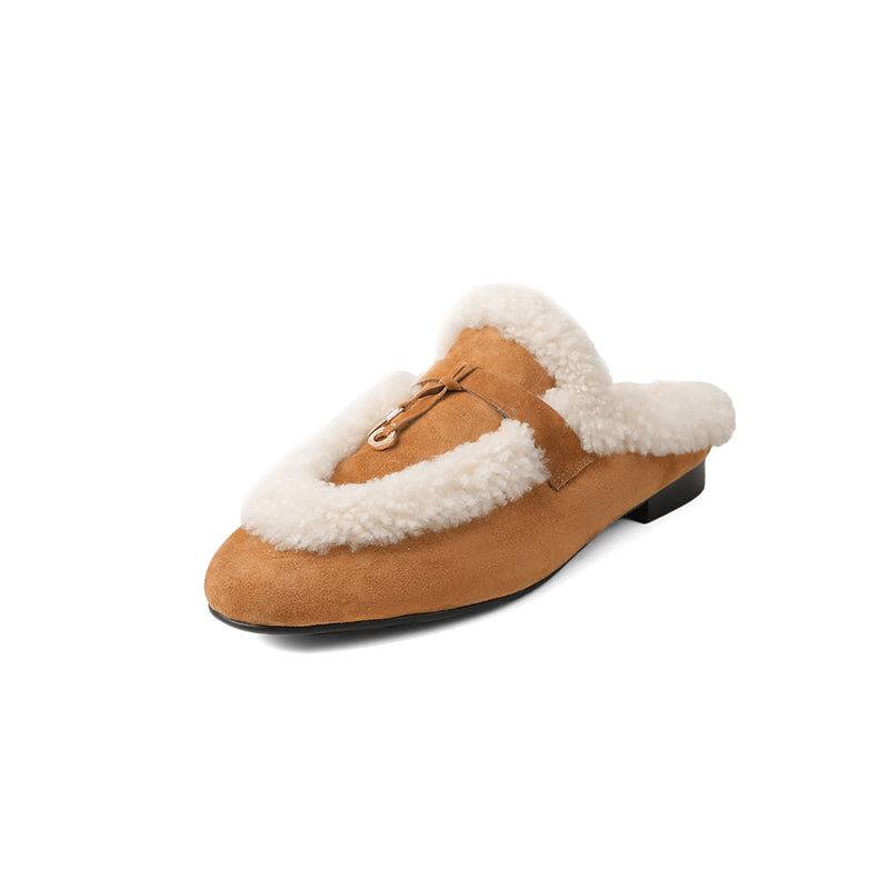 Stay warm and stylish this winter with these cozy women’s backless loafers, crafted from premium sheepskin suede leather for a soft and refined look. Designed with a plush shaggy fleece lining, these winter mules deliver exceptional warmth and comfort, making them perfect for chilly days. The round toe and soft flat sole create an easy, relaxed fit, while the mini block heel adds subtle support. Finished with a durable rubber outsole, these furry slip-on slippers are ideal for indoor lounging or casual outdoor wear, offering both softness and seasonal style.