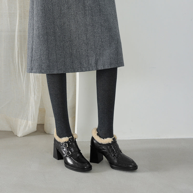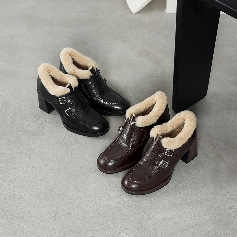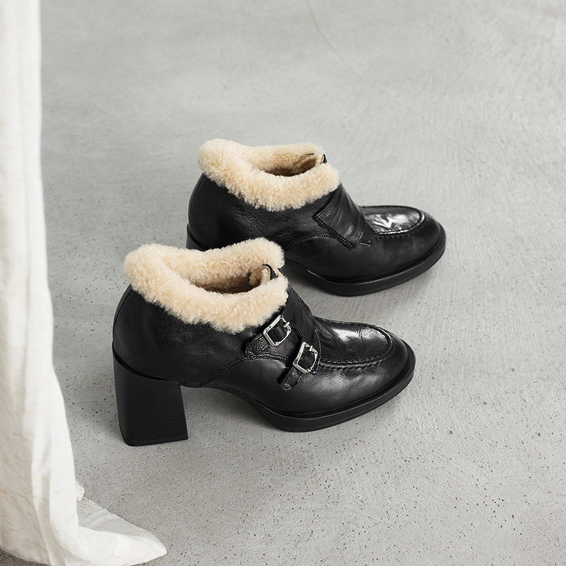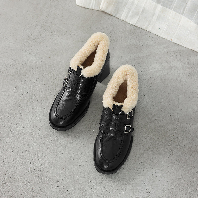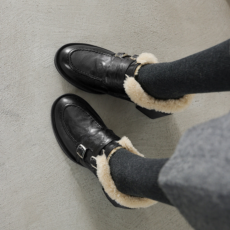 Designed with a rounded toe and a stable 70mm block heel, this monk strap loafers offer an elegant lift while remaining easy to walk in. Crafted from premium sheepskin leather, the upper delivers both structure and warmth. The interior features long plush lining and feet pads with lambswool lining for insulation in cold weather. Perfect for winter outfits, these shaggy block heel pumps blend timeless sophistication with modern comfort for work or casual wear.