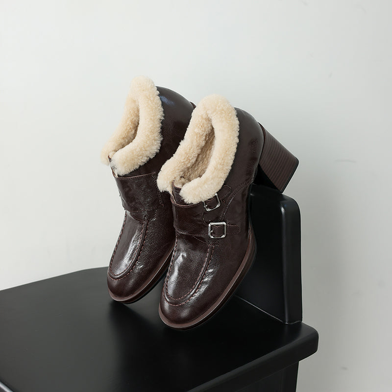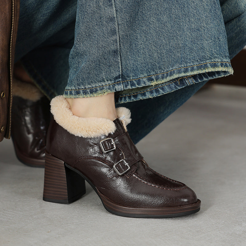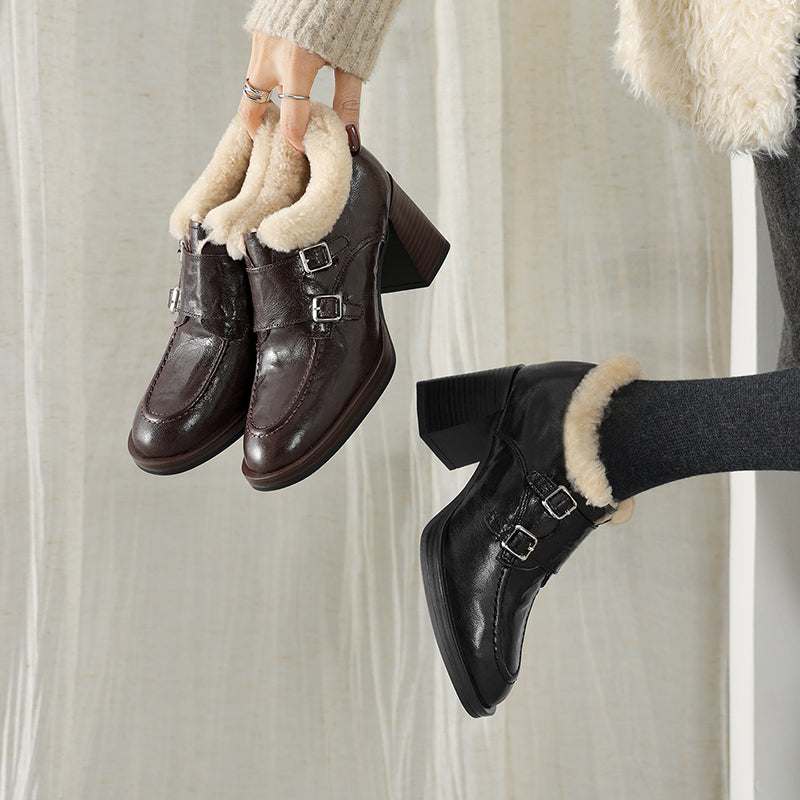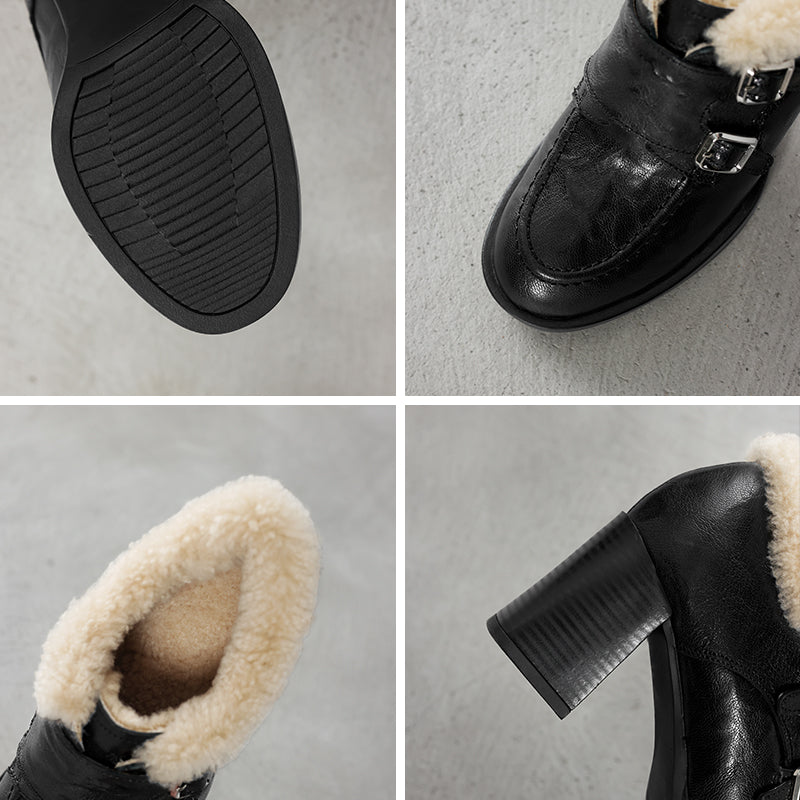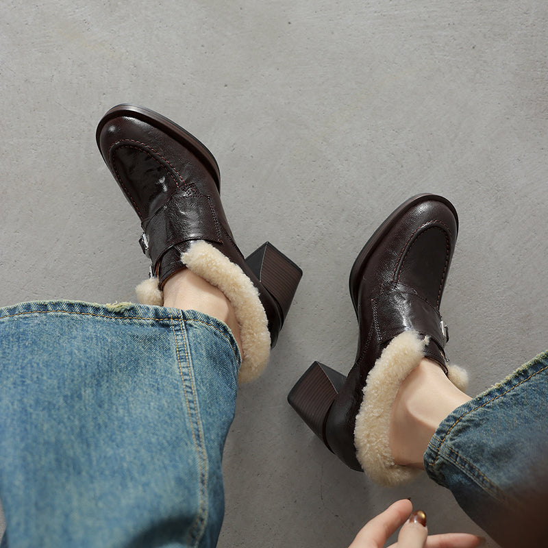 Designed with a rounded toe and a stable 70mm block heel, this monk strap loafers offer an elegant lift while remaining easy to walk in. Crafted from premium sheepskin leather, the upper delivers both structure and warmth. The interior features long plush lining and feet pads with lambswool lining for insulation in cold weather. Perfect for winter outfits, these shaggy block heel pumps blend timeless sophistication with modern comfort for work or casual wear.