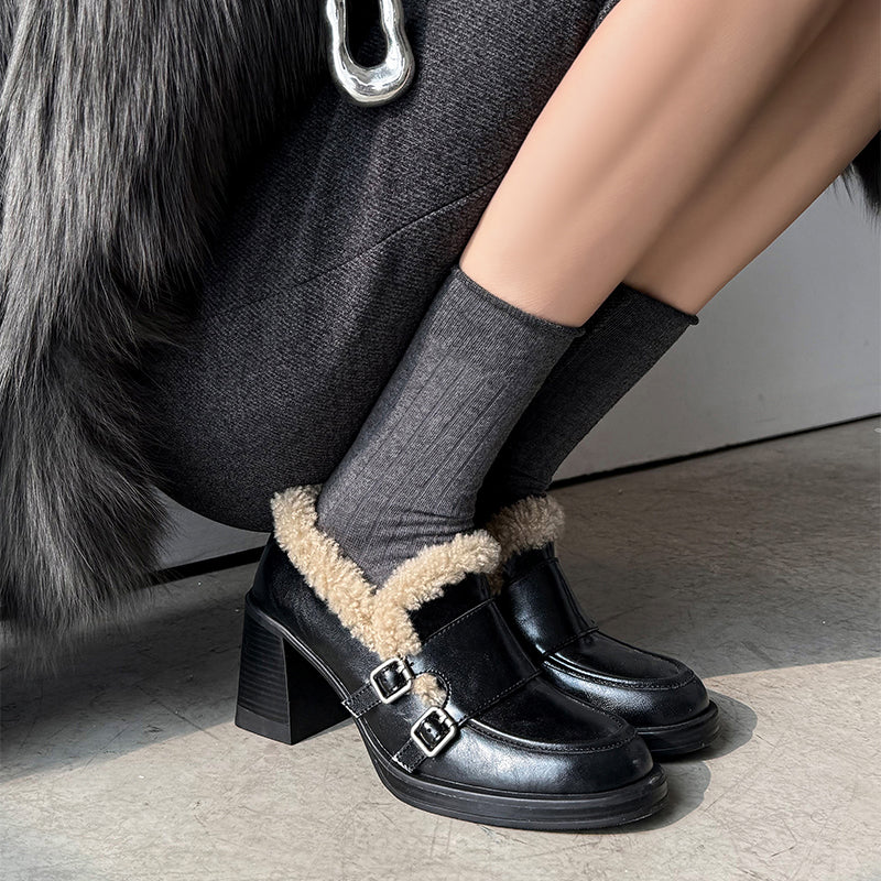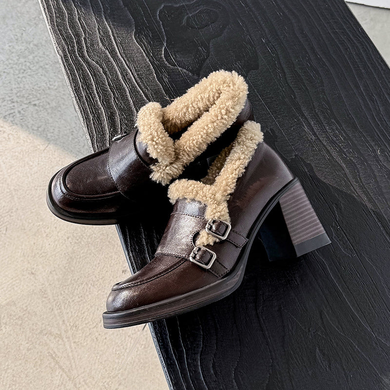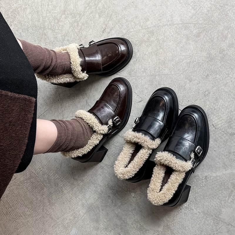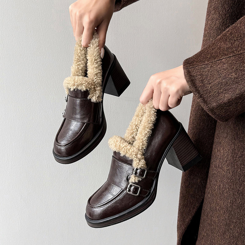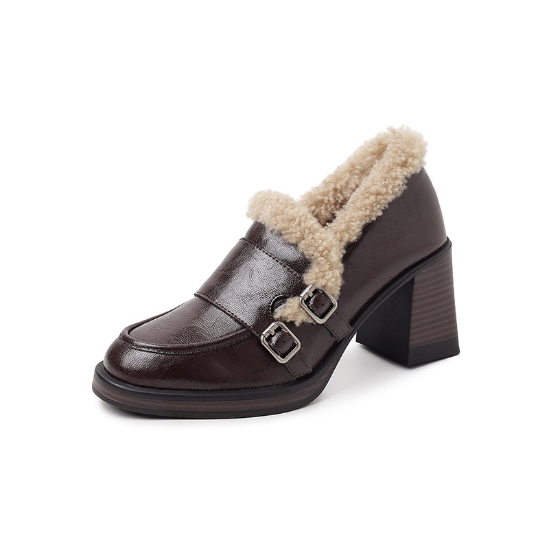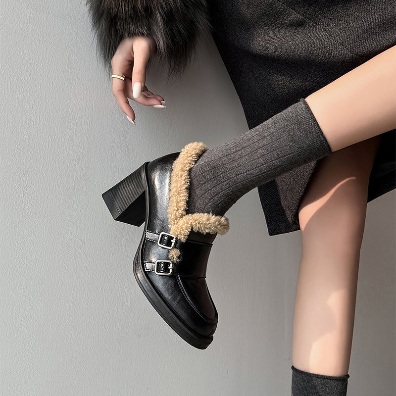 Designed with a rounded toe and a stable 75mm block heel, this monk strap loafers offer an elegant lift while remaining easy to walk in. Crafted from premium cow leather and trimmed with soft lamb fleece, the upper delivers both structure and warmth. The interior features plush faux-fur lining for insulation in cold weather. Perfect for winter outfits, these shaggy block heel pumps blend timeless sophistication with modern comfort for work or casual wear.