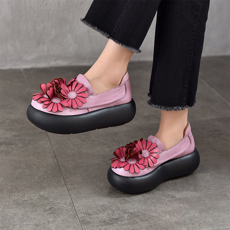 These elegant slip-on floral loafers feature a feminine 3D flower design on premium top layer cow leather, making them both stylish and unique. The round toe shape and soft construction offer natural comfort, while the lightweight rubber foam platform provides a stable 55mm height boost without adding pressure to the feet. Designed for effortless wear, these platform loafers combine softness, durability, and chic aesthetics—perfect for daily outfits, work styling, or dressy casual looks. A beautiful blend of elegance and comfort for women who want standout shoes they can wear all day.