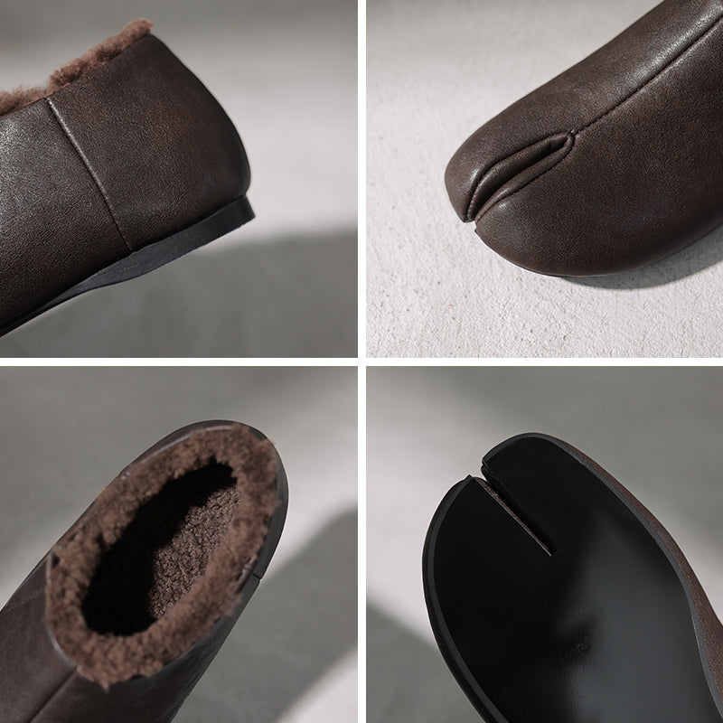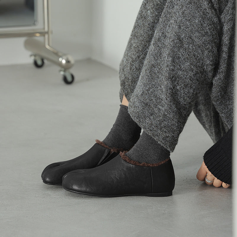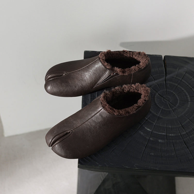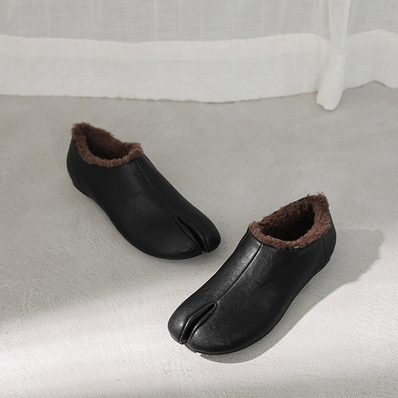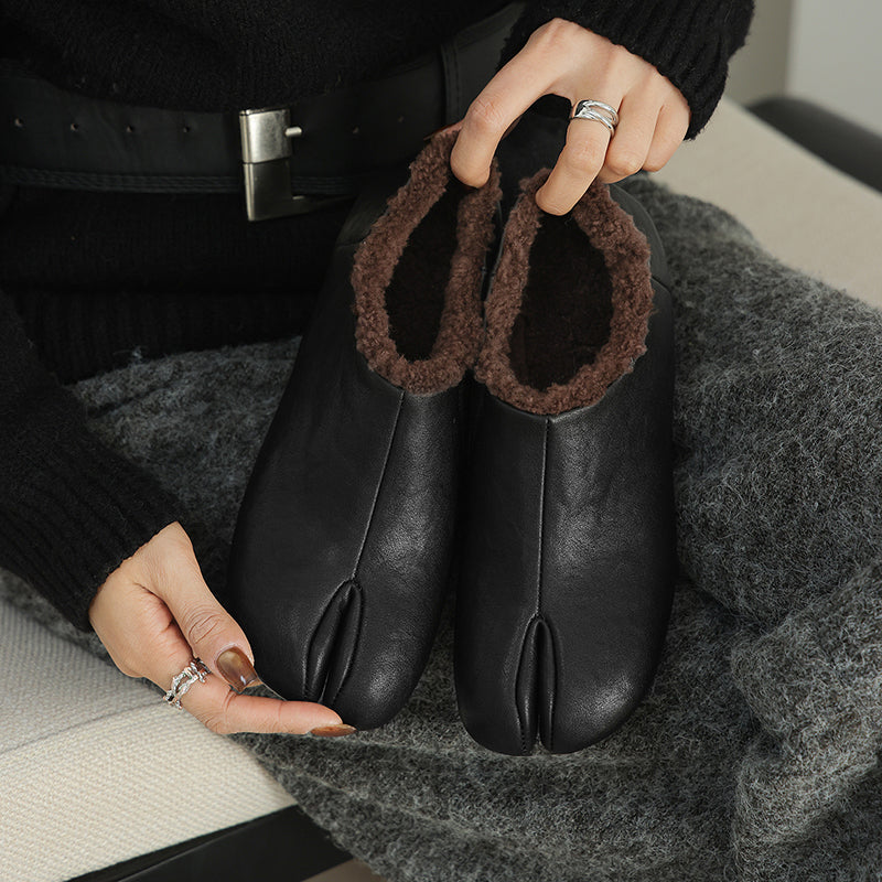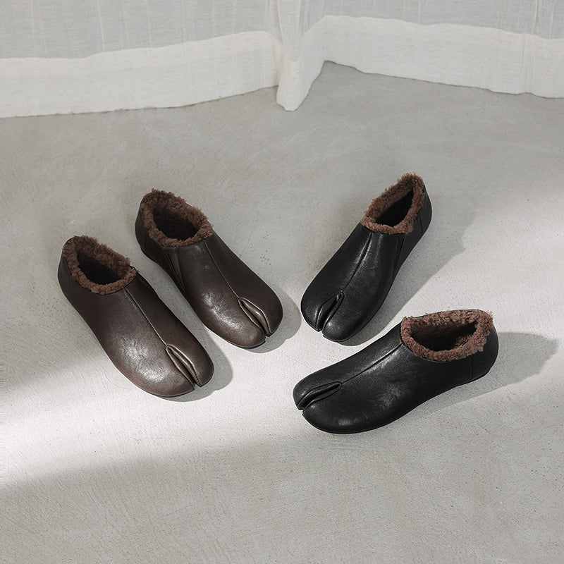Women’s Cow Leather Split Toe Tabi Flats Fleece Lined Casual Shoes in Black/Brown