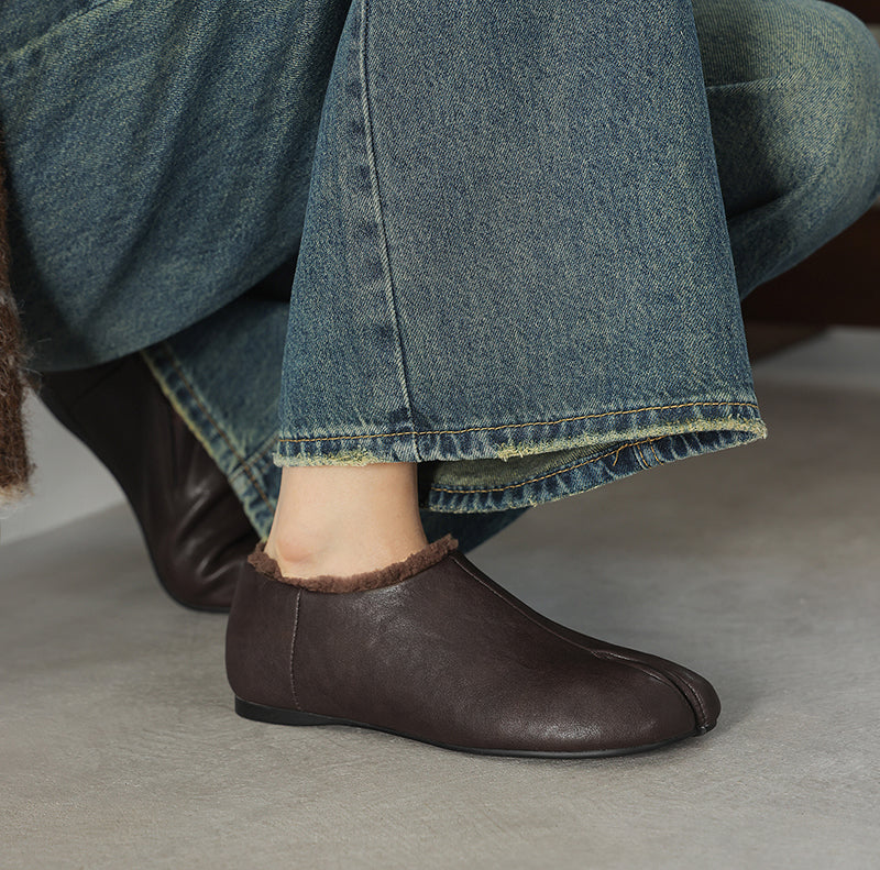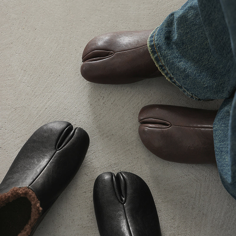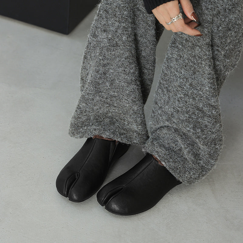 Inspired by classic Tabi shoes, these women’s split toe flats combine minimalist design with winter-ready comfort. Crafted from premium cow leather, they feature a distinctive split-toe silhouette that adds a unique, modern touch to everyday casual wear. The interior is lined with pure fleece for natural warmth and breathability, keeping feet comfortable throughout the colder seasons. A flexible rubber outsole provides reliable grip and everyday durability, making these flats ideal for winter commuting and relaxed daily styling.