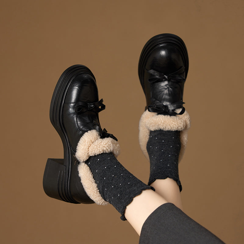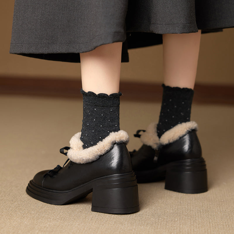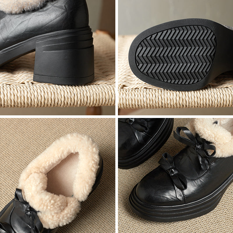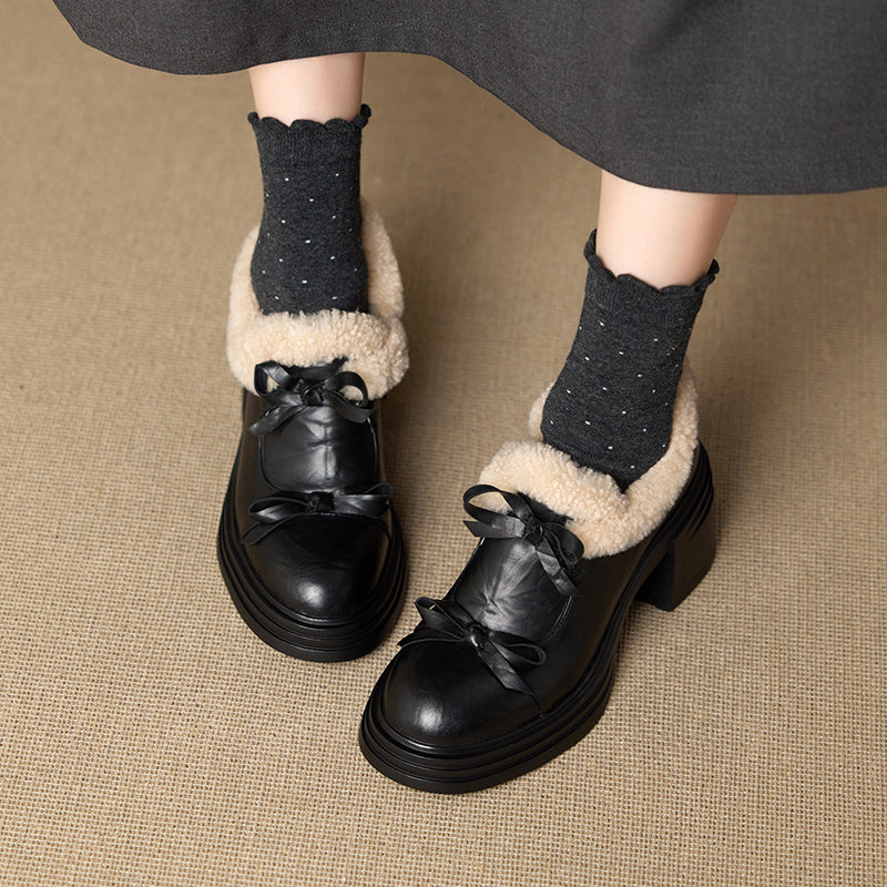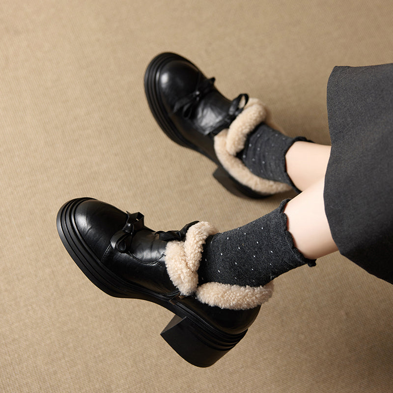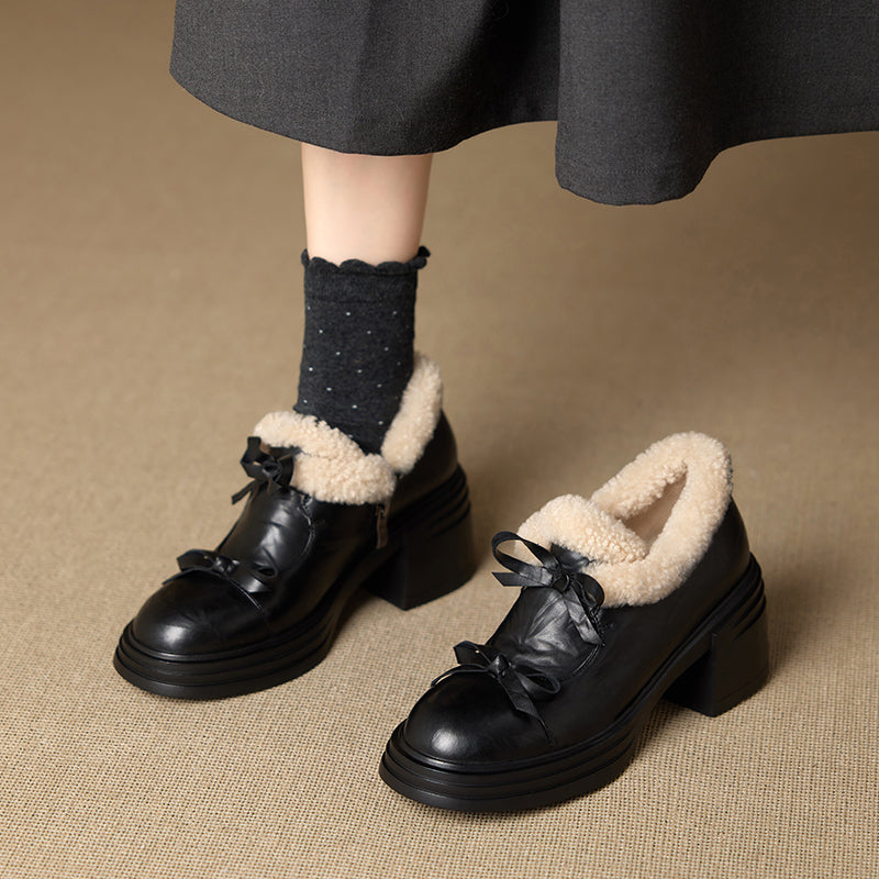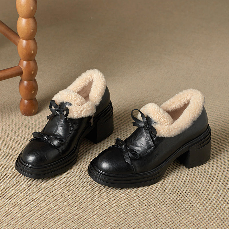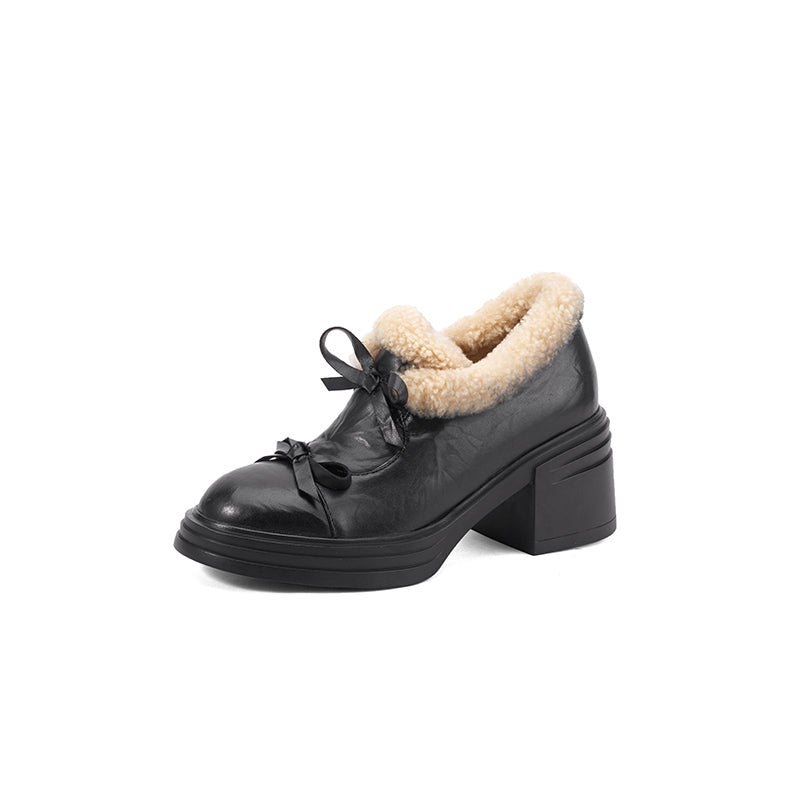 These women’s winter pumps combine cozy warmth with a bold, chunky silhouette. Crafted from premium cow leather, they feature a classic round toe, a stylish bow-tie detail, and soft shaggy trim for a seasonal look. The plush lambswool lining keeps feet warm and comfortable, while the sturdy 70 mm block heel adds height with everyday stability. Finished with a durable TPR outsole, these casual winter pumps are perfect for pairing with knits, coats, and cold-weather outfits.