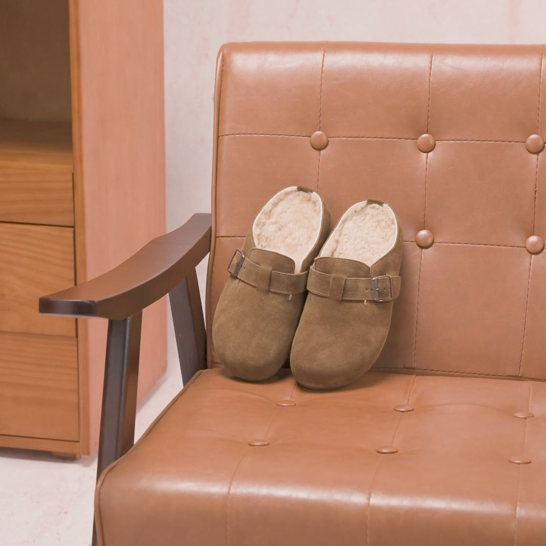 Step into cozy style with Dwarves women’s cow suede leather mules, crafted from soft suede and lined with warm fleece. Featuring a classic T-strap with adjustable buckle, round toe design, and a flat sole for all-day comfort. These shoes are inspired by the classic clog style, but feature a comfortable rubber sole for better flexibility and grip. These fleece-lined clog slippers blend vintage charm and everyday ease—perfect for lounging or casual outings.