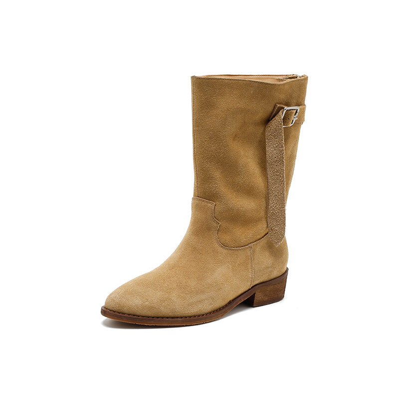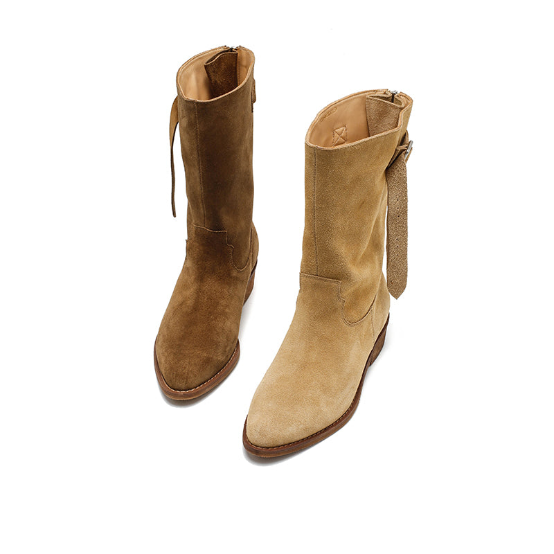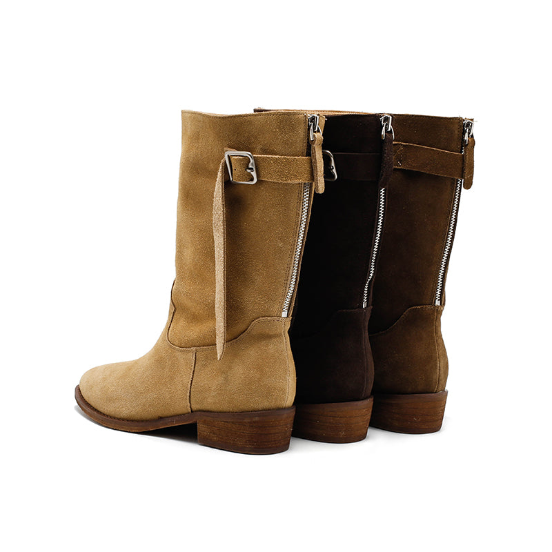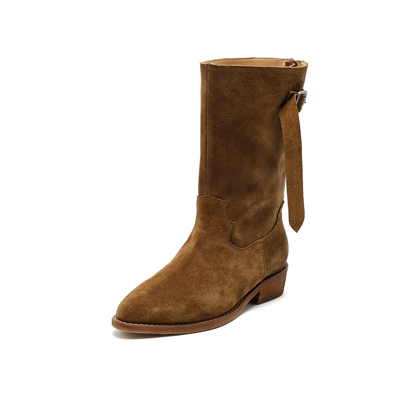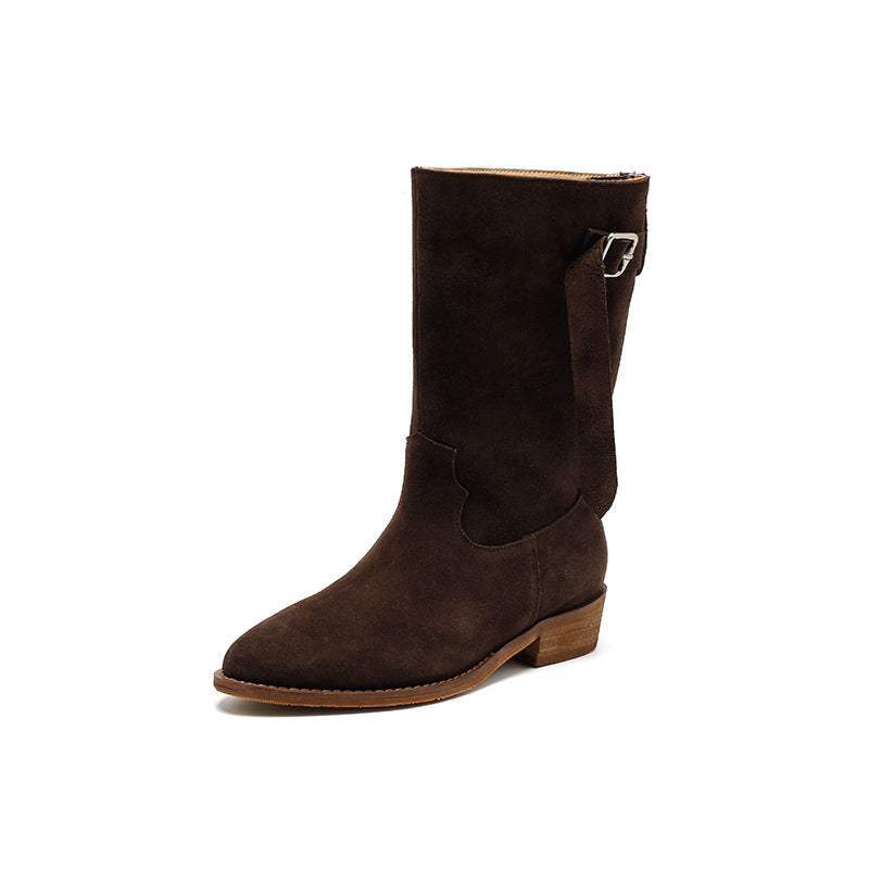 Dwarves Women’s Cow Suede Leather Mid Calf Cowboy Boots with Buckle Strap in Coffee/Brown/Dark Apricot