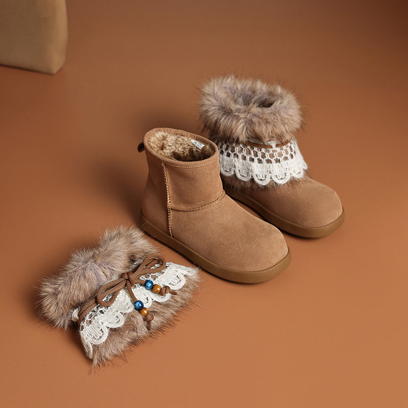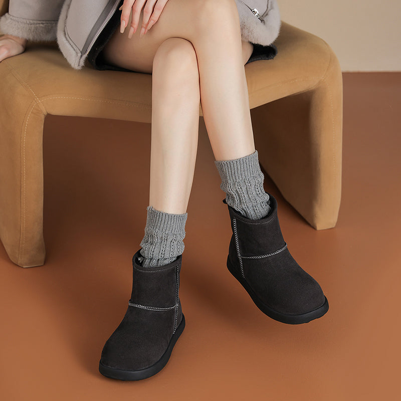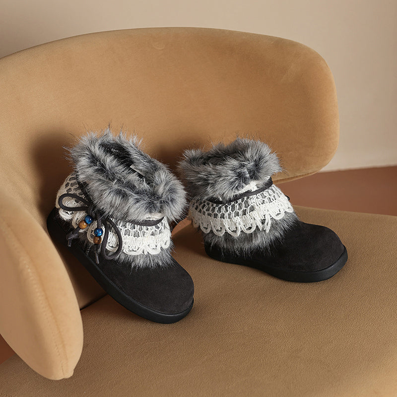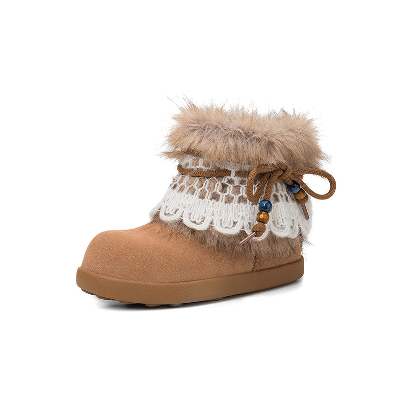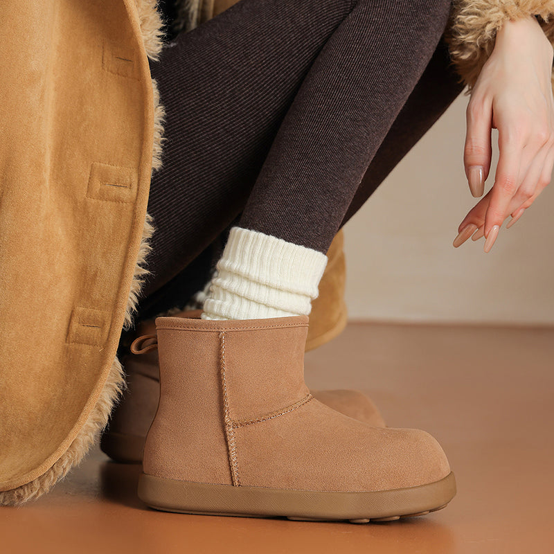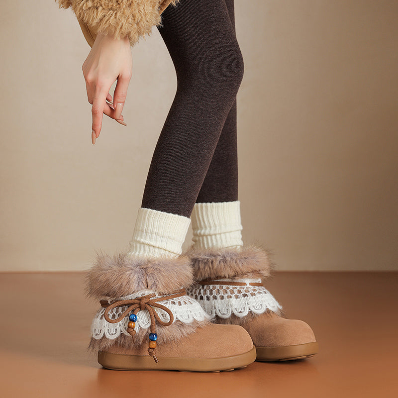 These women’s winter snow boots are crafted from premium cow suede leather, featuring a round toe and flat sole for all-day comfort. Designed with a detachable shaggy fur trim and lace up detail, they easily switch from cozy-cute to clean minimal style. The long plush lining and cushioned plush insole provide warmth and softness in cold weather, while the durable rubber outsole offers reliable grip for winter wear. Perfect as fashion-forward flat snow boots, ideal for casual outfits, daily wear, and cold-season styling.