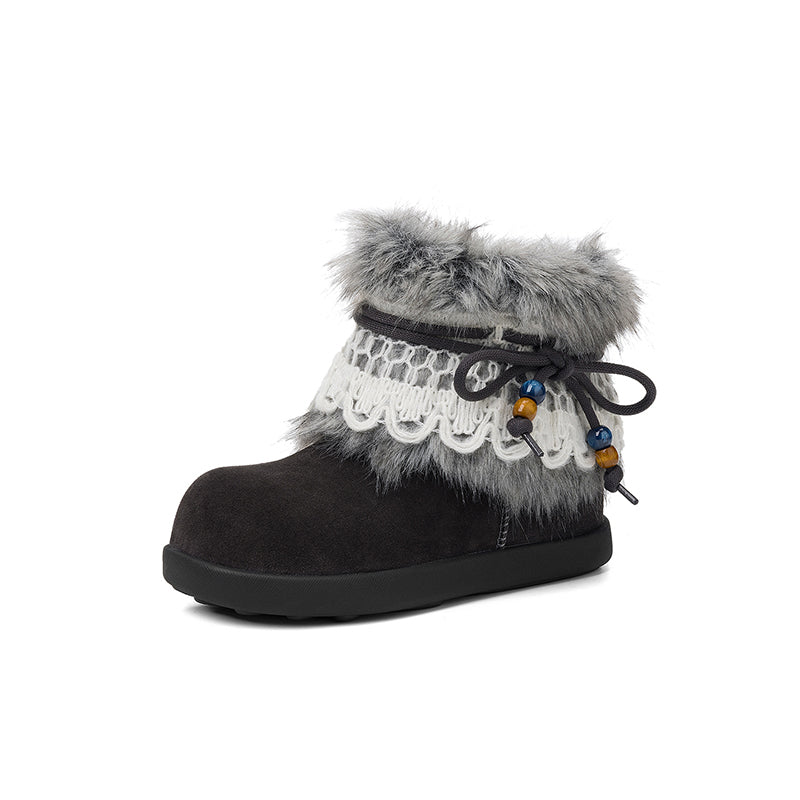 Fashion Cow Suede Snow Boots with Detachable Shaggy Fur Flat Winter Boots in Dark Grey/Khaki