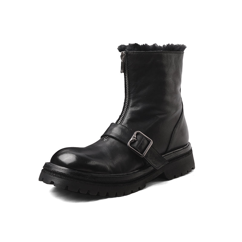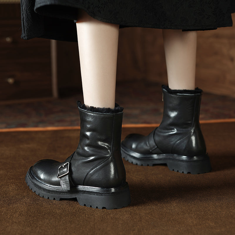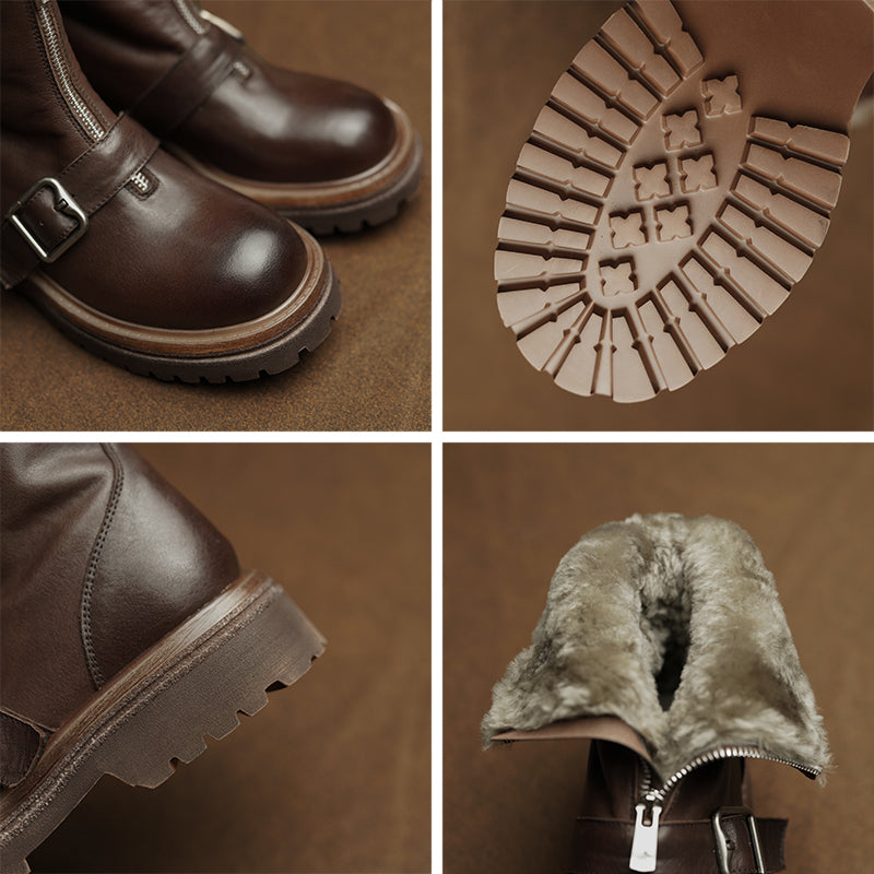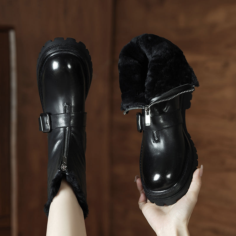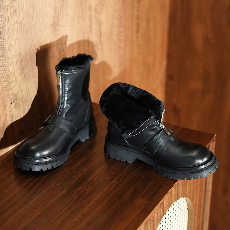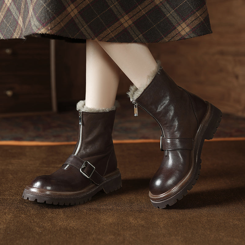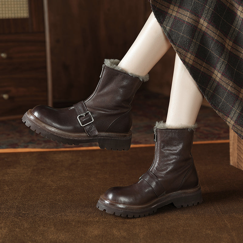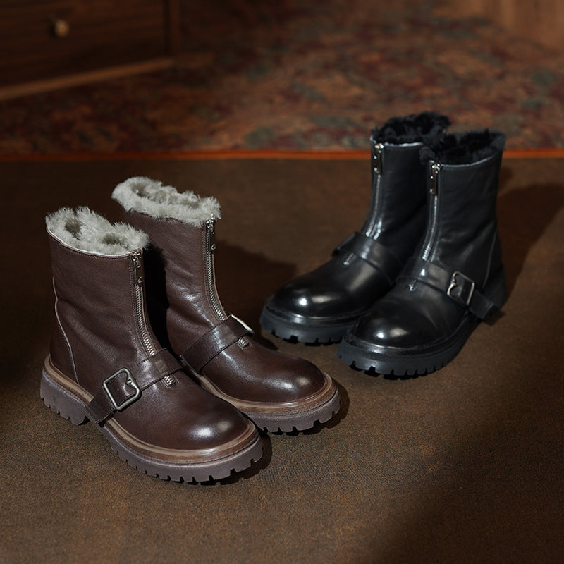 Handmade Shearling Lined Horse Leather Winter Boots for Women Front Zip Buckle Design Short Boots in Coffee/Black