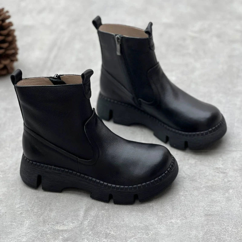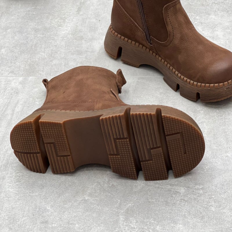 Retro Cowhide Chunky Martin Boots Women Comfy Zip Walking Boots Gray/Apricot