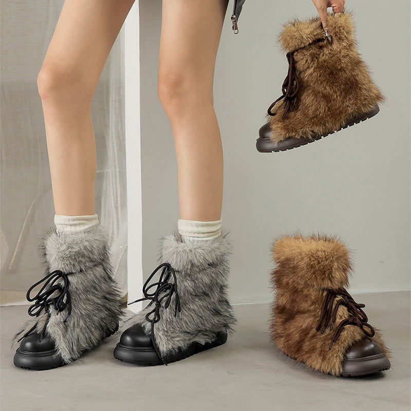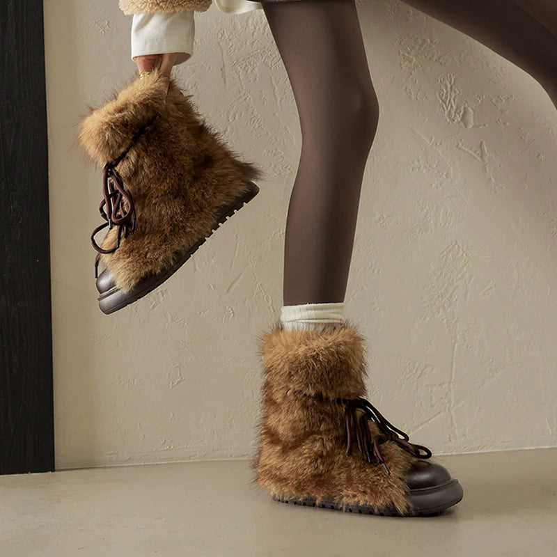 Shaggy Faux Fur Platform Winter Lace-Up Short Boots Cow Leather Warm Snow Boots in Dark Brown/Black