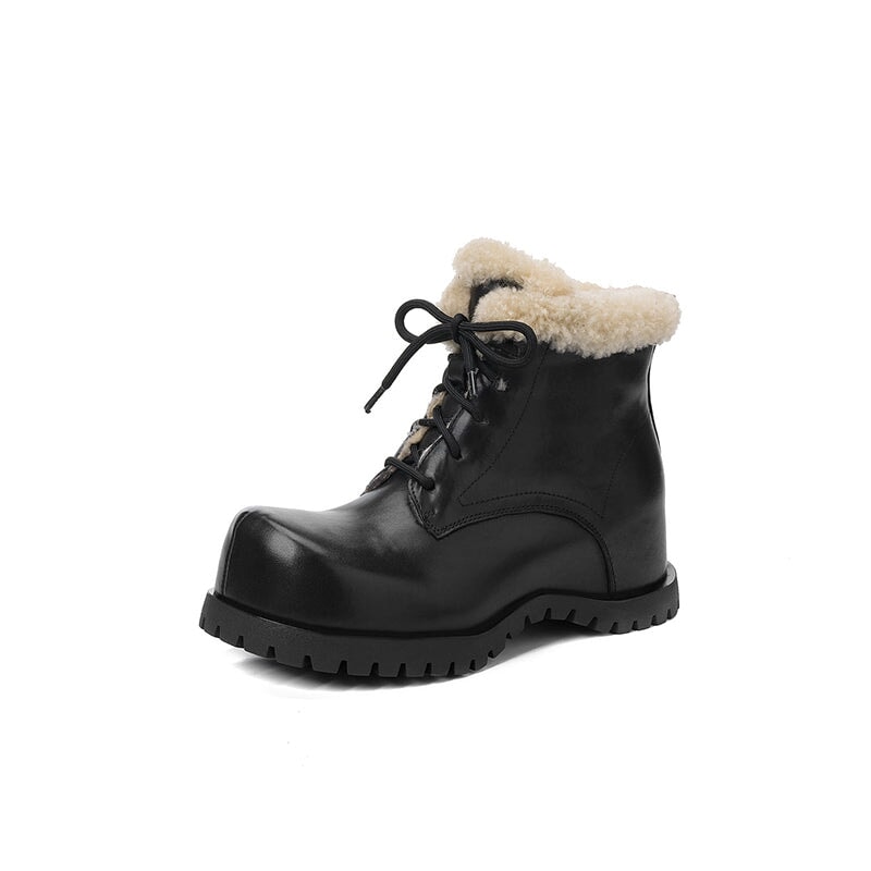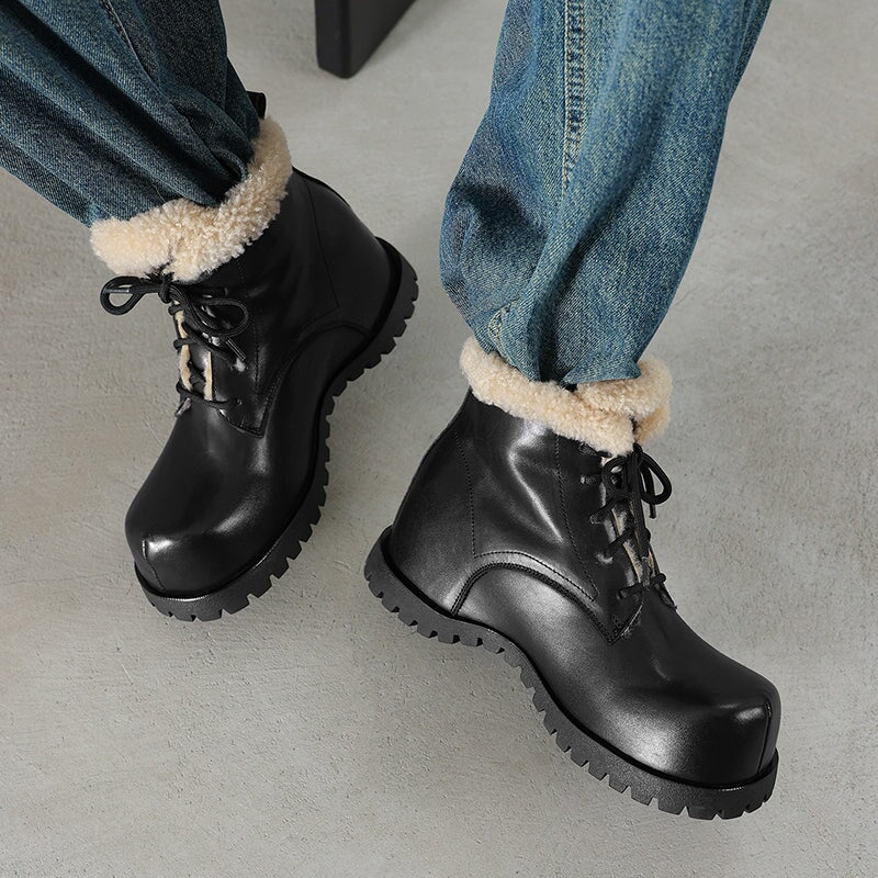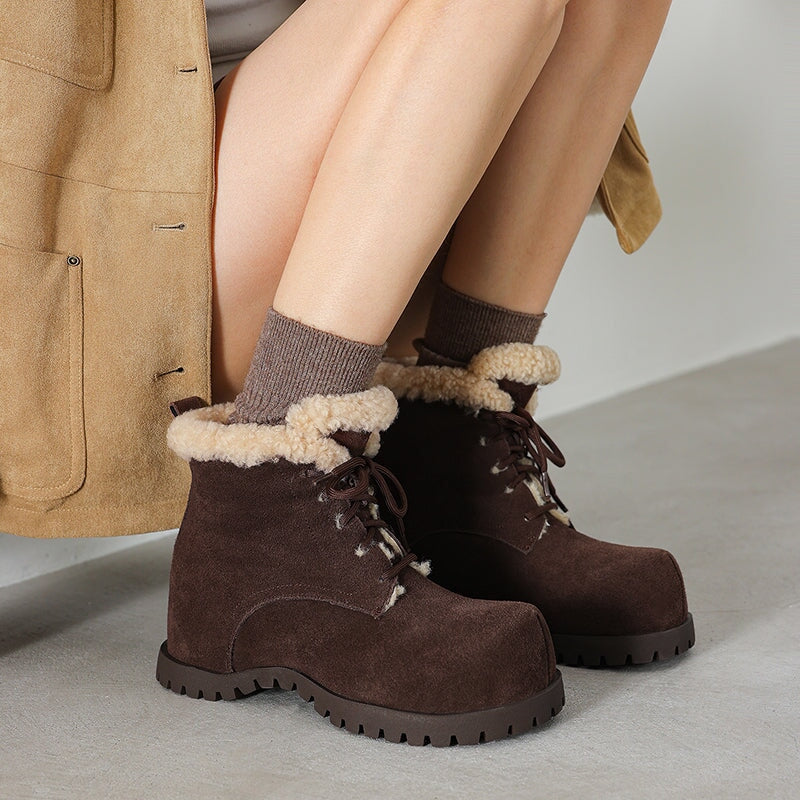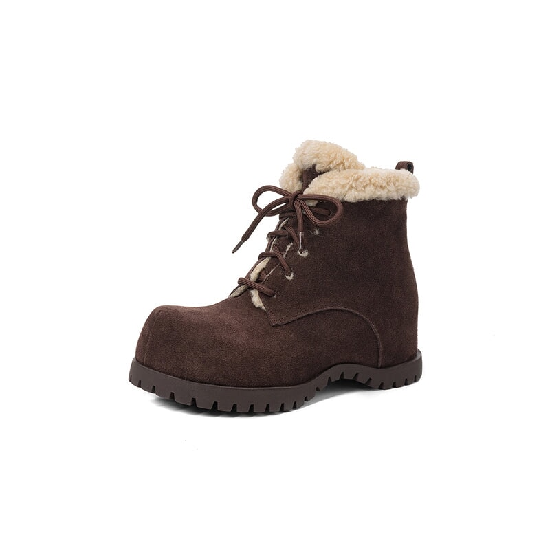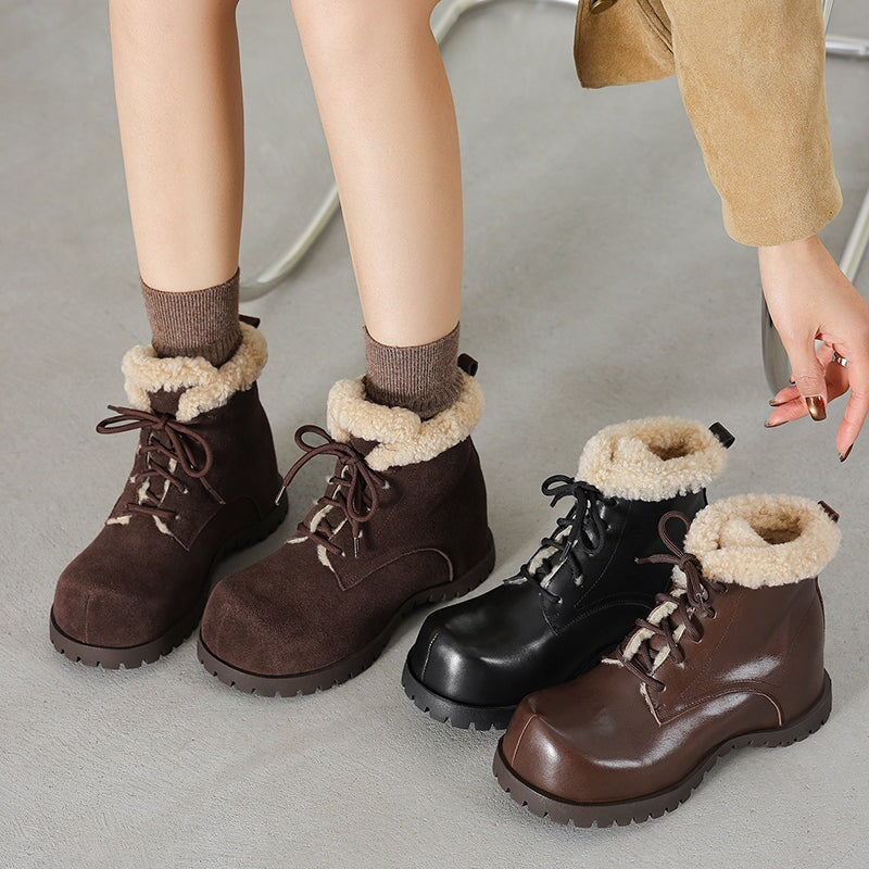 These women’s square toe lace-up ankle boots are crafted from top-layer cow leather and cow suede leather, paired with cozy shearling-style wool trim for a soft, shaggy look. Designed with a hidden internal lift for subtle height boost, they feature a faux lambswool lining and a sheepskin-style lambswool insole that keeps your feet snug and cushioned all day. Finished with a durable rubber outsole for grip and everyday wear, these winter ankle boots are perfect for casual outfits, cold days, and all-around cozy comfort.