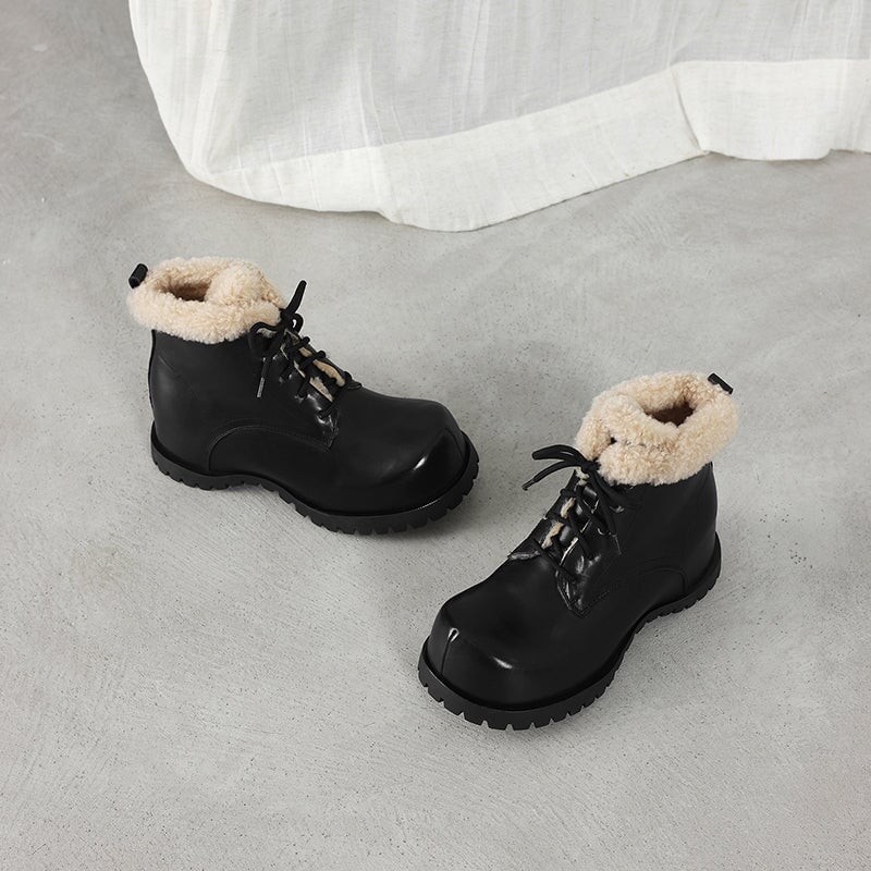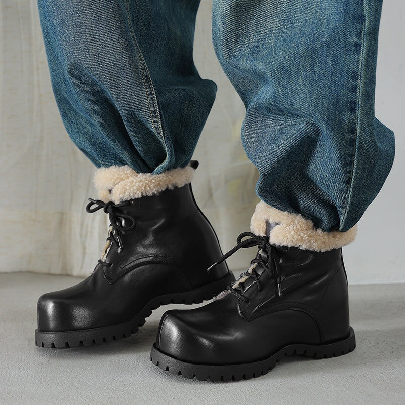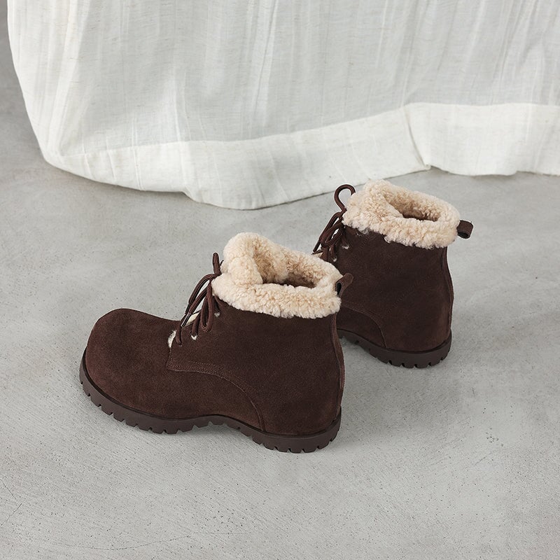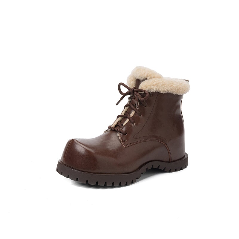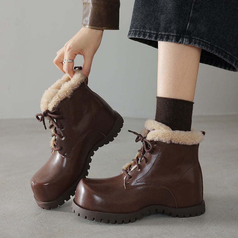 These women’s square toe lace-up ankle boots are crafted from top-layer cow leather and cow suede leather, paired with cozy shearling-style wool trim for a soft, shaggy look. Designed with a hidden internal lift for subtle height boost, they feature a faux lambswool lining and a sheepskin-style lambswool insole that keeps your feet snug and cushioned all day. Finished with a durable rubber outsole for grip and everyday wear, these winter ankle boots are perfect for casual outfits, cold days, and all-around cozy comfort.