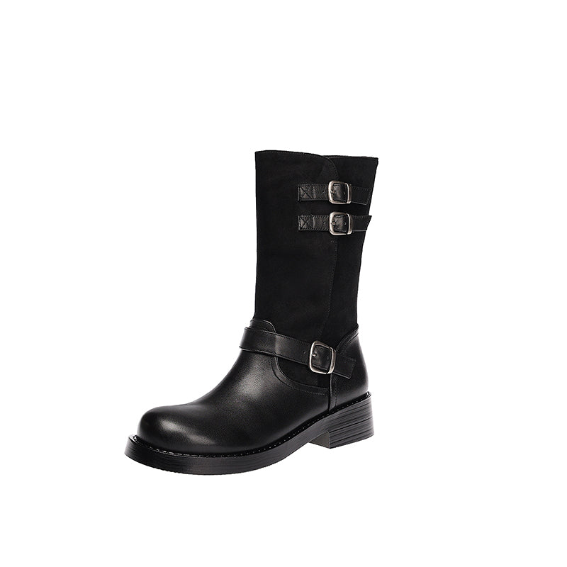 These women’s mid-calf biker boots made of full-grain leather and soft suede for a stylish vintage look. Designed with a round toe, sturdy block heel, and durable rubber outsole, they offer both comfort and long-lasting wear. Adjustable buckles add a classic biker-inspired edge. Available with short plush lining for winter warmth or a breathable leather lining for year-round comfort, making them a fashionable and versatile choice for any season.