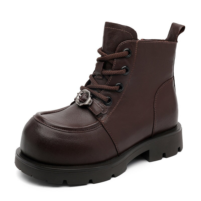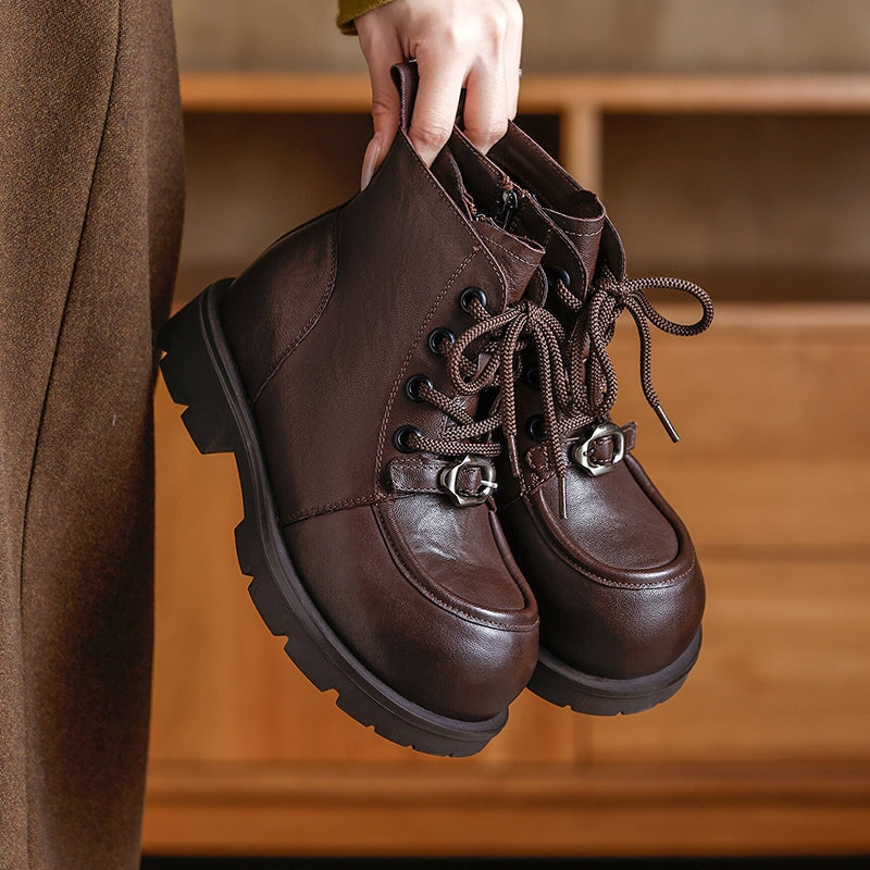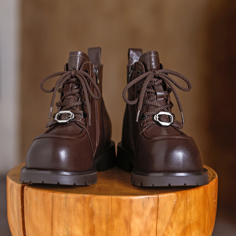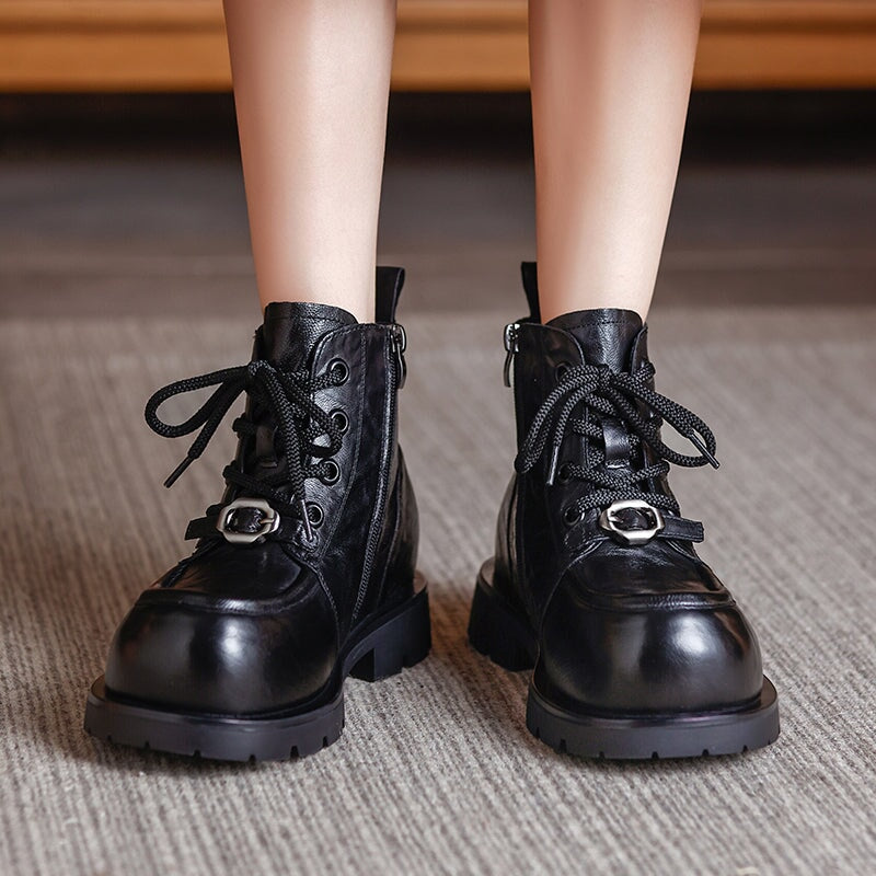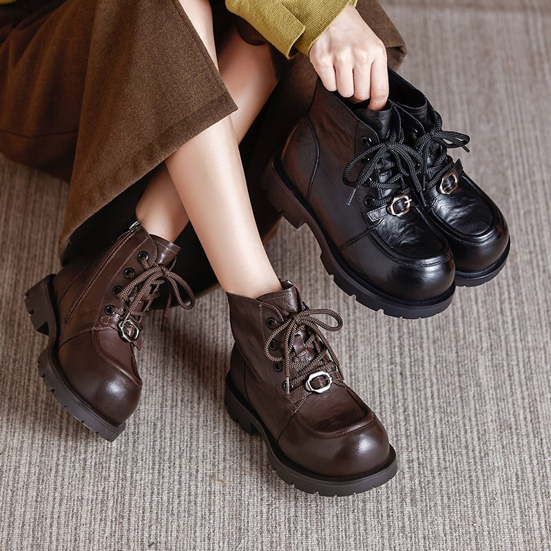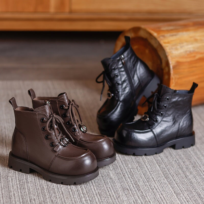 Wide Fit Cowhide Leather Ankle Boots for Women Lace-Up Side Zip Martin Short Boots in Black/Brown