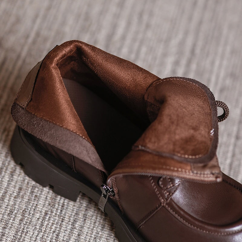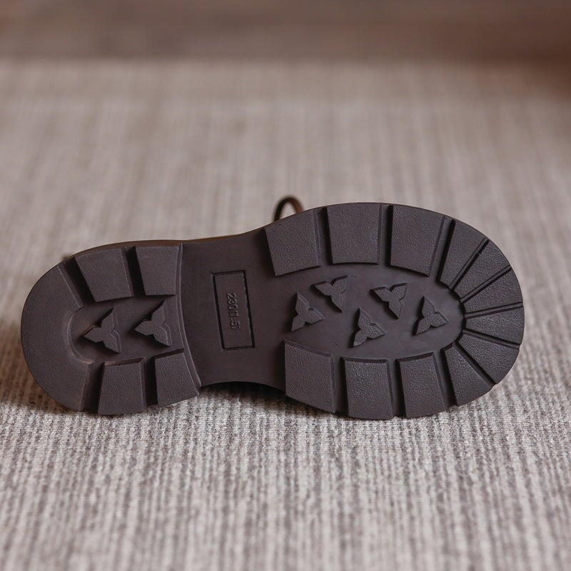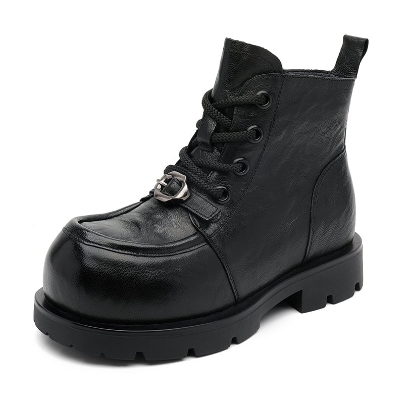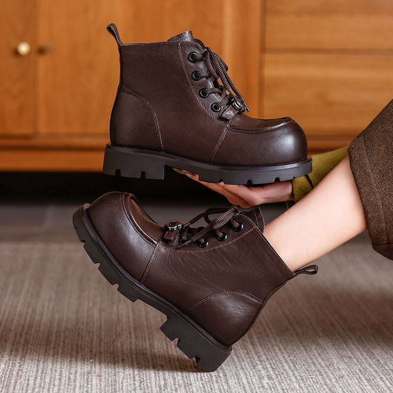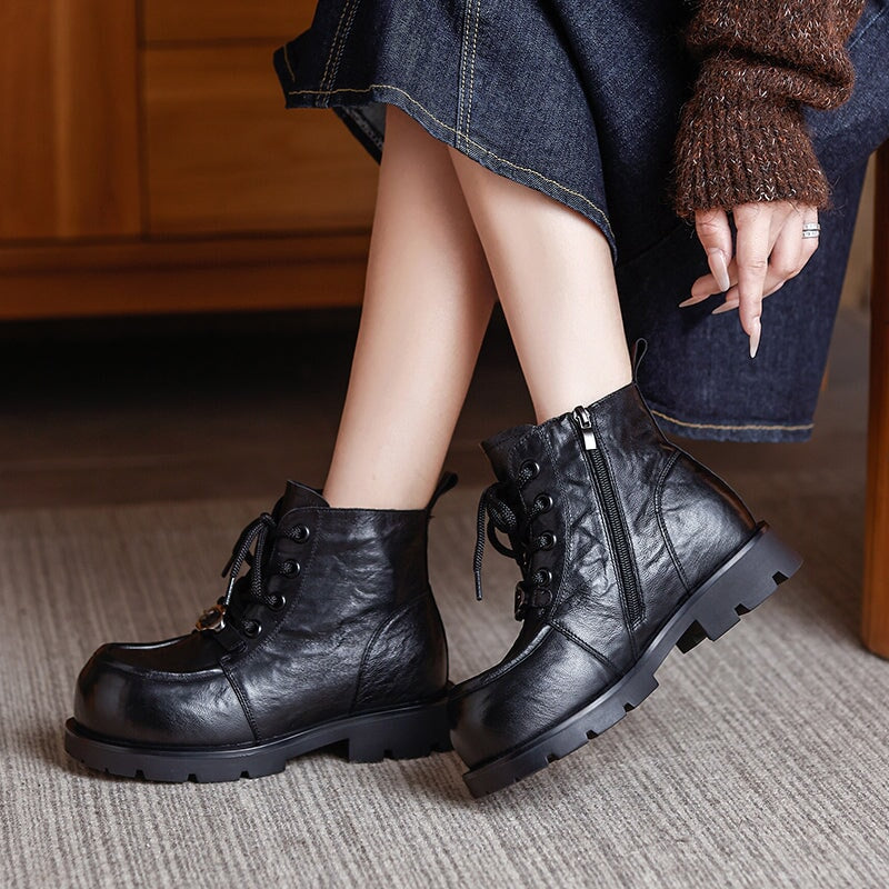 Crafted from premium full-grain cow leather, these Handmade Martin Short Boots feature a roomy round toe and wide fit for all-day comfort. Designed with a lace-up front and side zipper for easy wear, they also include a subtle internal height increase for a natural lift. The durable rubber sole provides great traction and stability, while the classic ankle boot silhouette blends vintage charm with modern everyday style.