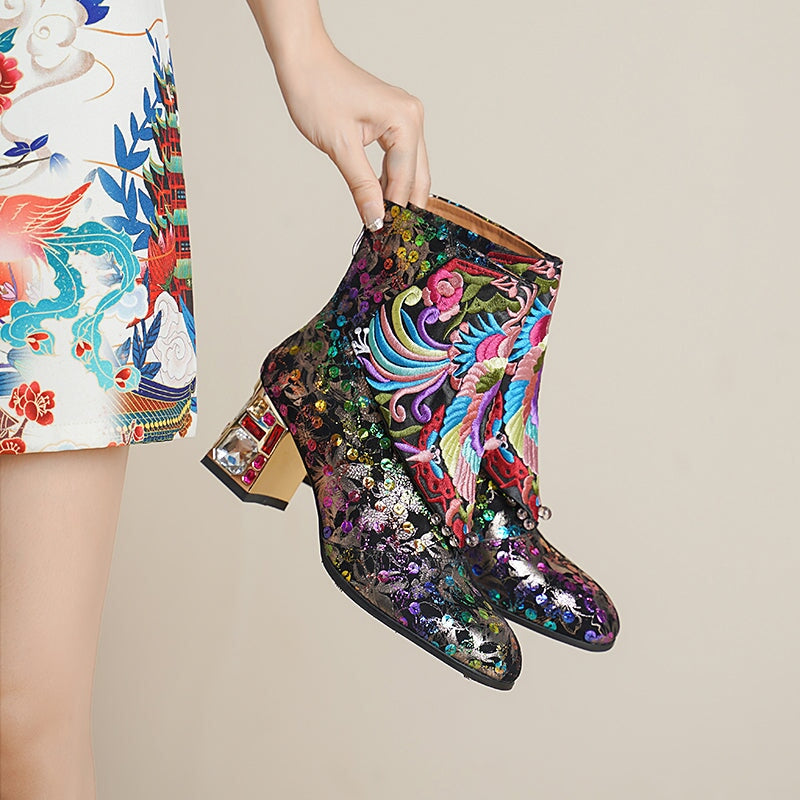 Women’s Designer Embroidered Ankle Boots Colorful Back Zip Leather Boots in Black