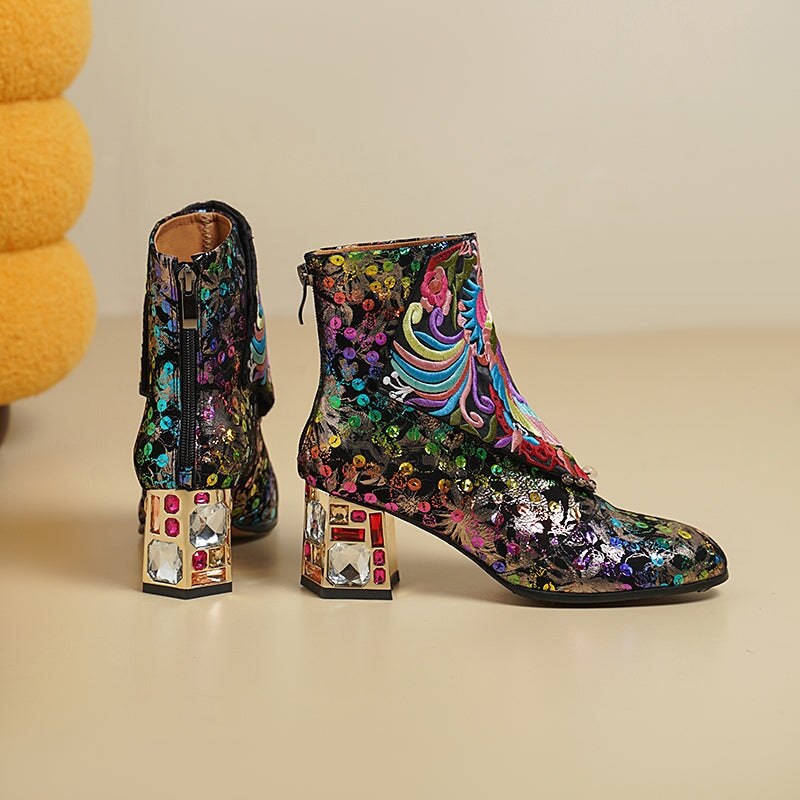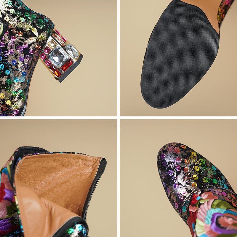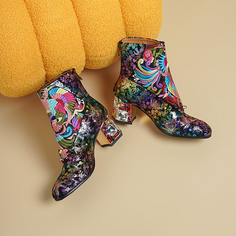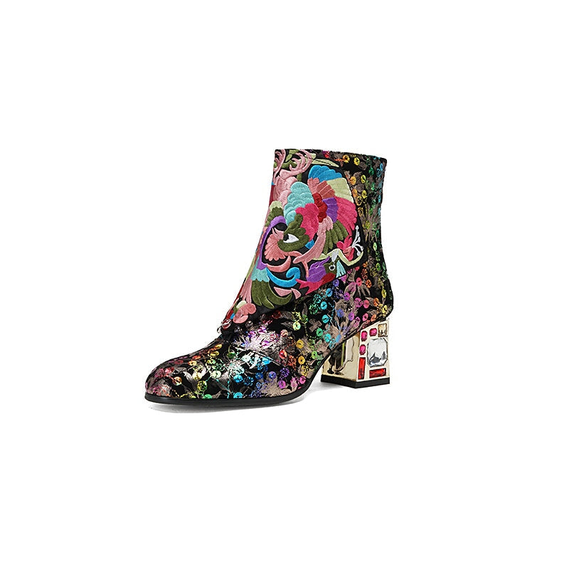 Make a bold fashion statement with these women’s colorful designer ankle boots. Crafted from premium sheepskin leather with exquisite embroidery, they feature a comfortable round toe, sturdy block heel, and decorative heel accents for added elegance. The back zip design makes them easy to wear, while the durable rubber sole ensures stability and comfort. Perfect for parties, fashion events, or elevating your everyday style.