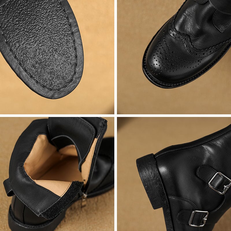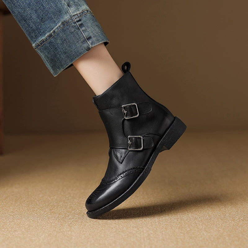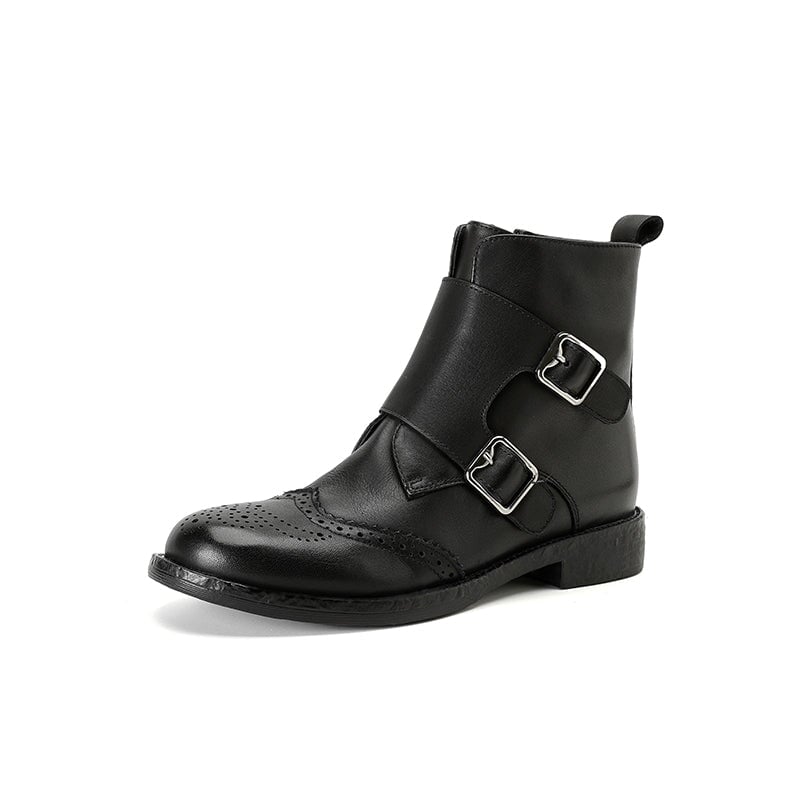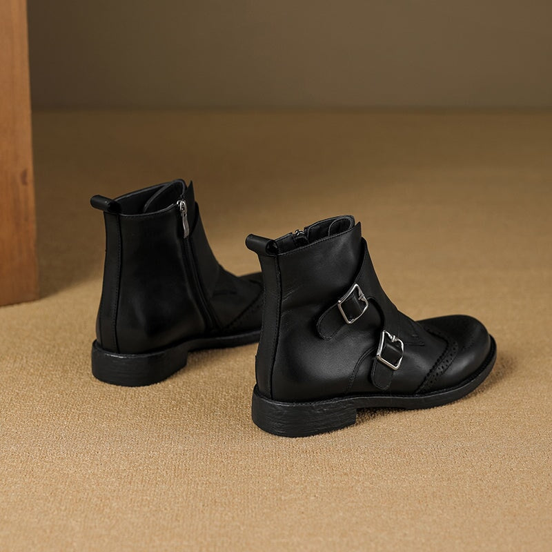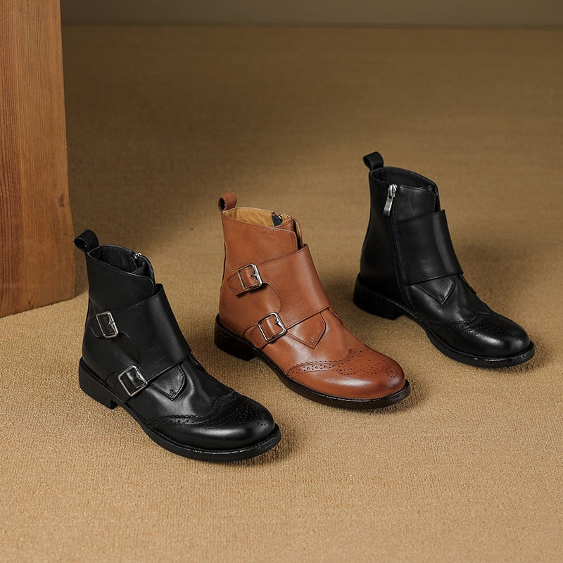 Women’s Leather Brogue Ankle Boots Side Zip Full-Grain Leather Short Boots with Double Buckle in Black/Brown