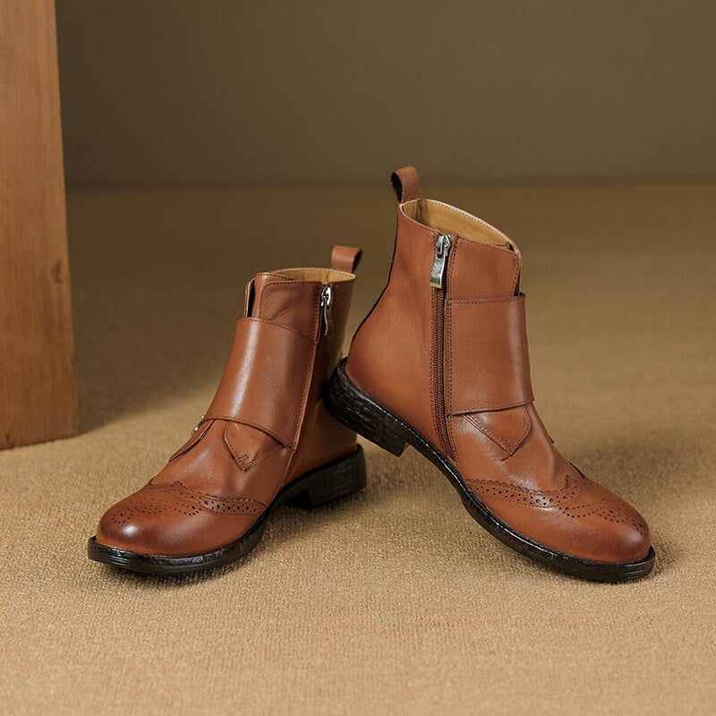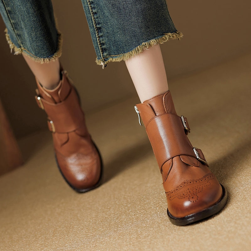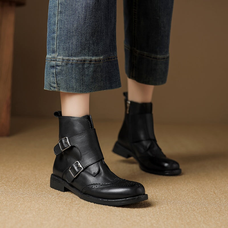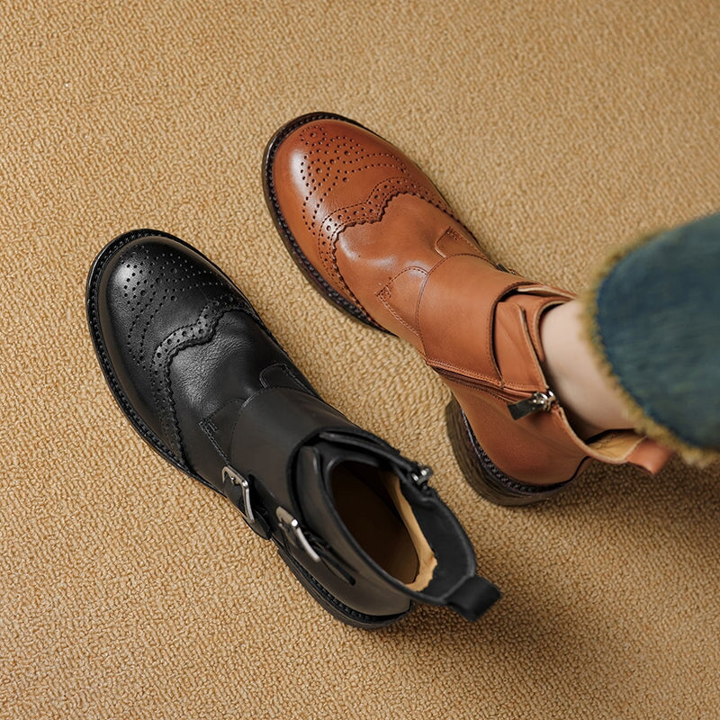 These women’s brogue ankle boots are crafted from premium full-grain cowhide leather, featuring classic wingtip perforations, side zip and a stylish double-buckle design. The round-toe silhouette and low block heel offer both elegance and everyday comfort. Built with a durable rubber sole for stable walking. Available with either a cozy short-plush lining for winter warmth or a breathable leather lining for year-round wear, making them versatile for all seasons. Perfect for casual outfits, smart-casual styling, and vintage-inspired looks.