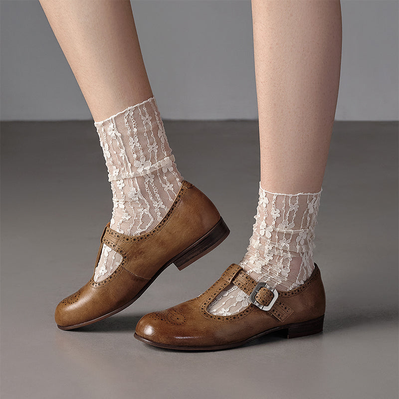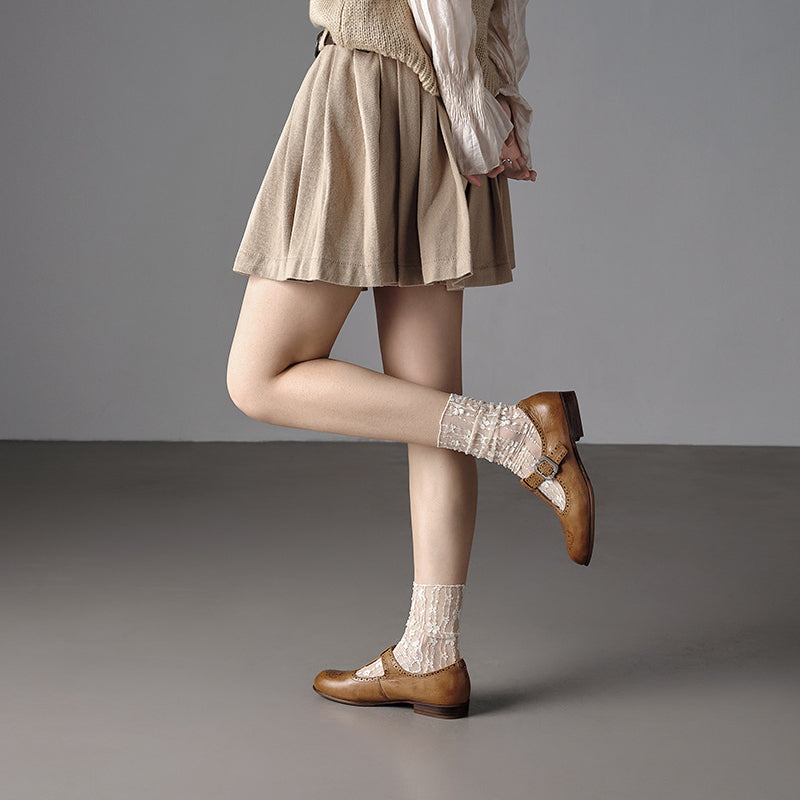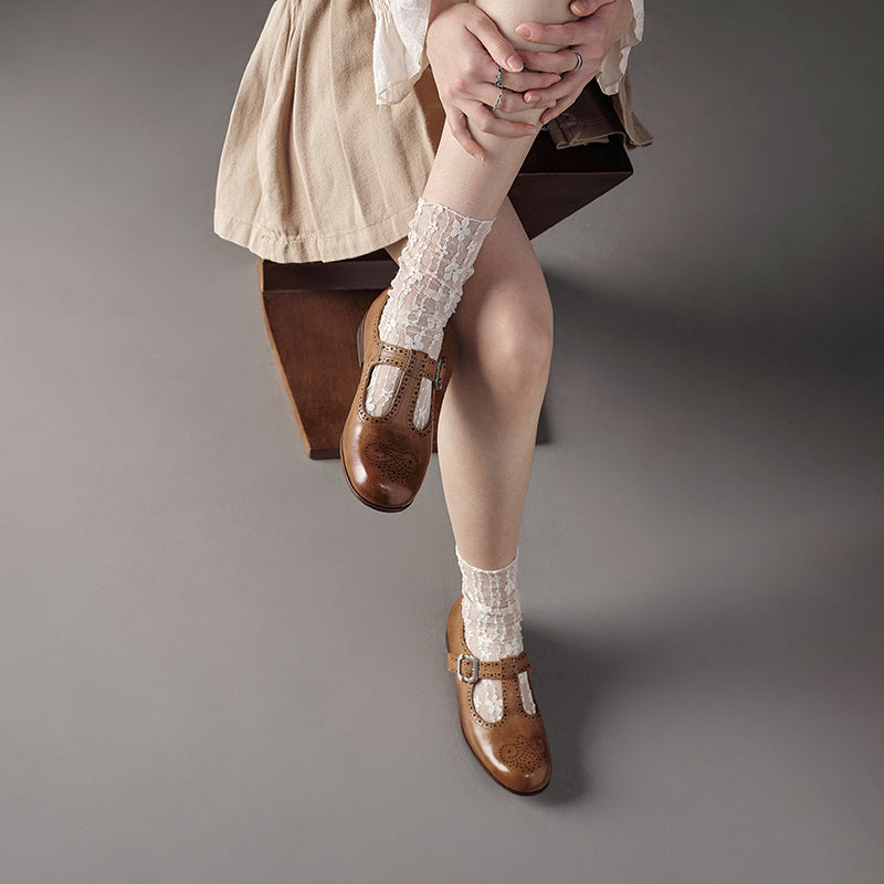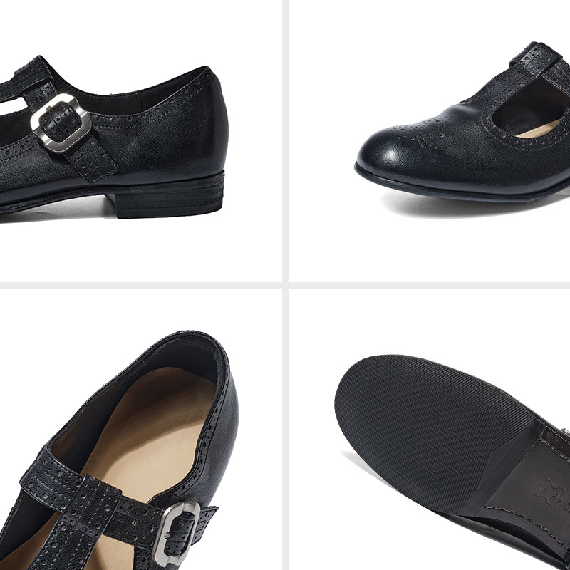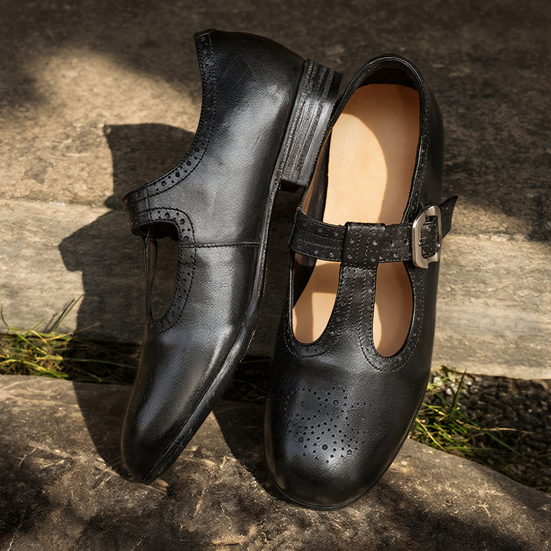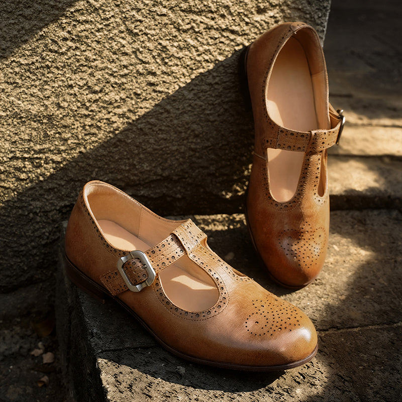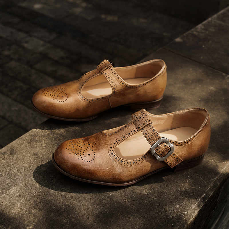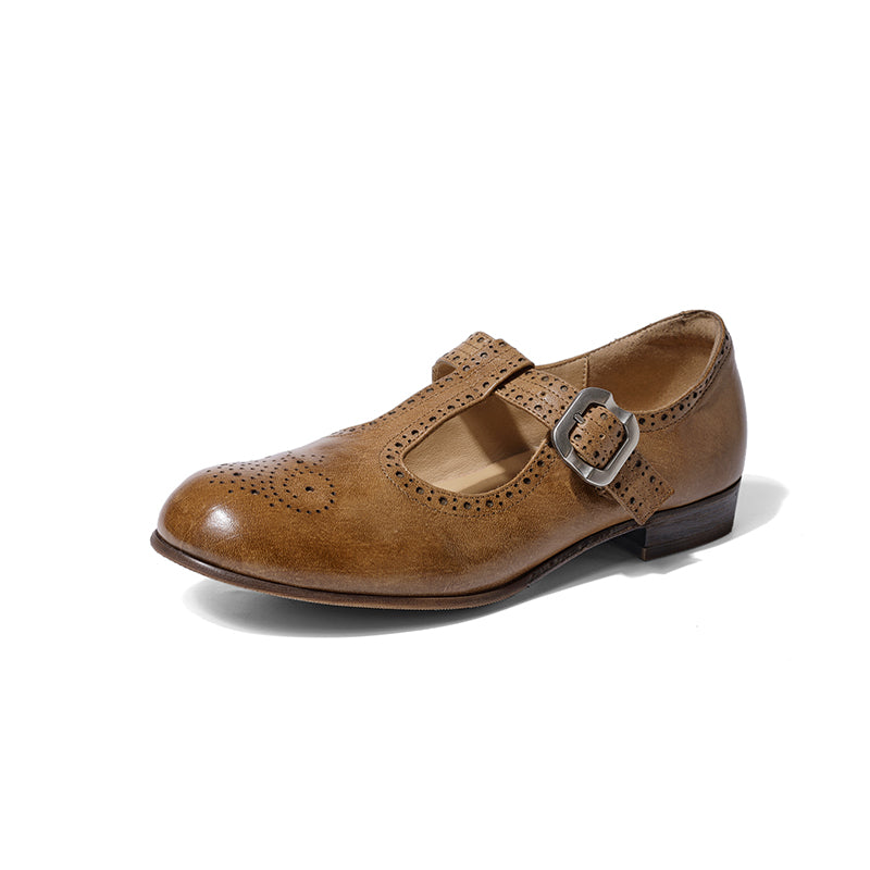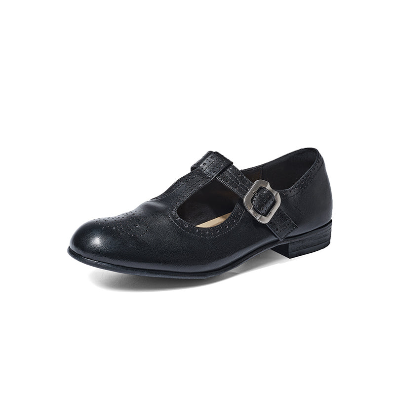 Classic academic-style Mary Jane flats crafted from premium horse leather, featuring elegant brogue detailing and a timeless T-strap buckle design. The round toe ensures a comfortable fit, while the low block heel provides subtle support for everyday wear. Finished with a durable leather sole, each pair is handmade to deliver refined vintage charm and long-lasting quality.