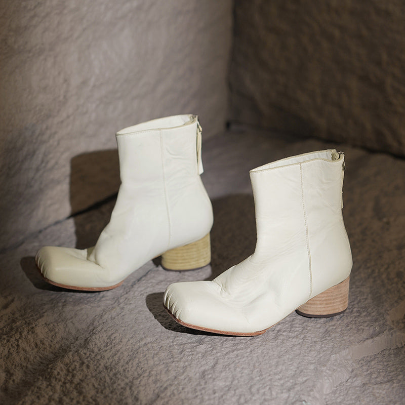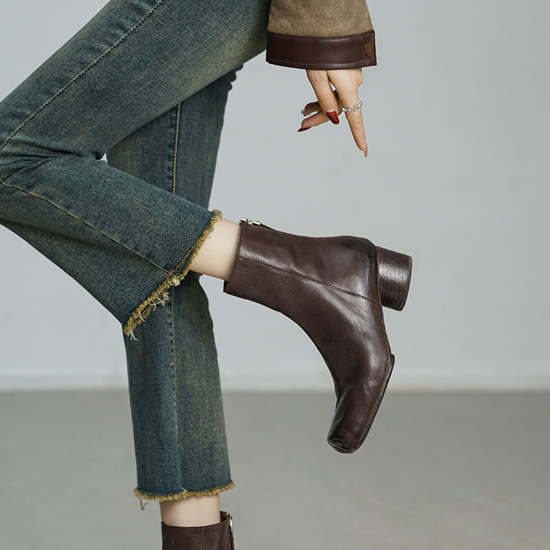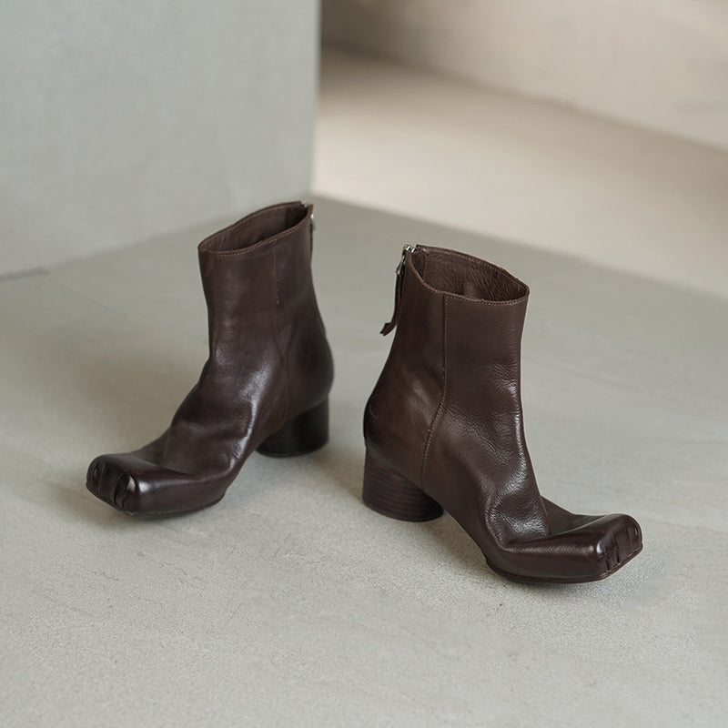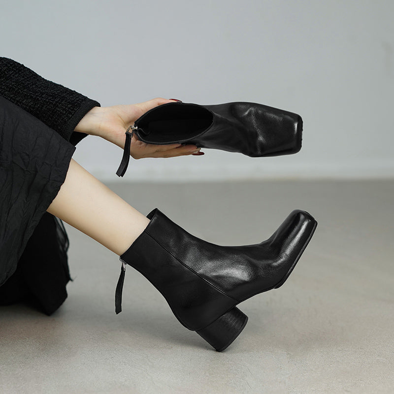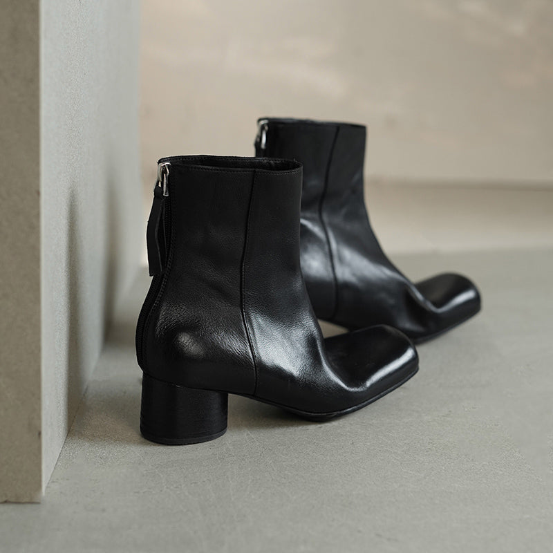 Discover timeless elegance with these Handmade Short Boots. Made from premium Polish full-grain washed horse leather, they feature a sleek square toe, back zip design, and a unique cylinder heel that enhances your posture and silhouette. The soft leather sole and refined craftsmanship ensure all-day comfort and a slimming fit. Perfect for adding a touch of understated luxury to your everyday or dressy outfits.
