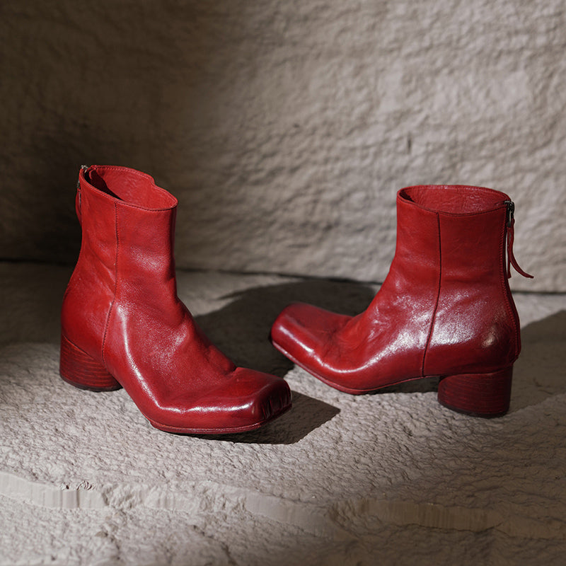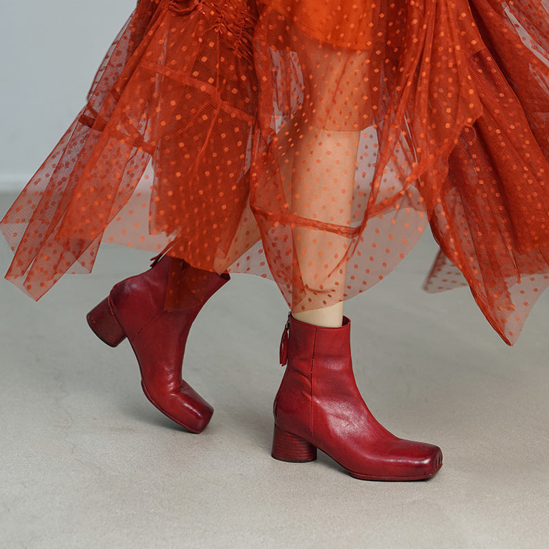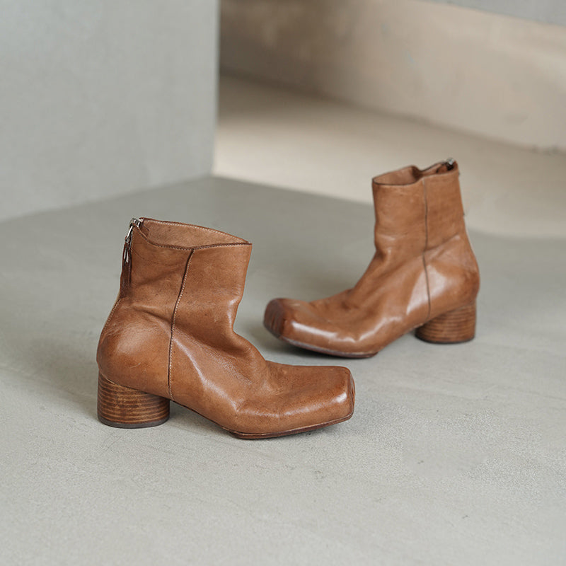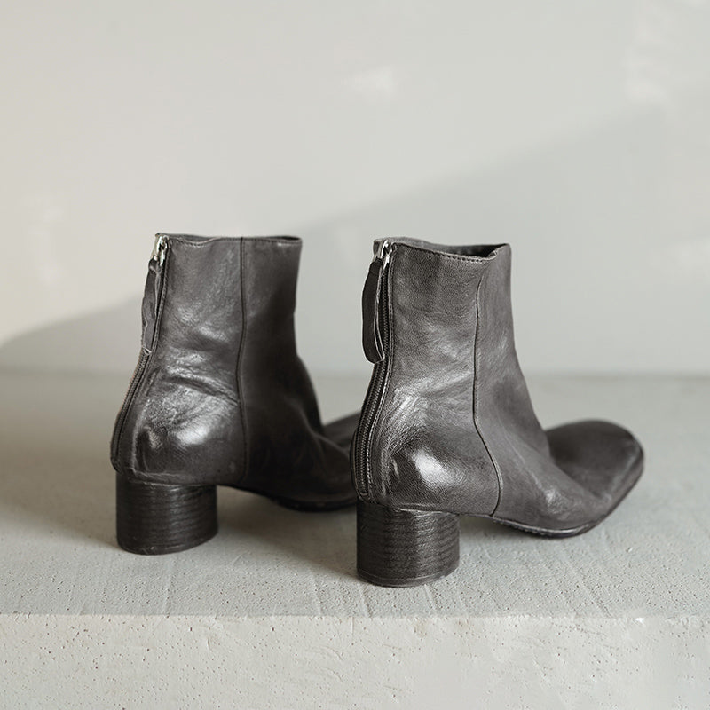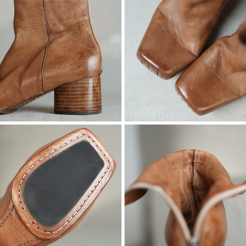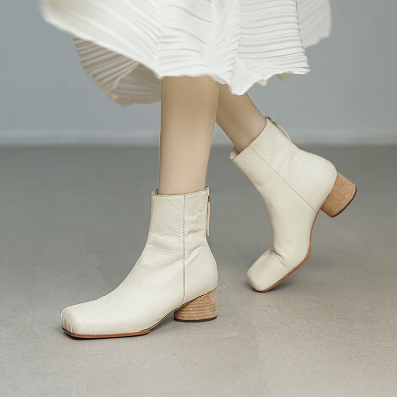 Discover timeless elegance with these Handmade Short Boots. Made from premium Polish full-grain washed horse leather, they feature a sleek square toe, back zip design, and a unique cylinder heel that enhances your posture and silhouette. The soft leather sole and refined craftsmanship ensure all-day comfort and a slimming fit. Perfect for adding a touch of understated luxury to your everyday or dressy outfits.