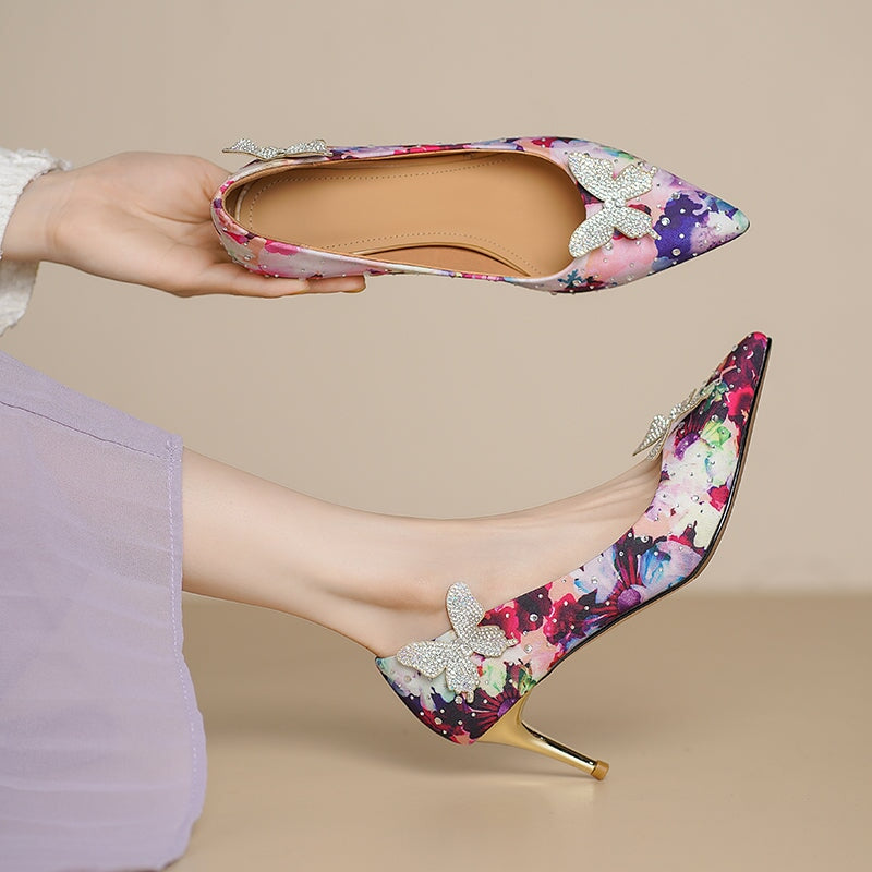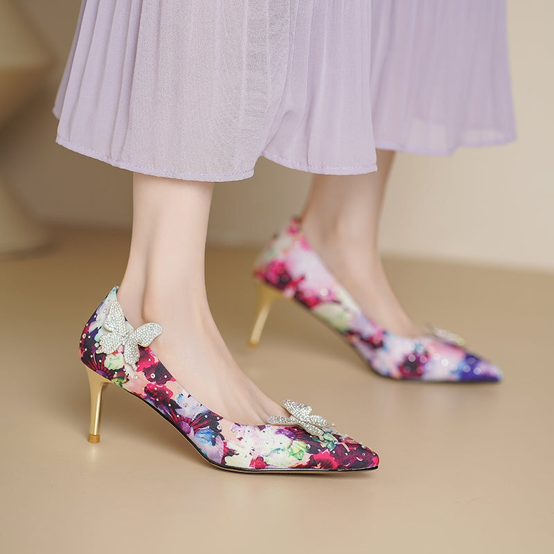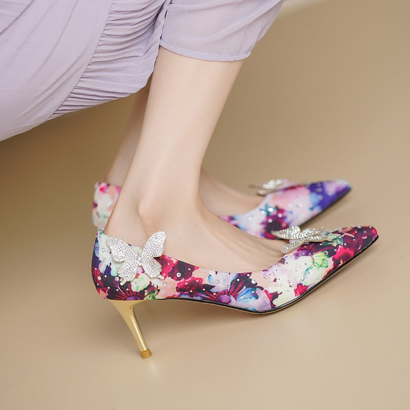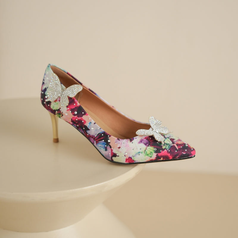 Step into elegance with these 70mm pointed-toe stiletto heels, crafted from luxurious printed satin in vibrant floral tones. Adorned with sparkling rhinestone butterfly accents, they add a touch of whimsy to any outfit. Perfect for weddings, parties, or dressing up your everyday look. Finished with a comfortable rubber sole for confident steps.