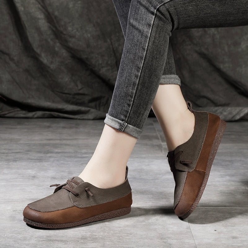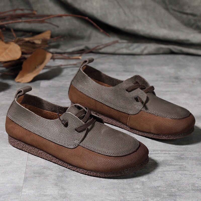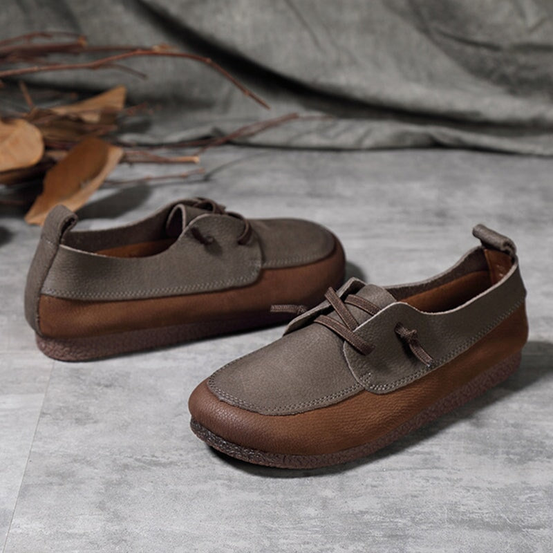 Handmade Two-Tone Cow Leather Oxford Shoes for Women Lace-Up Flat Barefoot Shoes in Grey/Coffee