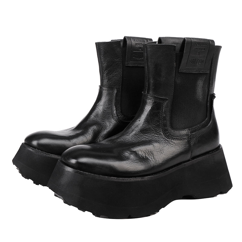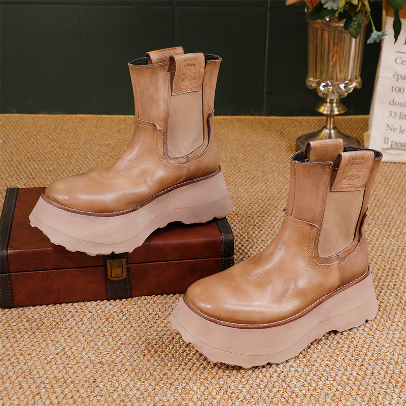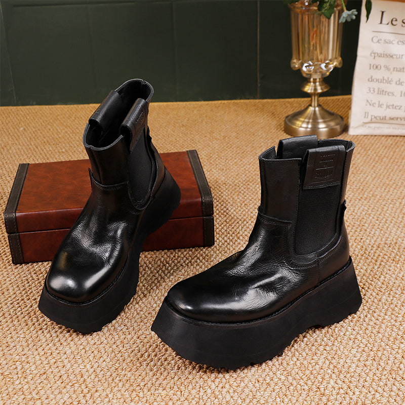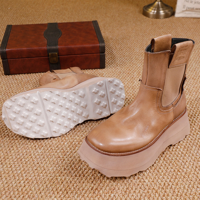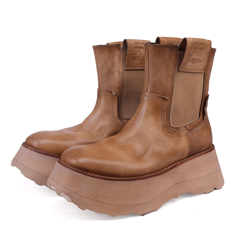 Step up your look with these handmade retro platform Chelsea boots. Crafted from premium washed cowhide leather, they feature a smooth round toe and a minimalist vintage design. The chunky rubber and EVA foam outsole offers lightweight comfort, superior traction, and shock absorption, so you can walk confidently all day long. Each pair is carefully fixed by experienced craftsmen to ensure durability and quality â€?a timeless boot you’ll wear for years.