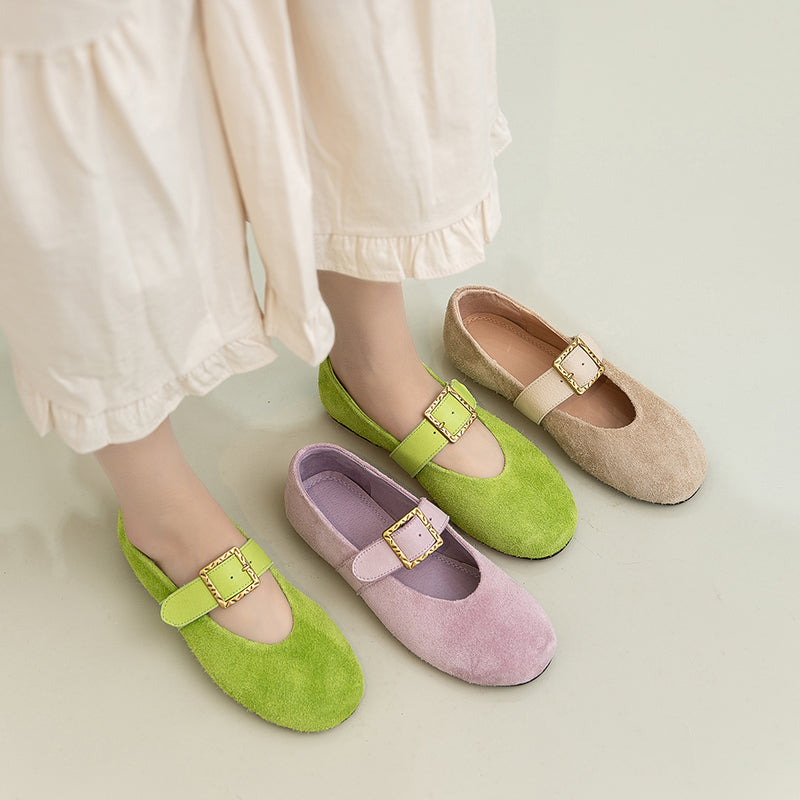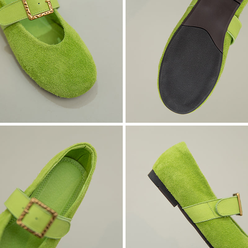 Preppy Style Mary Jane Flats Soft Suede Leather Shoes for Women in Green/Purple/Beige
