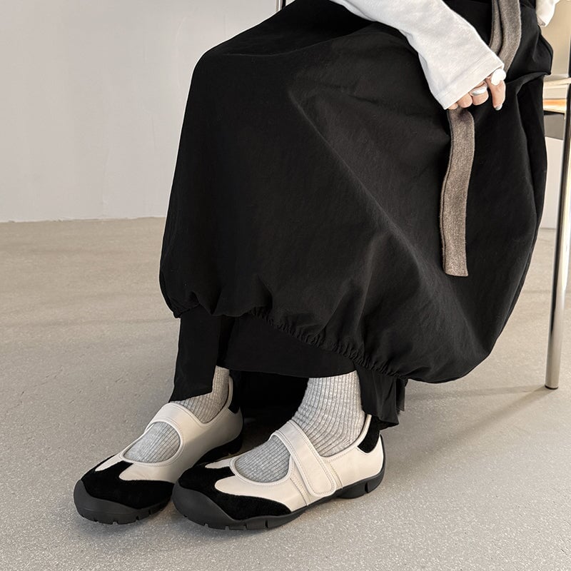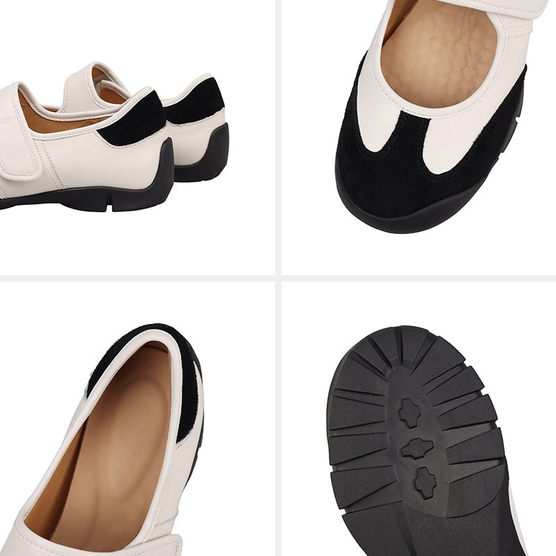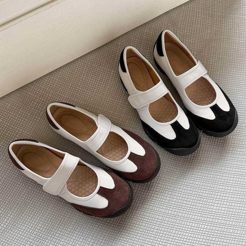 These sporty Mary Jane flats blend comfort with modern style. Designed with a round toe and eye-catching two-tone color blocking, they feature an easy hook-and-loop velcro strap for quick on-and-off wear and a secure fit. Made from top-layer cow leather, the upper feels soft yet durable, while the flat rubber outsole provides flexibility and everyday grip. Perfect for casual wear, travel, and long walks, these flats offer a relaxed, sporty twist on a classic Mary Jane silhouette.
