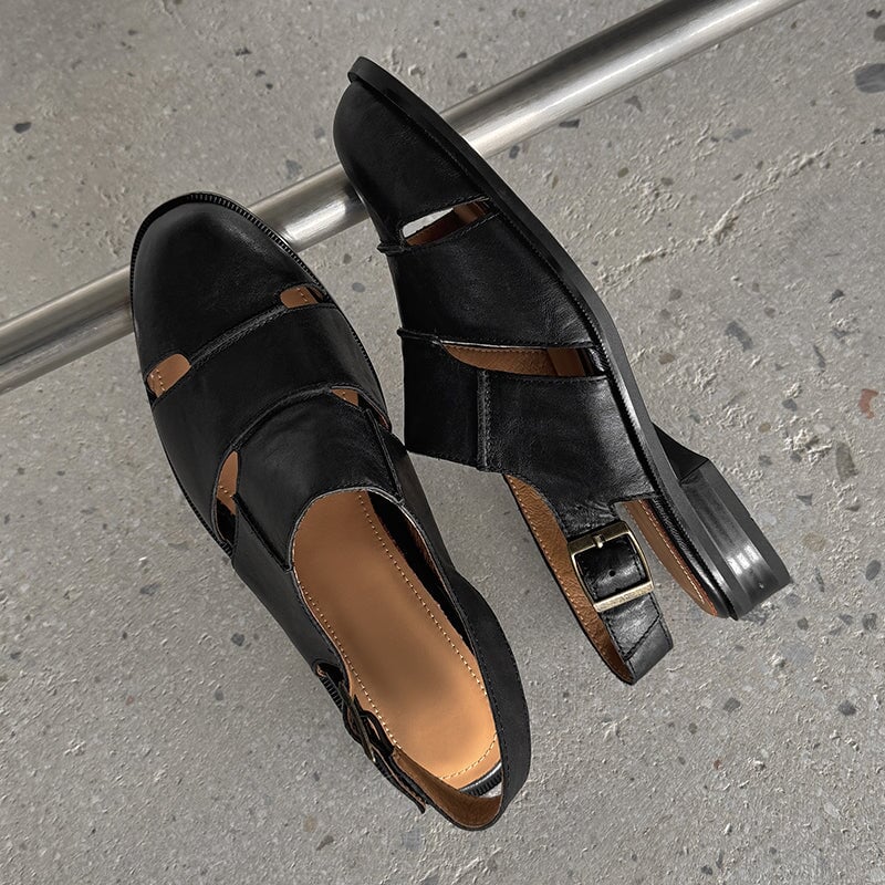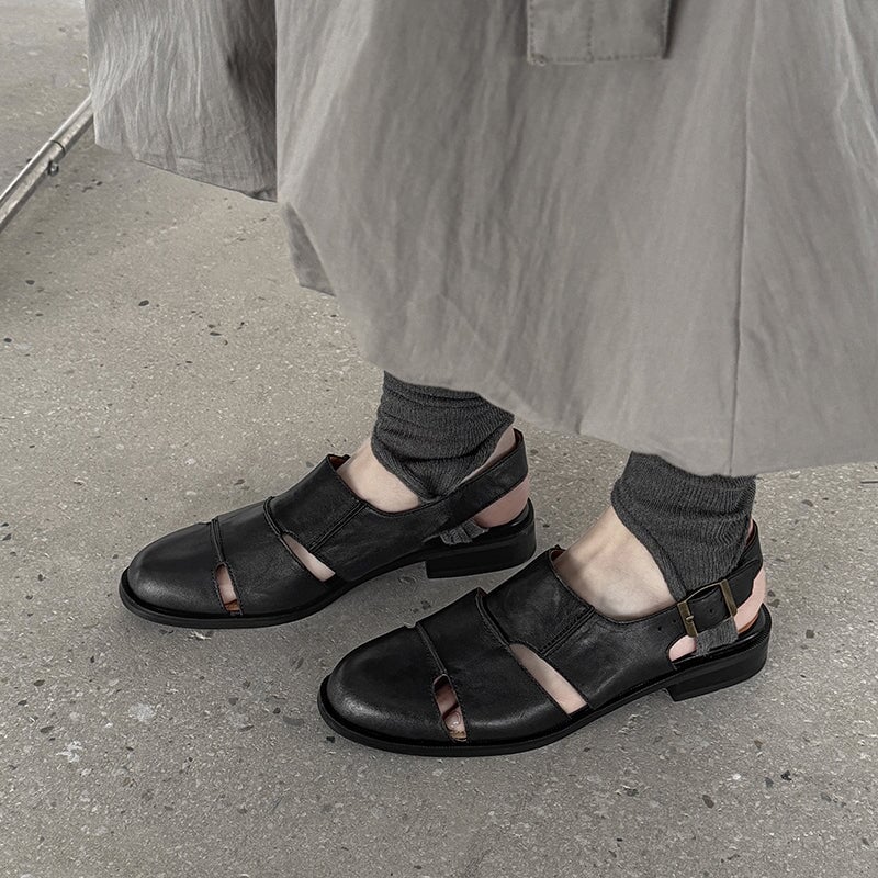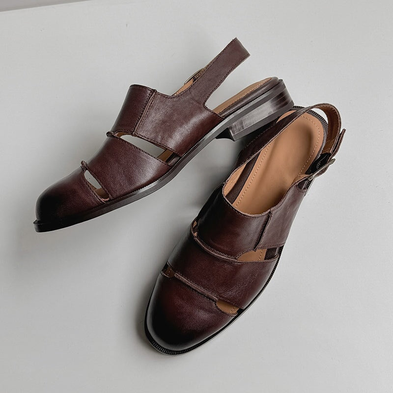 Vintage Leather Closed-Toe Slingback Roman Sandals with Buckle Strap in Black/Brown