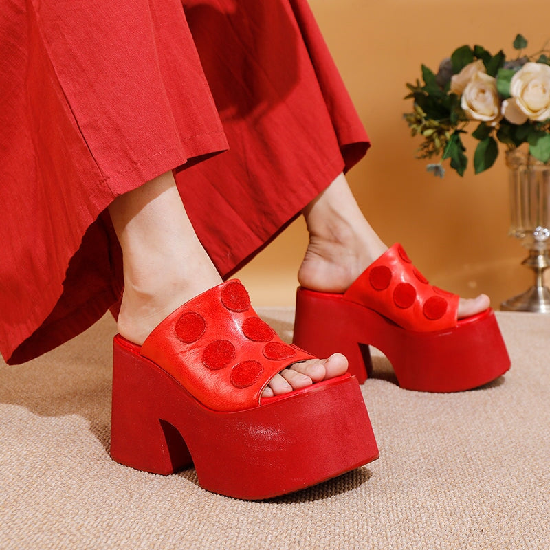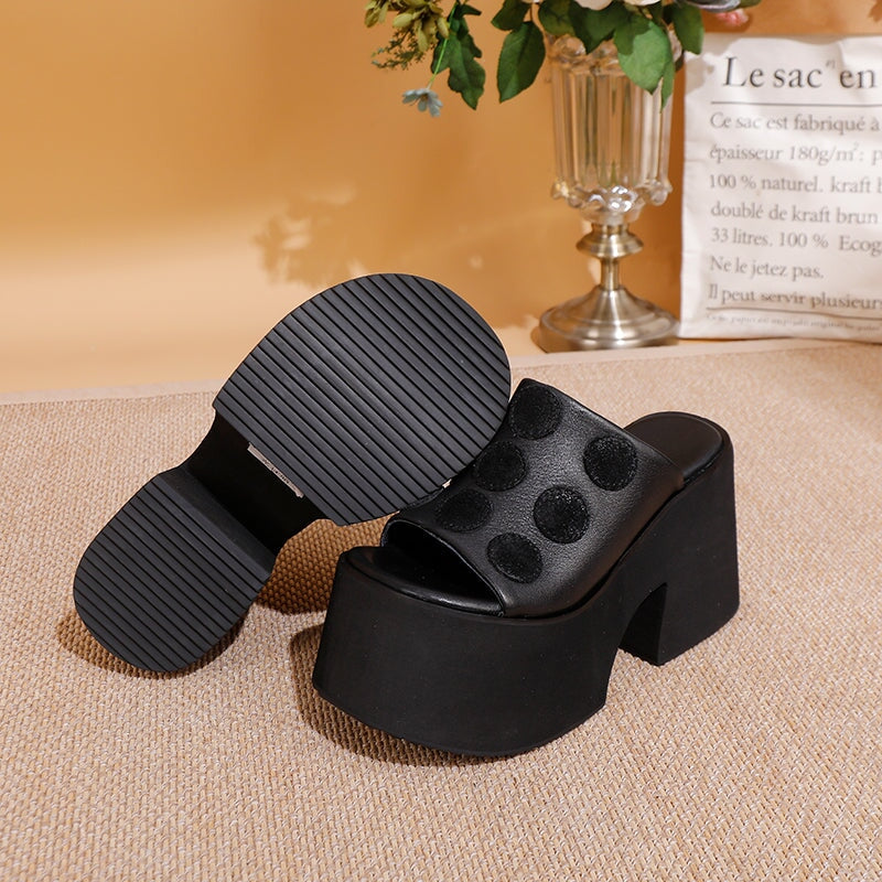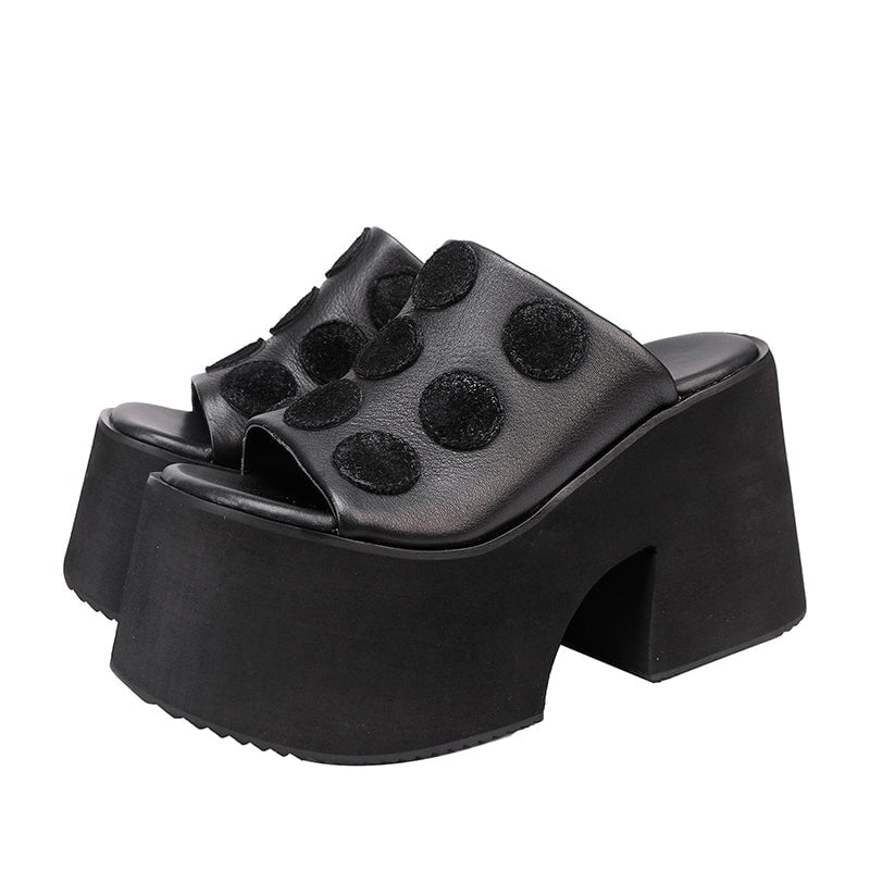 Elevate your look—literally and stylishly—with these bold platform slippers. Featuring a 110mm chunky block heel and playful polka dot design on premium full-grain leather, these open-toe slip-ons are a statement piece for confident fashion lovers. The ultra-light EVA foam and rubber sole provide cushioning and durability, while the exaggerated sole delivers a dramatic height boost. Perfect for summer streetwear, retro flair, or adding an edgy twist to your wardrobe.
