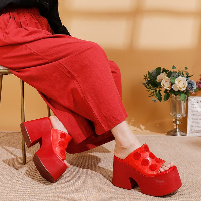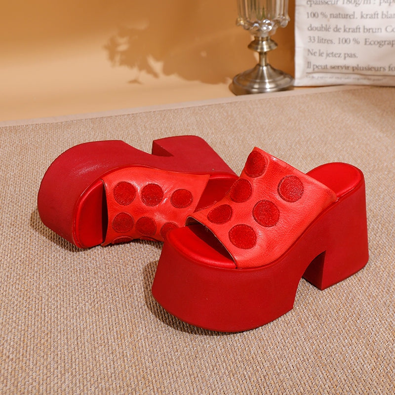 Chunky 110mm Platform Open-Toe Leather Slippers with Polka Dot Design in Black/Red
