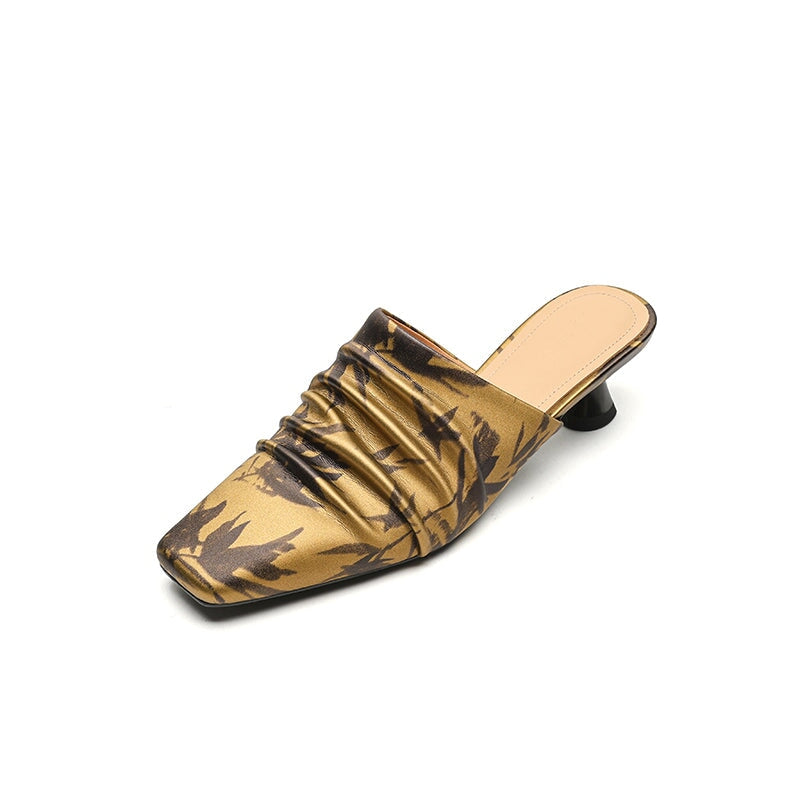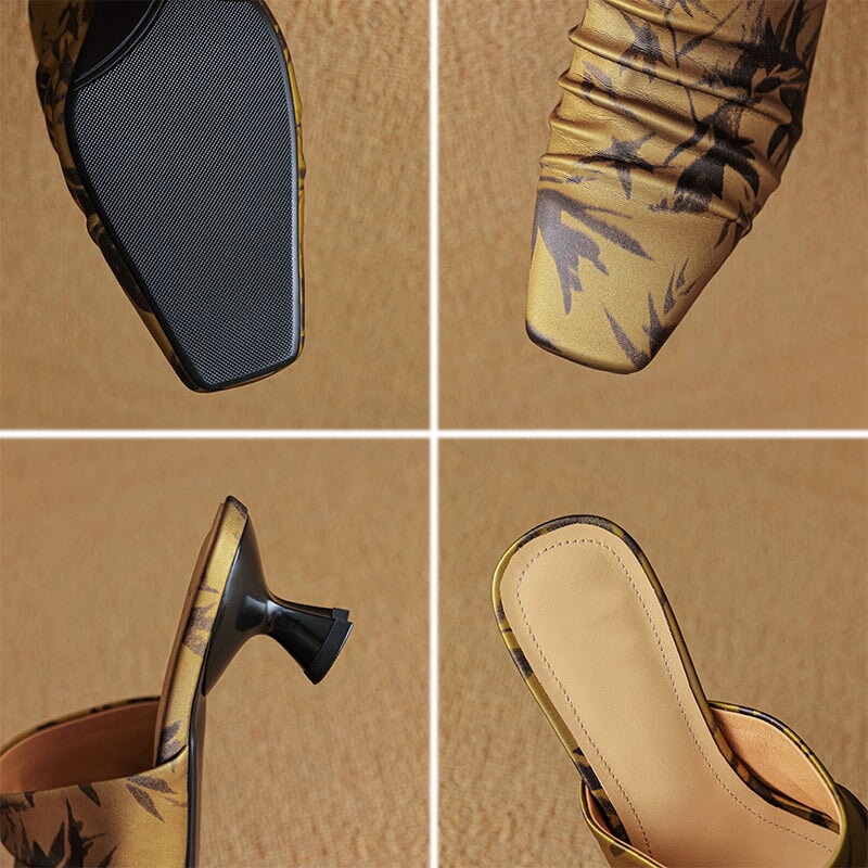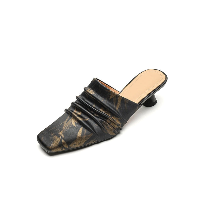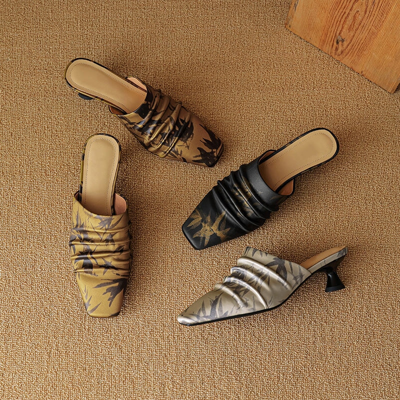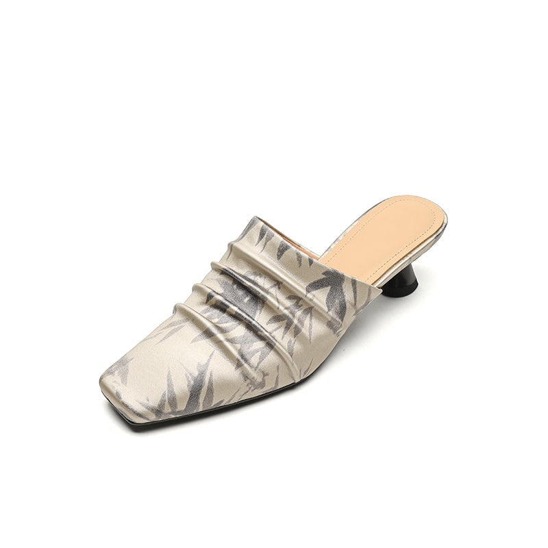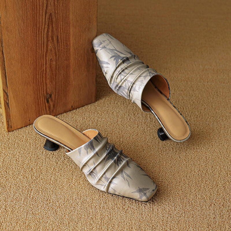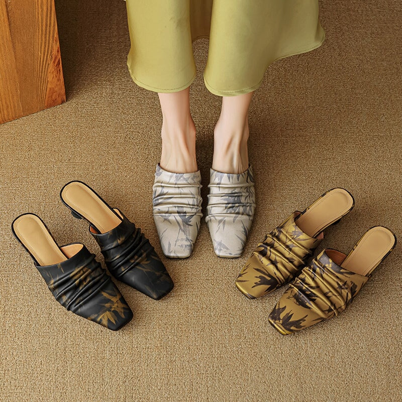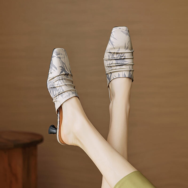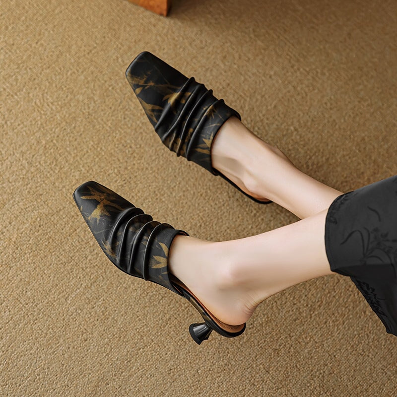Embrace timeless elegance with these vintage Chinese-style mules featuring delicate pleated folds and traditional printed patterns. Crafted from premium cowhide leather, these slippers boast a chic square toe, soft rubber sole, and a comfortable 45mm kitten heel. The unique blend of cultural heritage and modern fashion makes them perfect for both casual and dressy occasions.