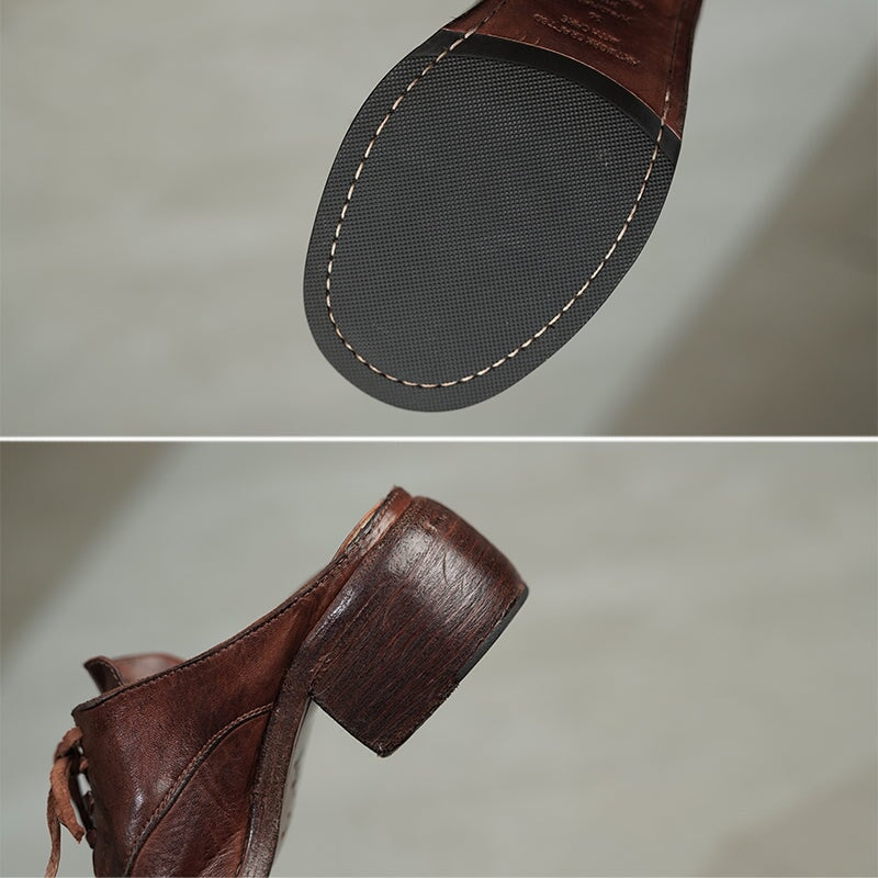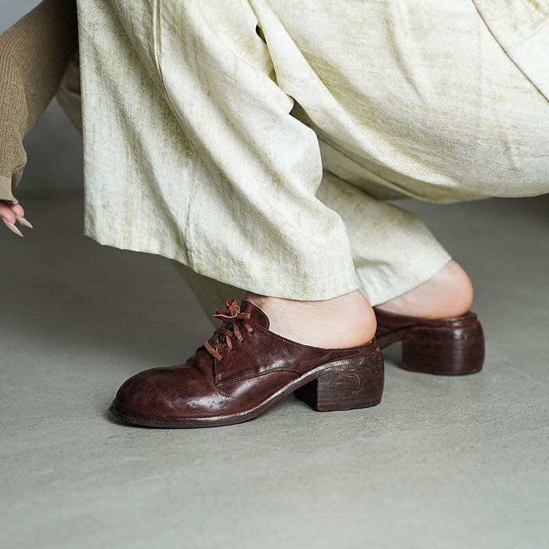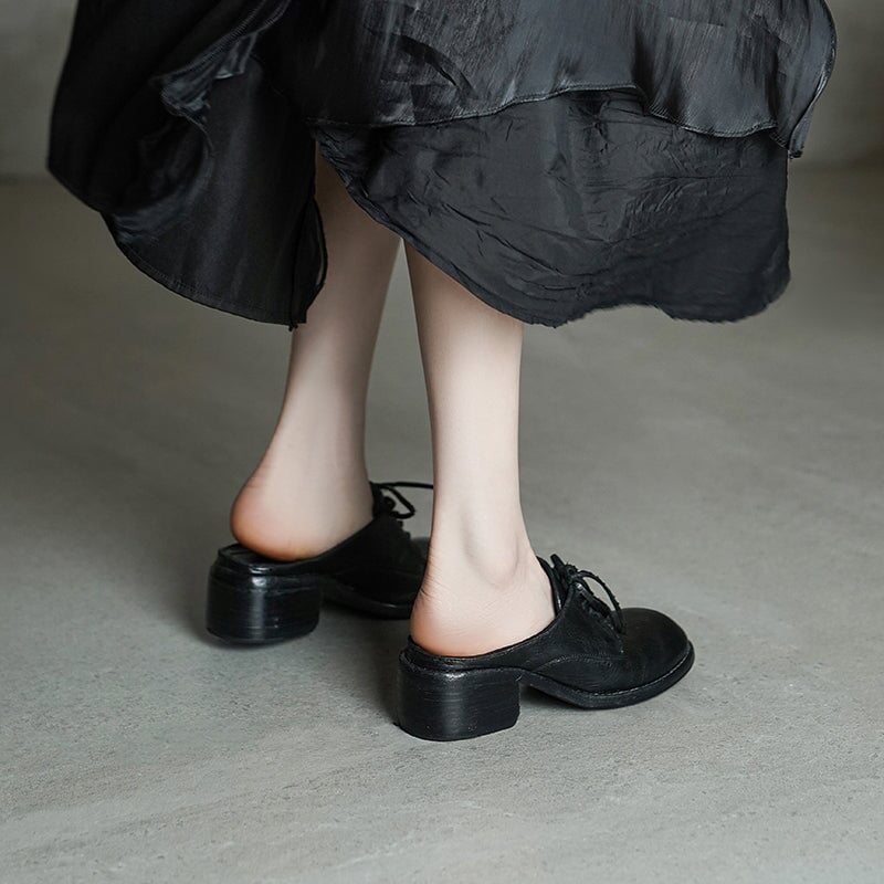 Step into effortless retro charm with these vintage-inspired mule slippers crafted from washed horse leather. Featuring a closed round toe, deep vamp, and classic lace-up design, they blend British oxford style with easy slip-on comfort. The sturdy block heel adds a touch of height while maintaining stability, and the rubber sole ensures durability and grip. Perfect for adding character to your everyday or casual outfits.