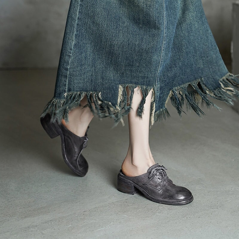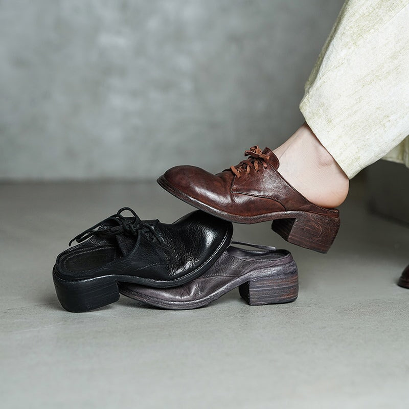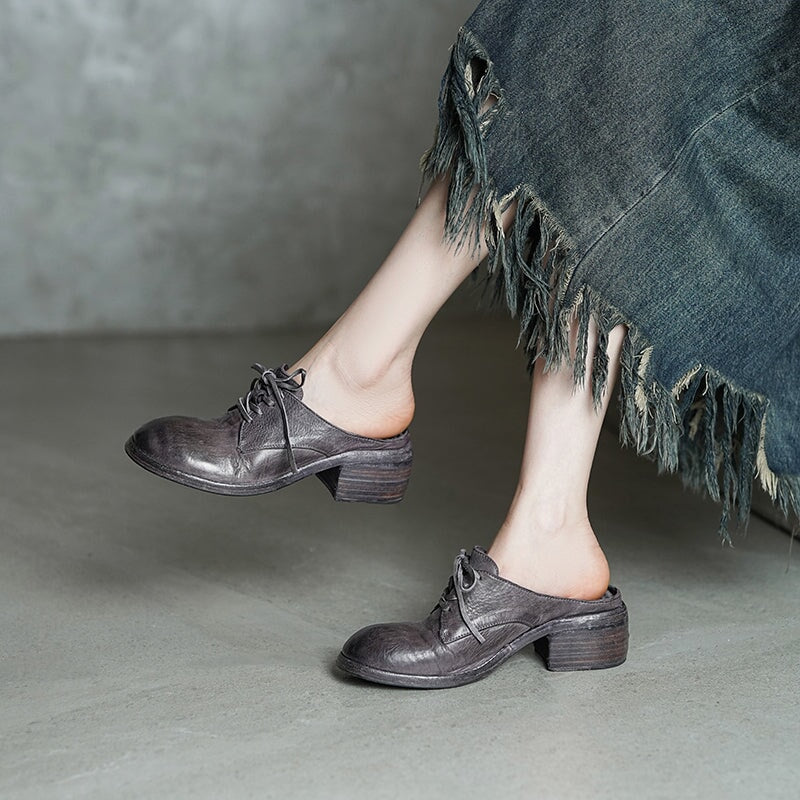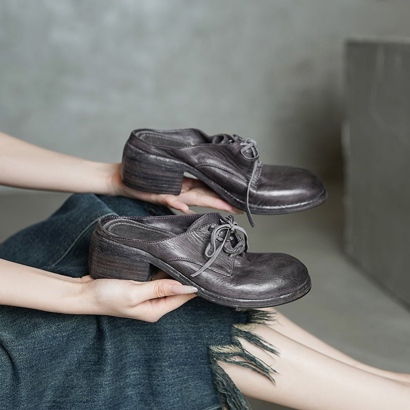 Vintage Washed Horse Leather Lace-Up Mules for Women Block Heel Closed-Toe Slippers in Black/Grey/Red Brown