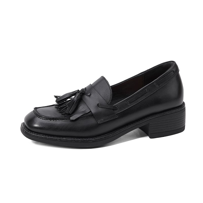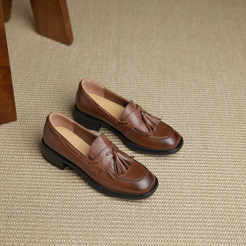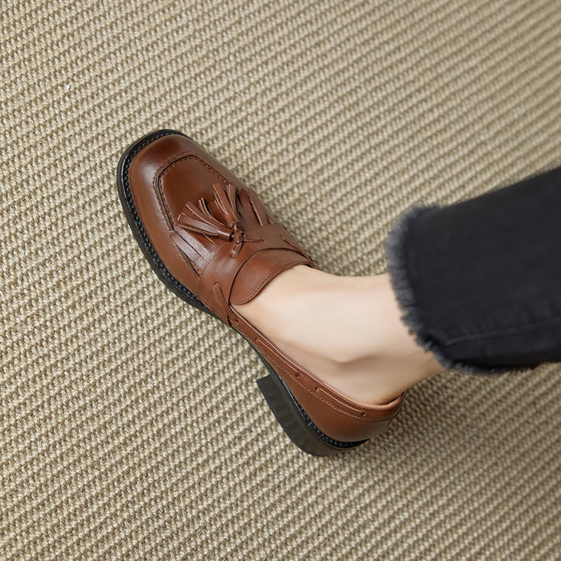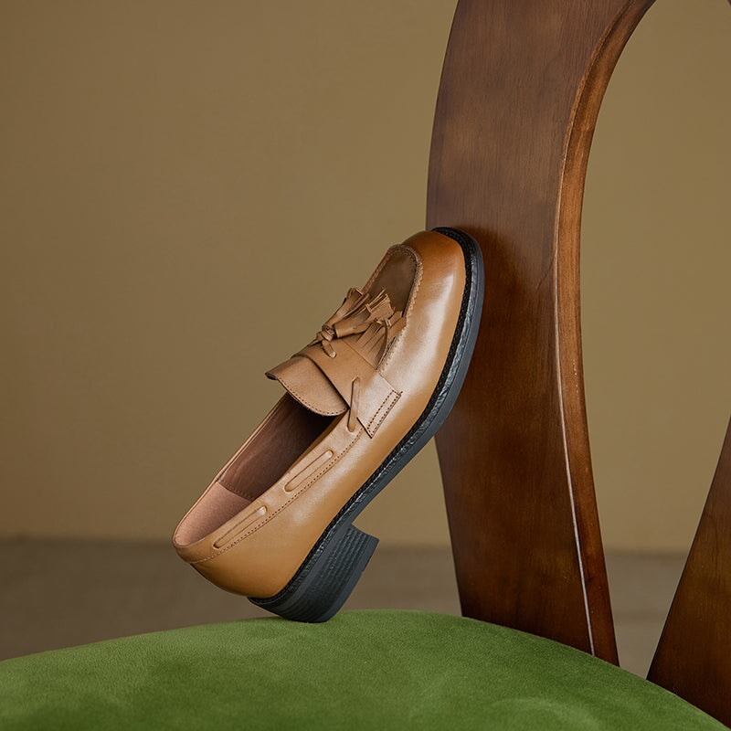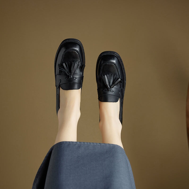 These Handmade Round Toe Tassel Loafers blend classic British style with everyday comfort. Crafted from top-layer washed cowhide + genuine leather, they feature a soft vintage finish and a traditional kiltie tassel design that adds movement and charm. The sturdy block heel and durable rubber outsole provide stability and long-lasting wear, making them ideal for commuting, casual outfits, or retro-inspired looks. Designed like refined boat shoes with the elegance of vintage loafers, they deliver a timeless aesthetic suitable for all seasons.