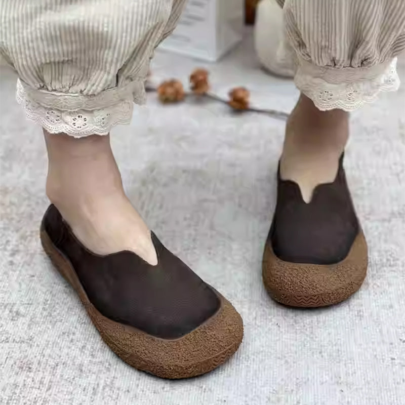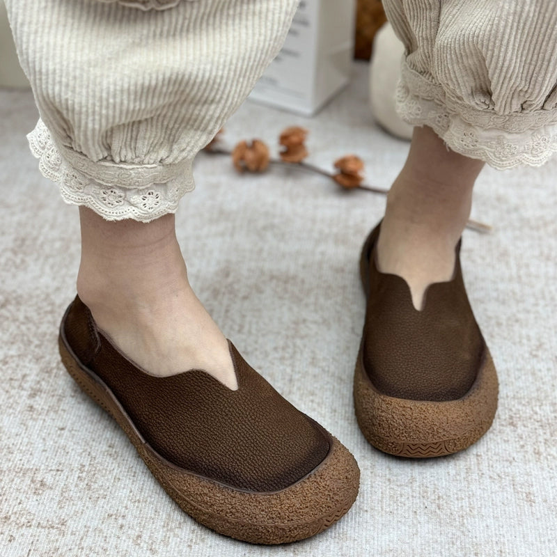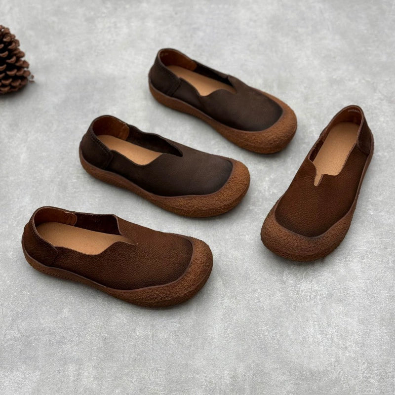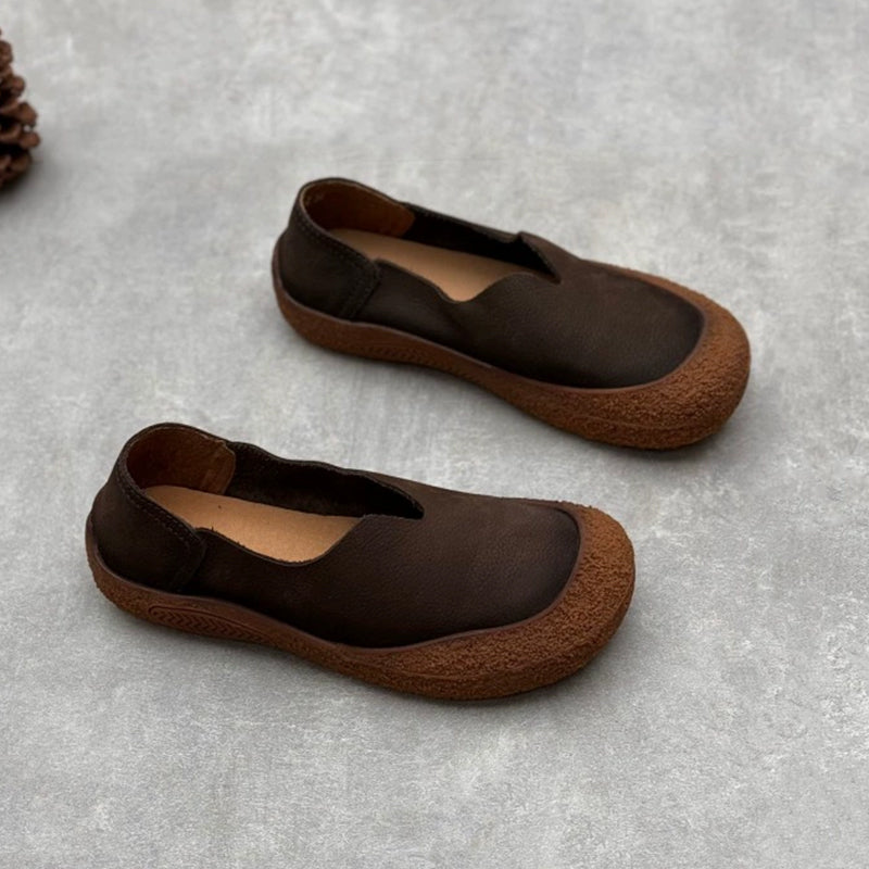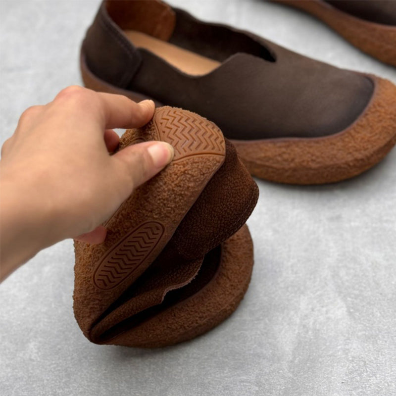 Enjoy all-day comfort with these women’s vintage-style barefoot loafers, crafted from soft nubuck cow leather for a naturally flexible feel. Designed with a classic round toe and a lightweight flat profile, they let your feet move freely while maintaining a stylish look. The slip-on design makes them easy to wear, and the flexible rubber sole offers soft, barefoot-like comfort for casual daily outfits. Perfect for relaxed walks, commuting, or pairing with laid-back vintage looks.