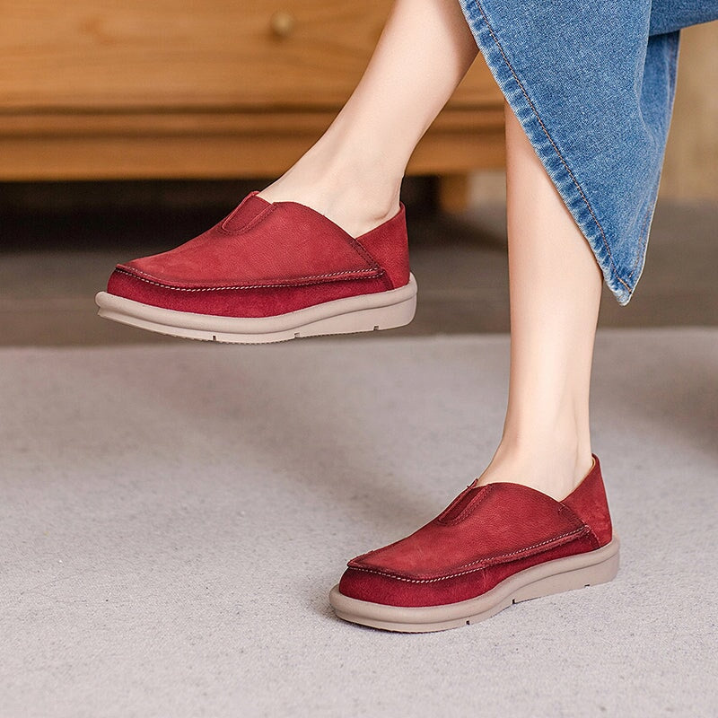 Vintage Barefoot Leather Loafers Women’s Slip-On Casual Flats with Elastic Instep in Earthy Yellow/Red/Beige