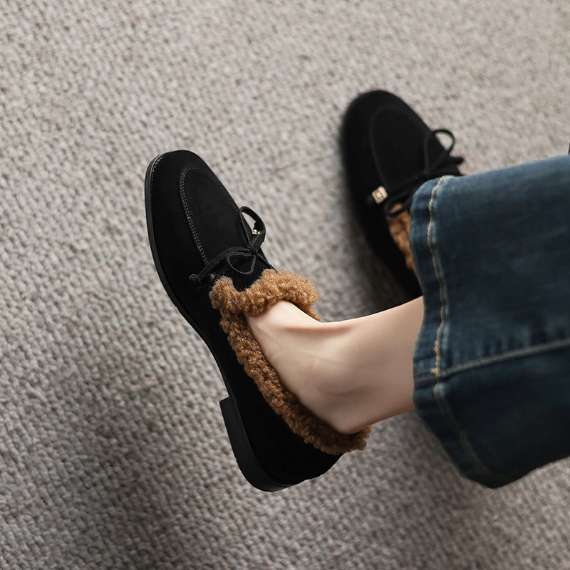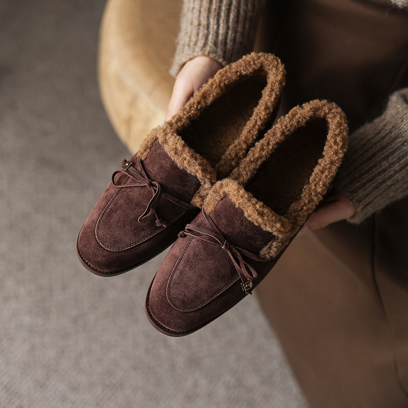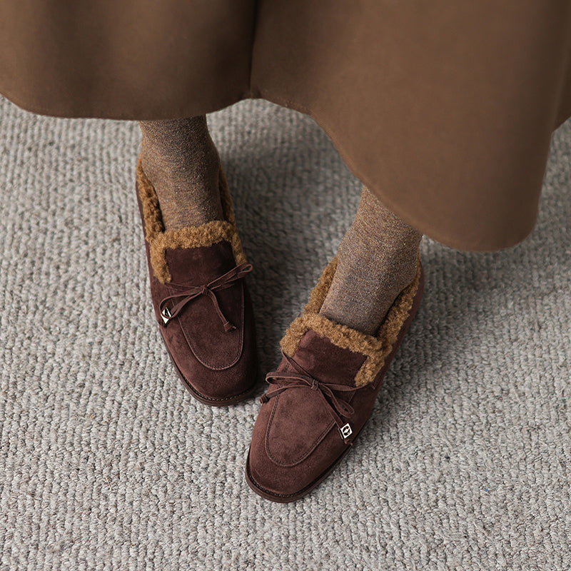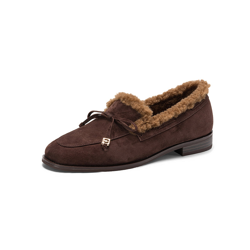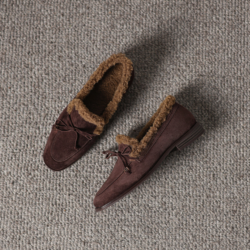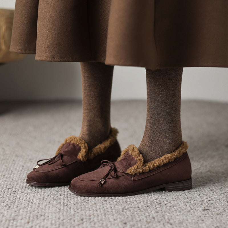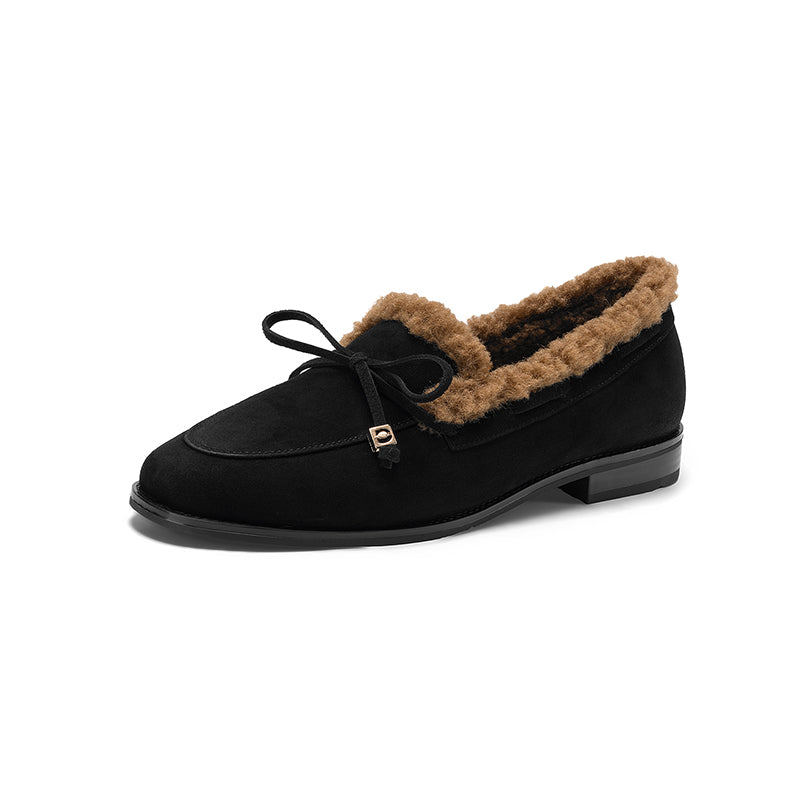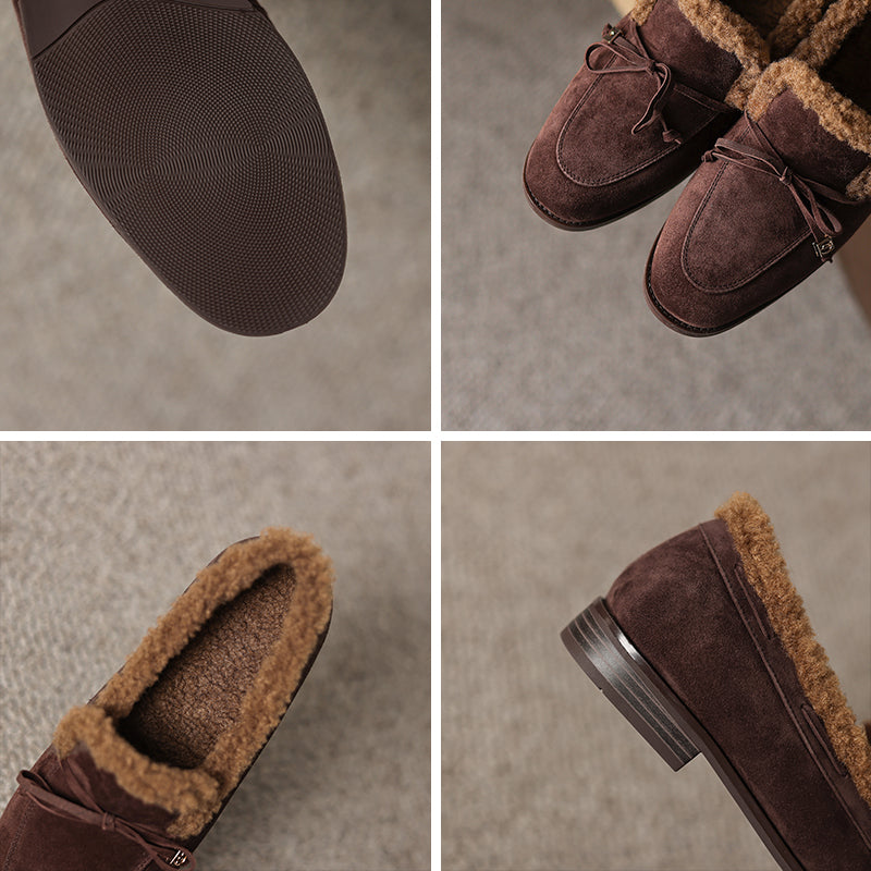 These women’s round toe loafers feature a cozy shaggy and a charming bow tie detail for an effortlessly warm, relaxed look. Crafted from top-layer suede leather, they feel soft yet durable, perfect for everyday wear. The slip-on design makes them easy to wear, while the low block heel adds subtle lift without sacrificing comfort. Finished with a rubber outsole for grip and stability, and lined with a faux fleece interior and insole, these loafers deliver all-day warmth, comfort, and understated style—ideal for casual winter outfits.