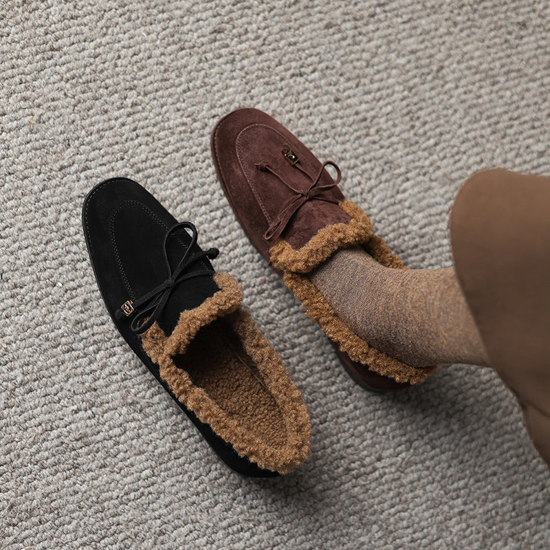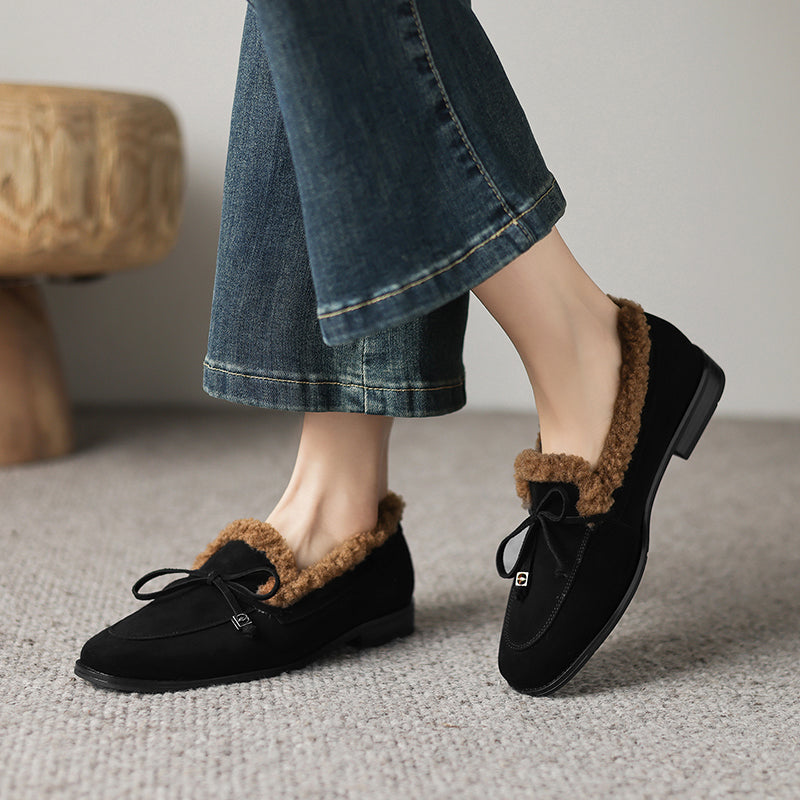 Vintage Bow Tie Suede Leather Shaggy Loafers Slip-On Casual Flats in Black/Brown
