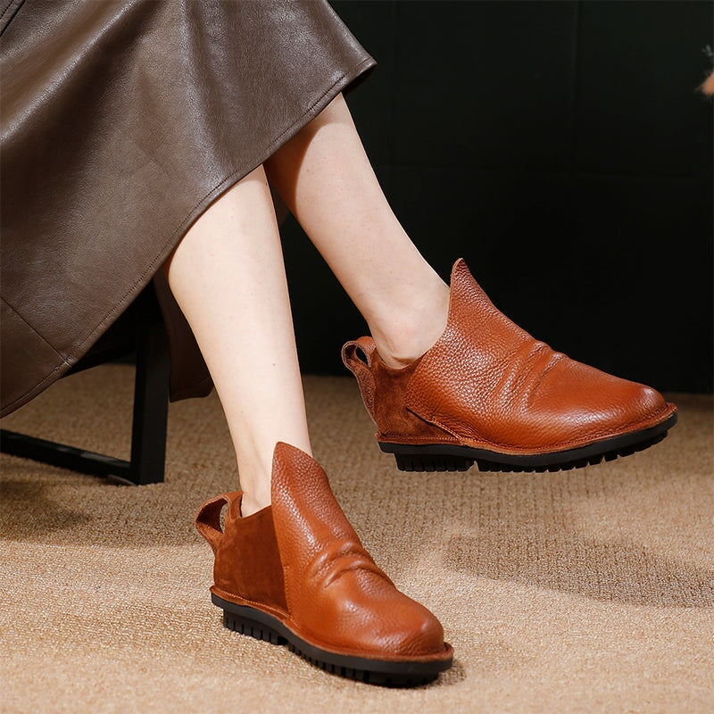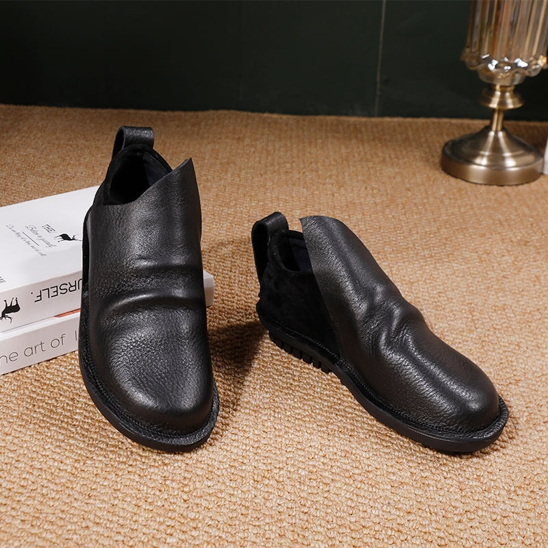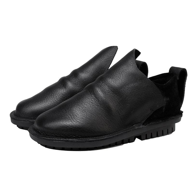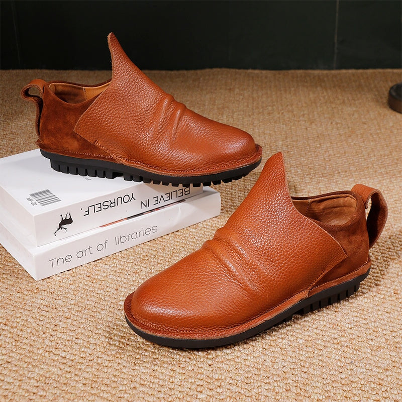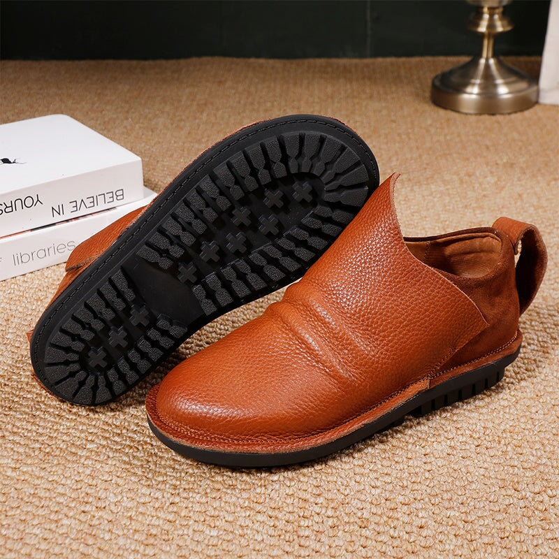 Crafted from premium top-grain cowhide leather, these handmade slip-on loafers offer timeless retro style and everyday comfort. Designed with a round toe and integrated rubber-wrapped sole, they provide durability and a soft, flexible feel. The elastic collar design ensures an easy, snug fit, while the flat sole delivers stable support for all-day wear. Perfect as casual walking shoes, these loafers combine effortless style with practical comfort ideal for daily outfits and relaxed occasions.