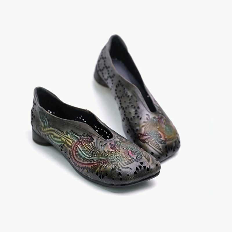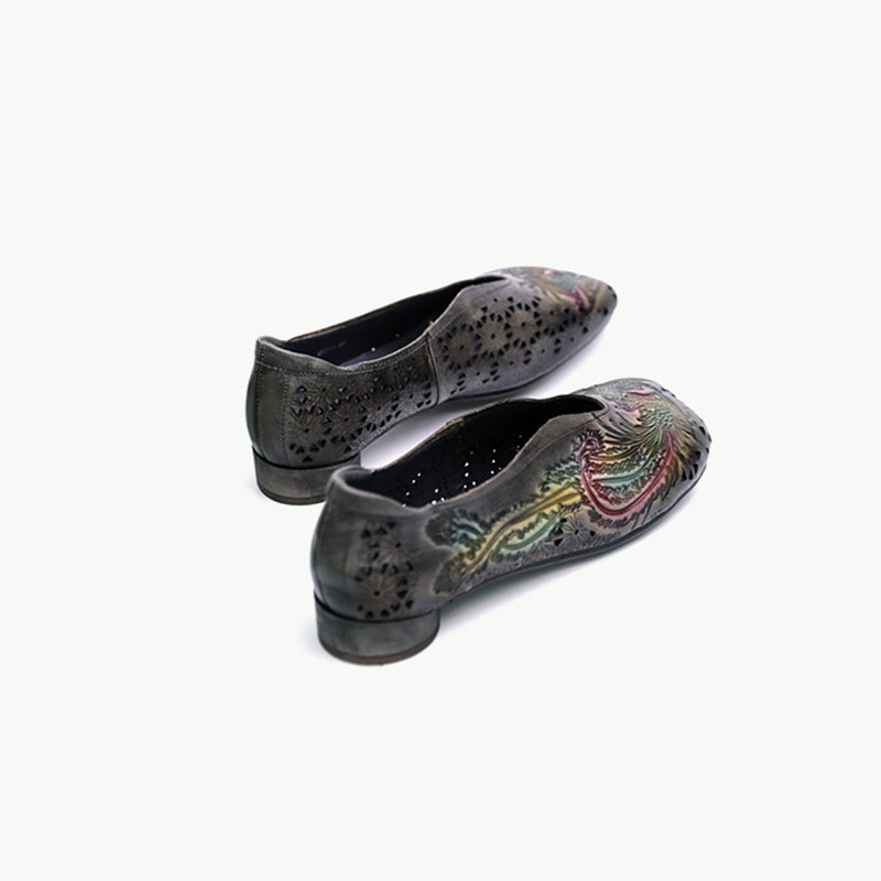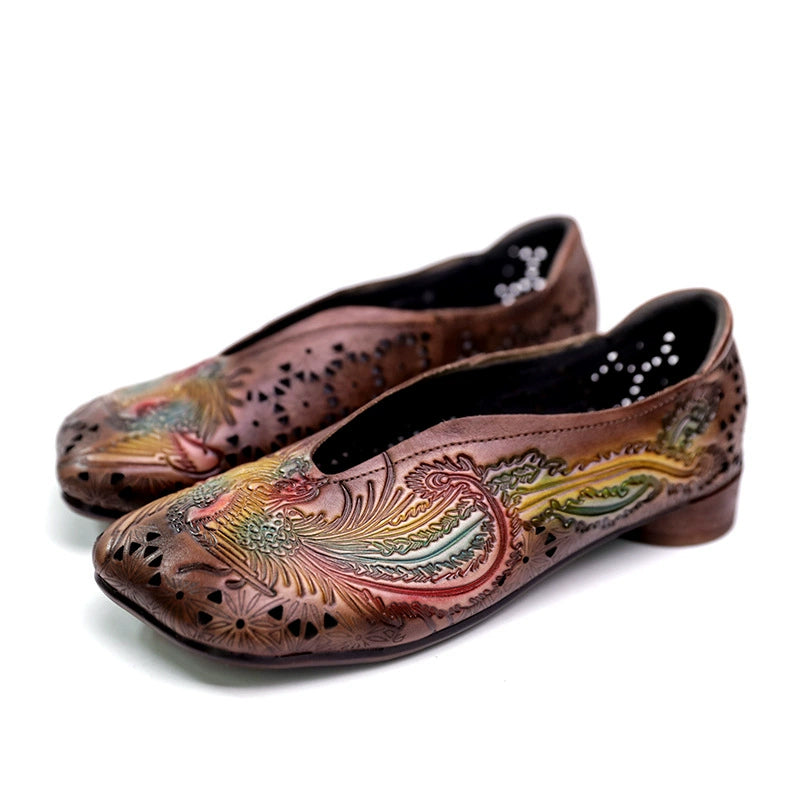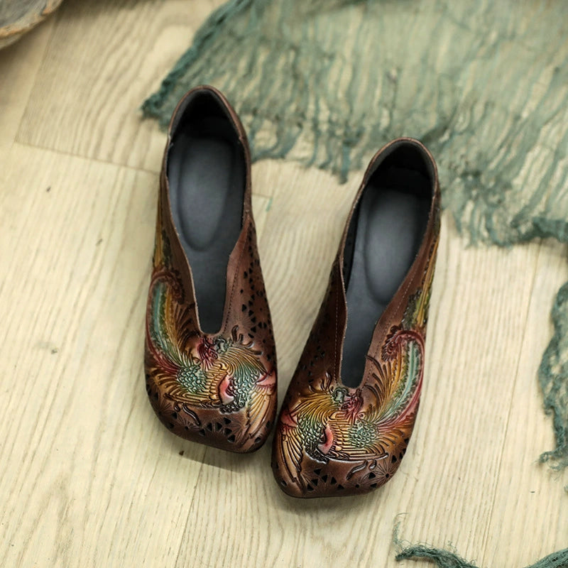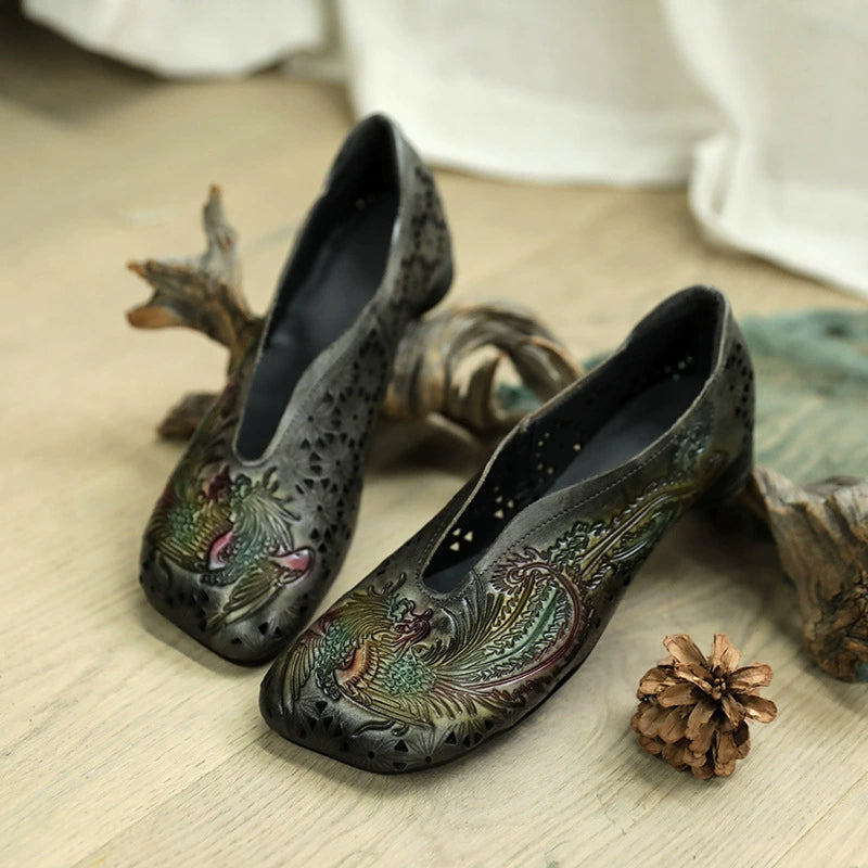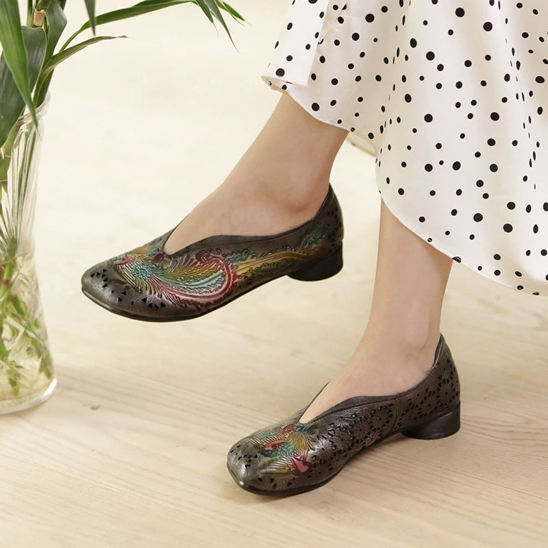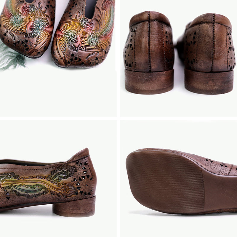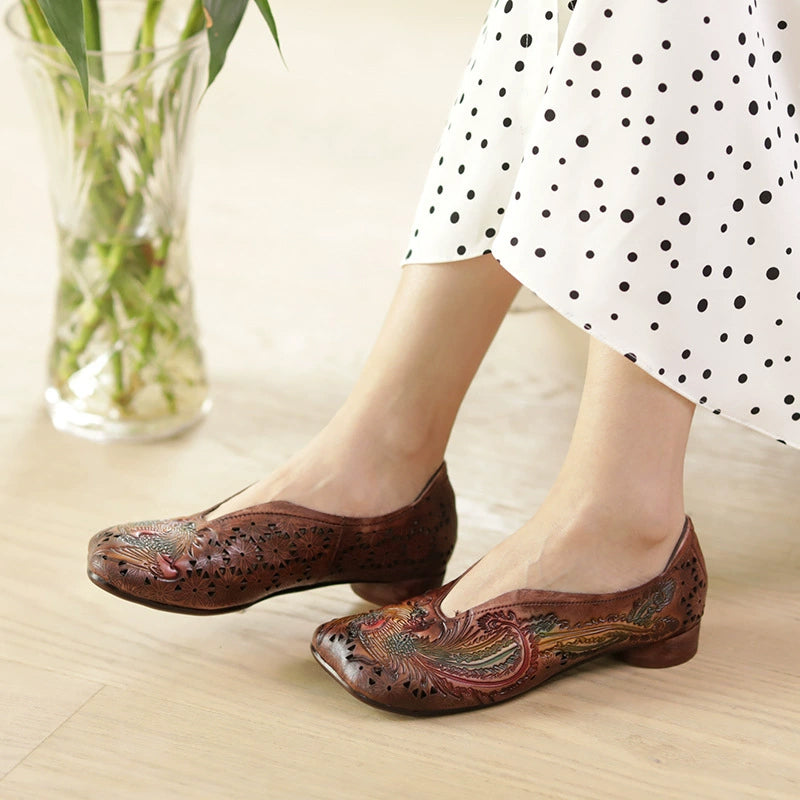These vintage-inspired slip-on loafers showcase an exquisite phoenix embossed design with delicate cutout detailing, symbolizing elegance and timeless artistry. Crafted from premium top-layer cow leather, they feature a modern square toe and a subtle cylinder heel that adds comfort without sacrificing style. The breathable hollow-out construction and soft leather interior make them perfect for all-day wear. Blending traditional craftsmanship with retro aesthetics, these handmade loafers are ideal for casual, artistic, and vintage-inspired outfits.