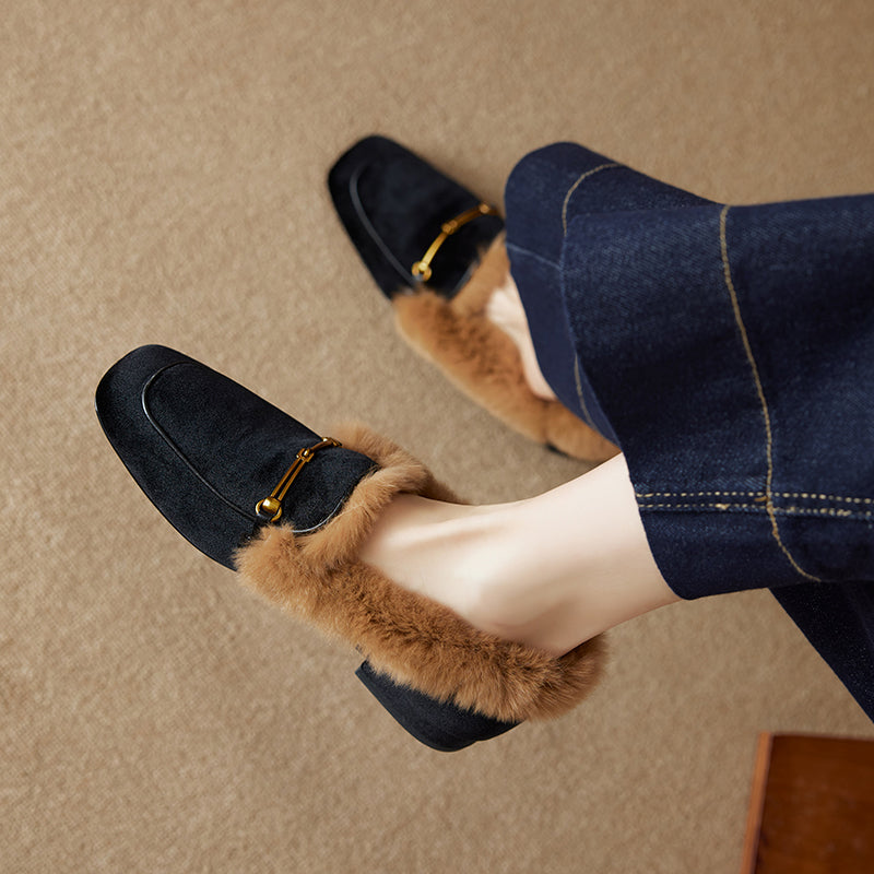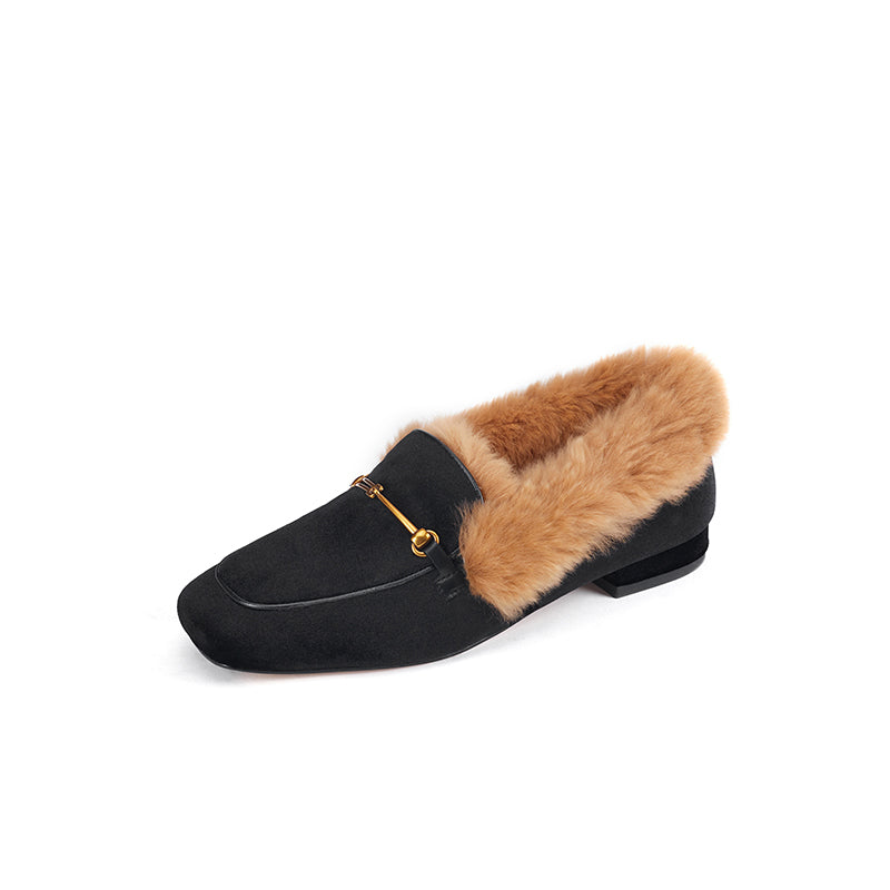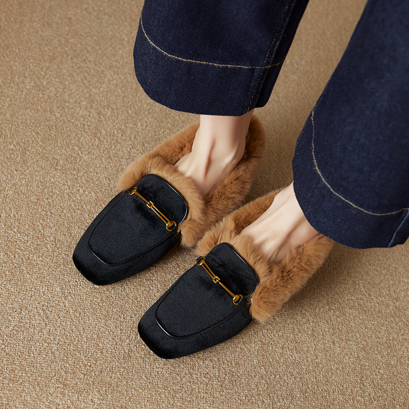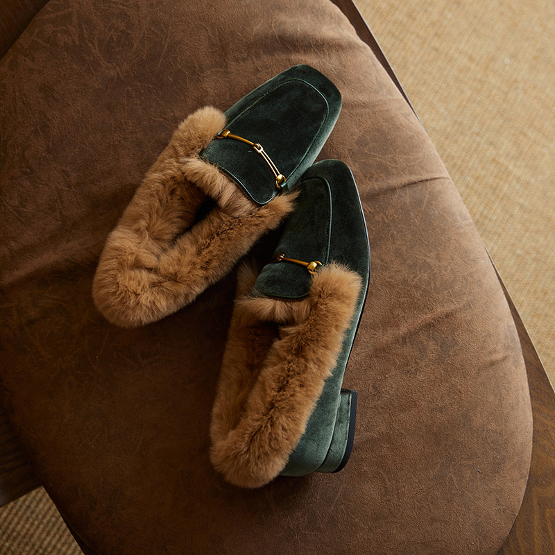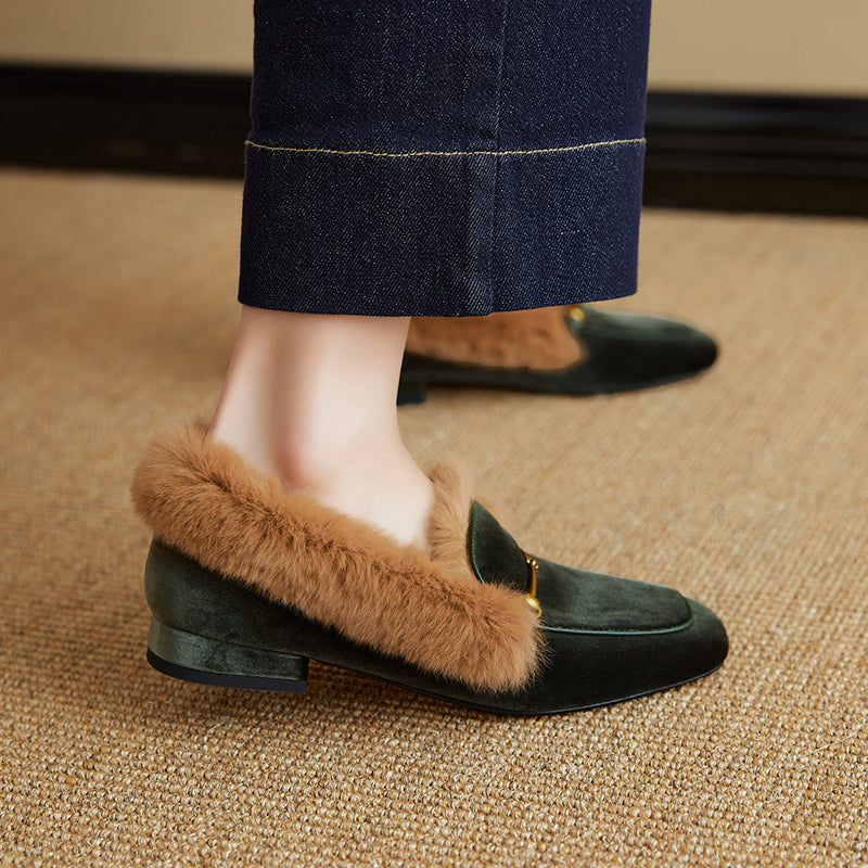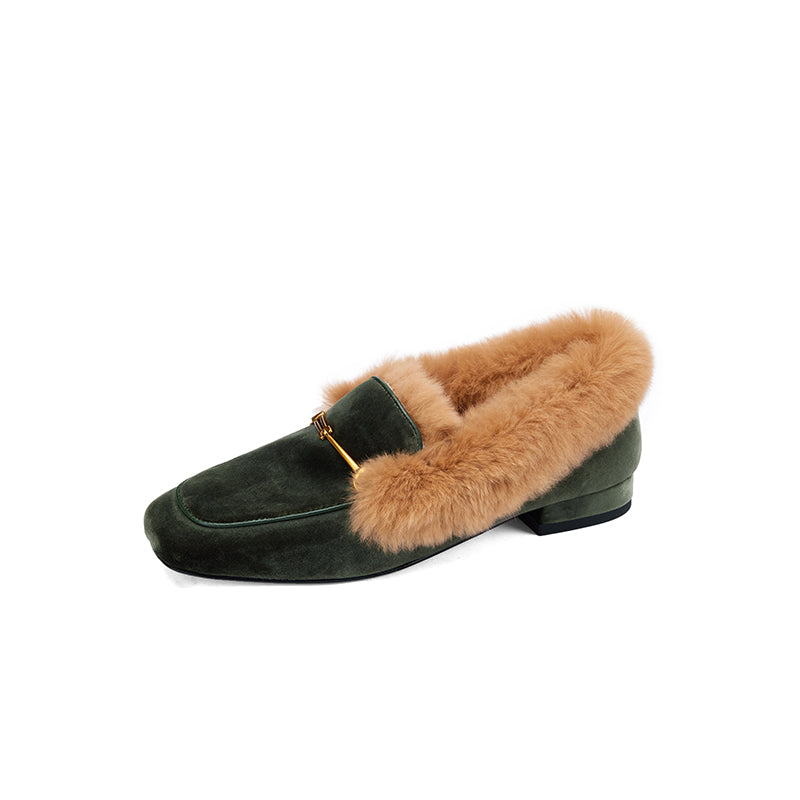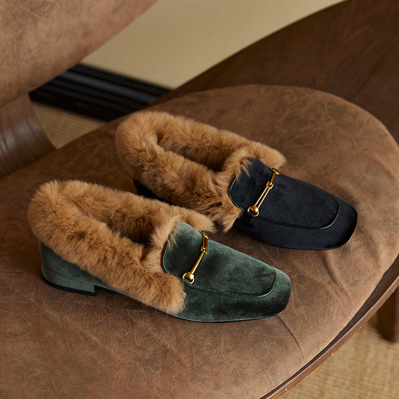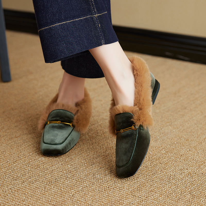 Winter Square Toe Shaggy Velvet Loafers with Horsebit in Black/Green