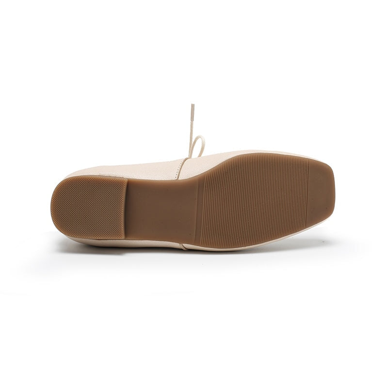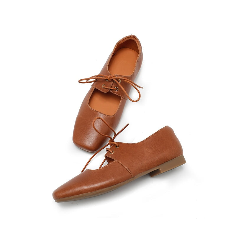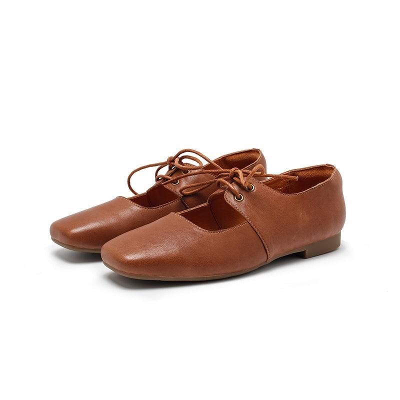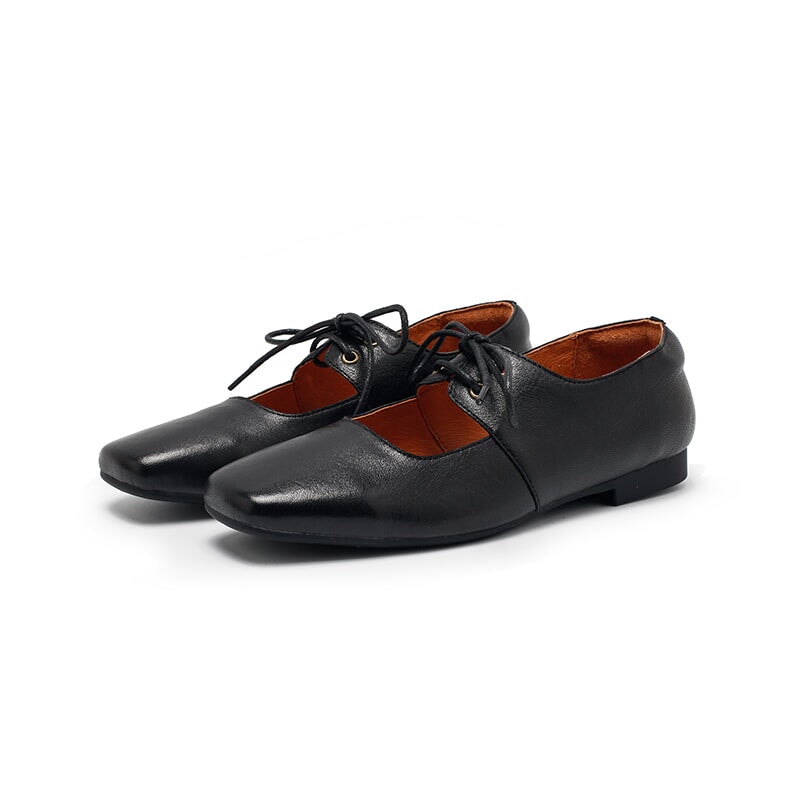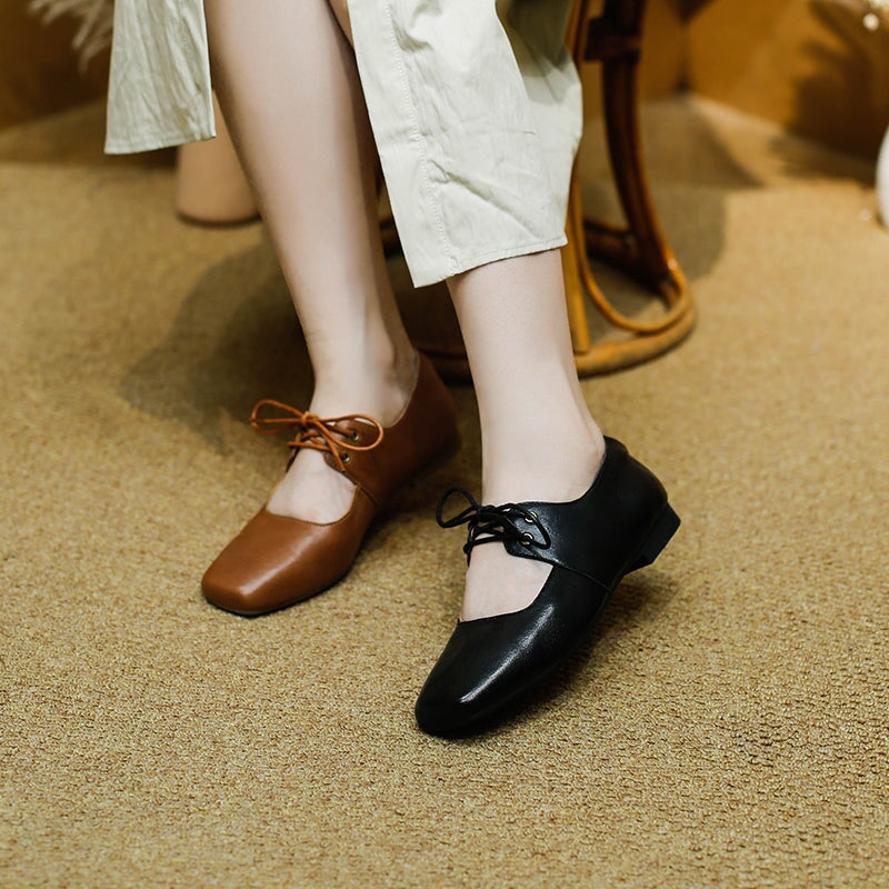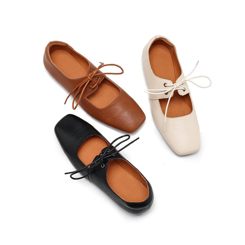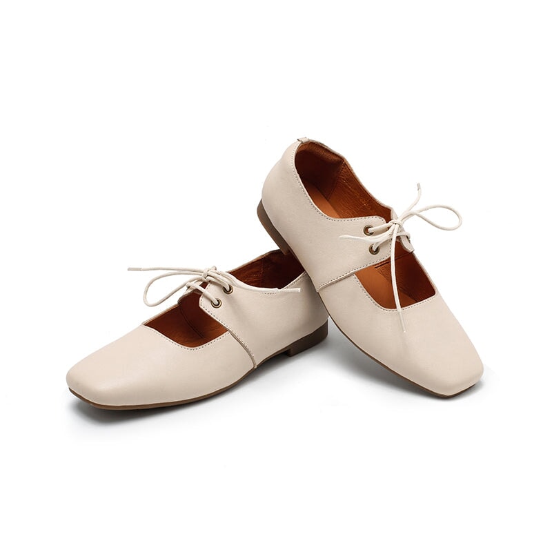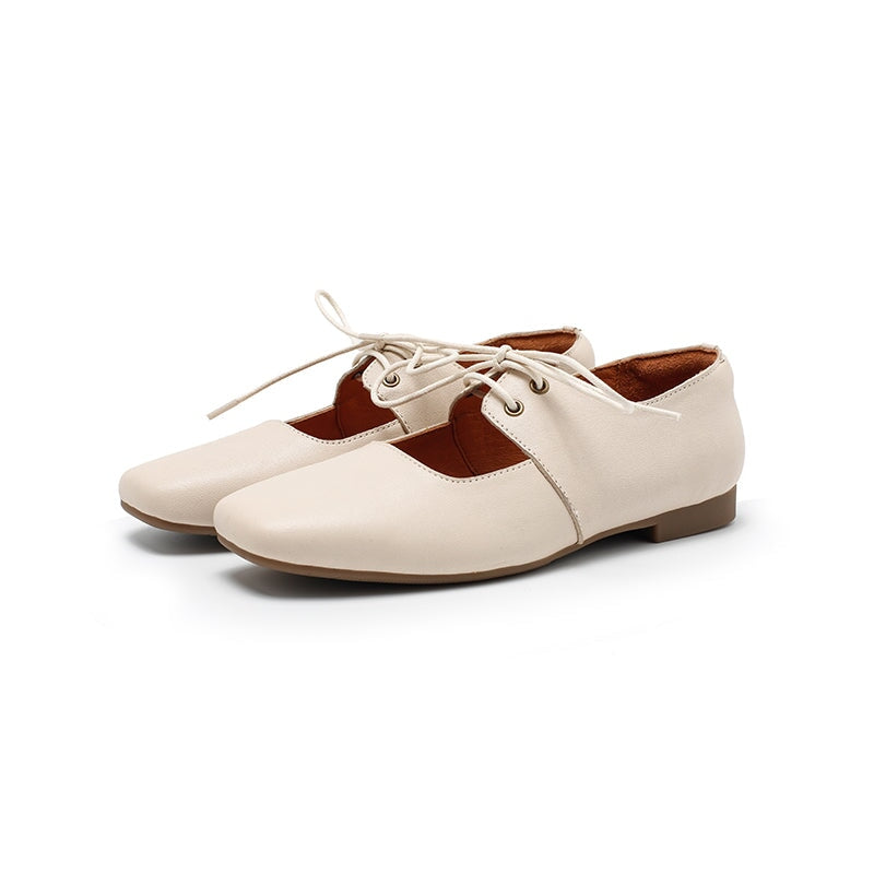 Dwarves Handmade Vegetable-Tanned Sheepskin Leather Lace-Up Mary Jane Flats in Beige/Black/Brown