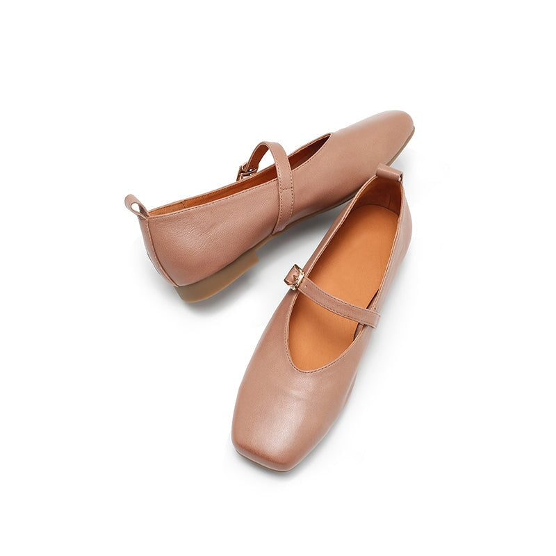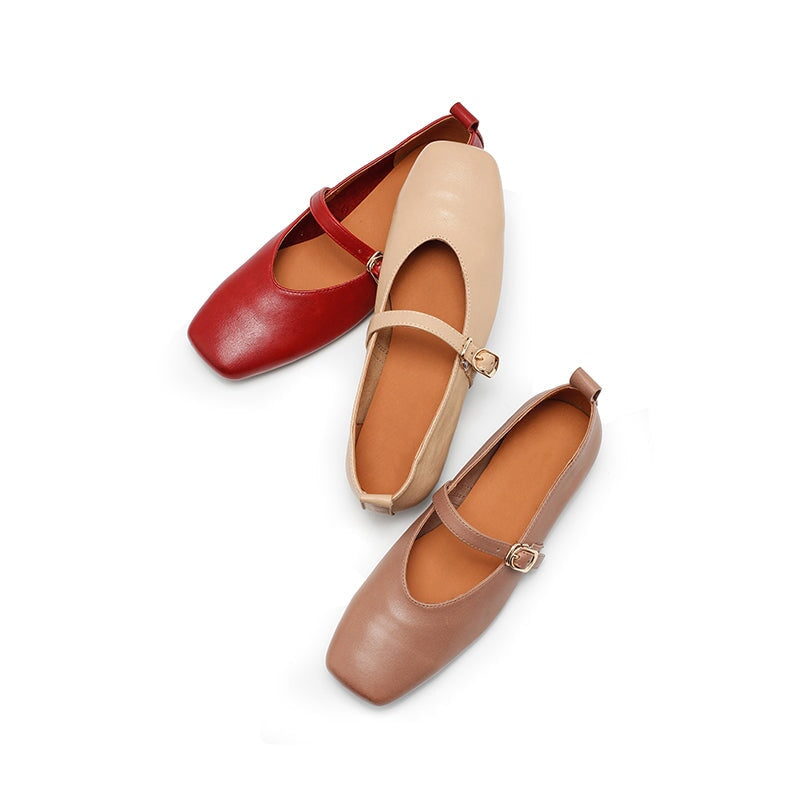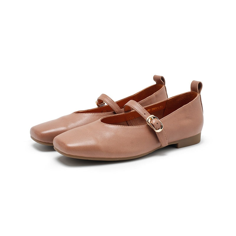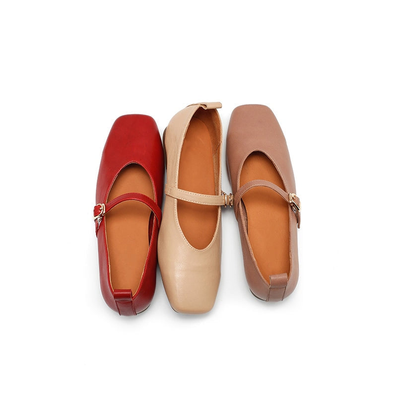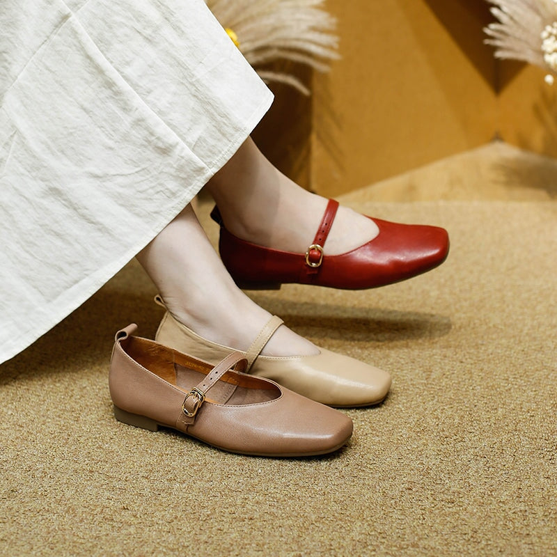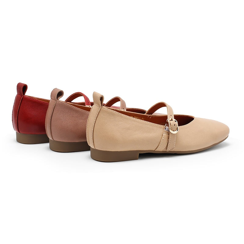 Dwarves Handmade Vegetable-Tanned Sheepskin Leather Mary Jane Flats in Cameo Brown/Apricot/Red